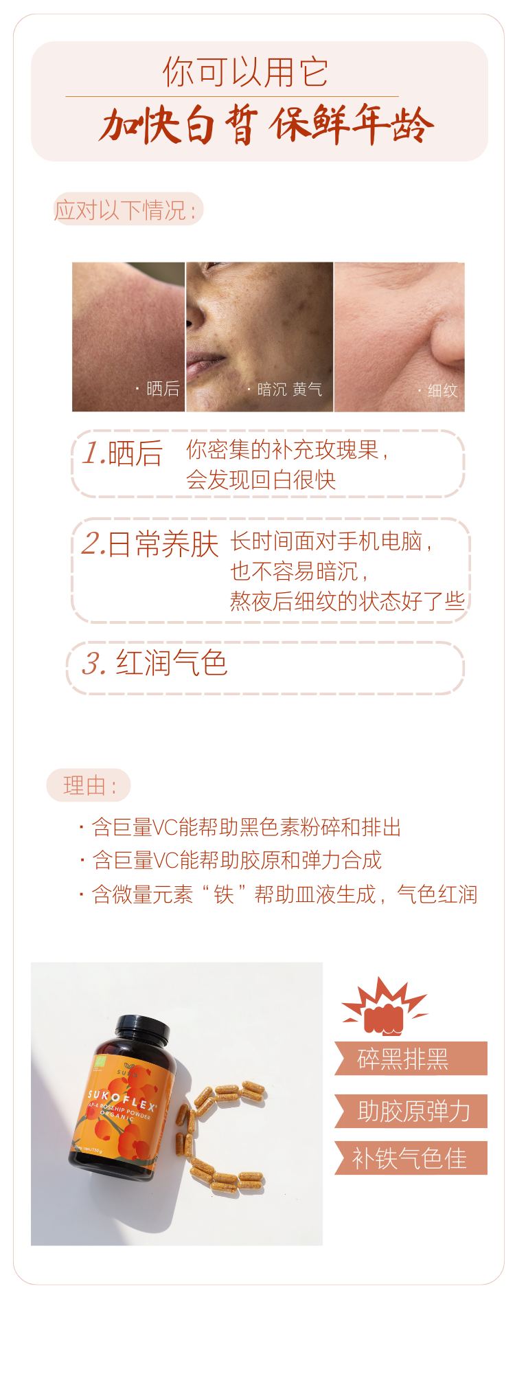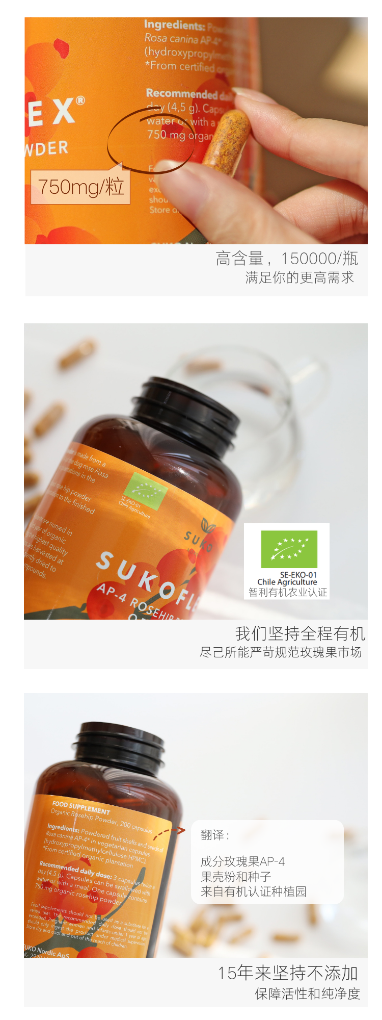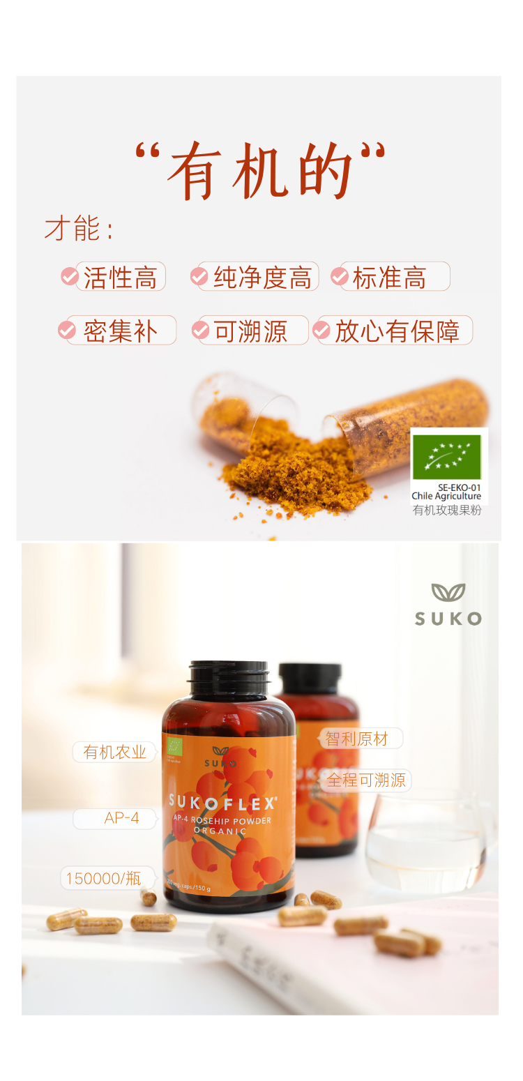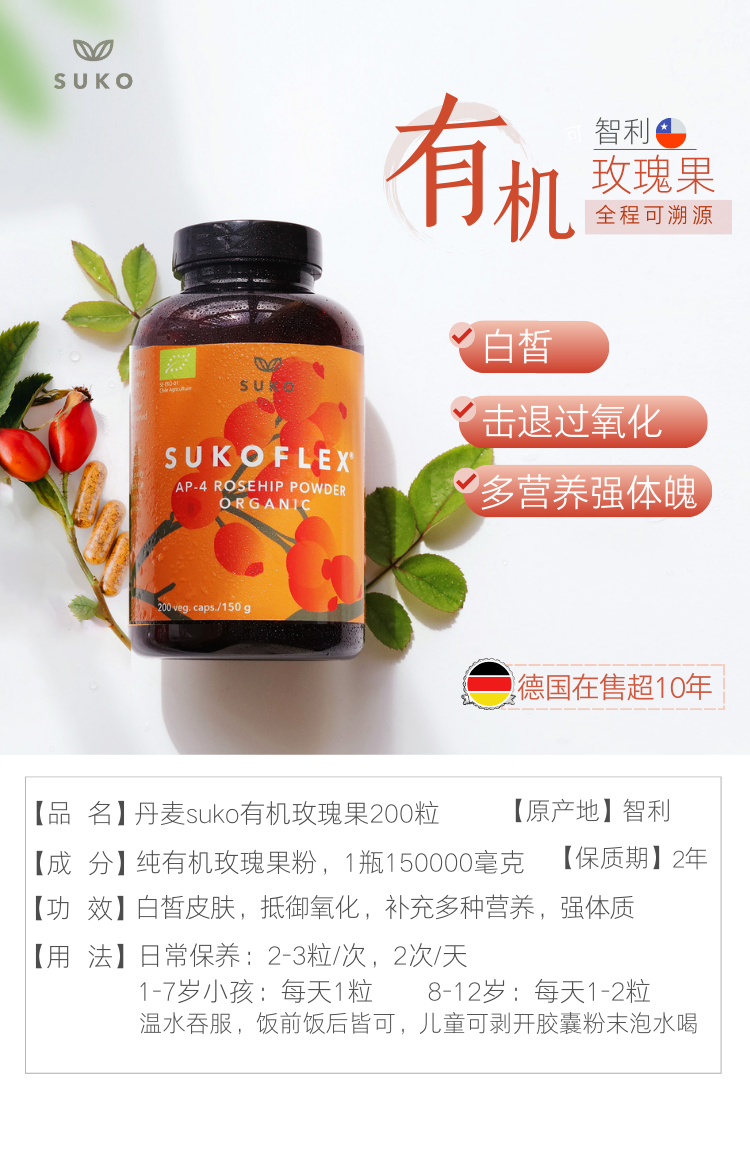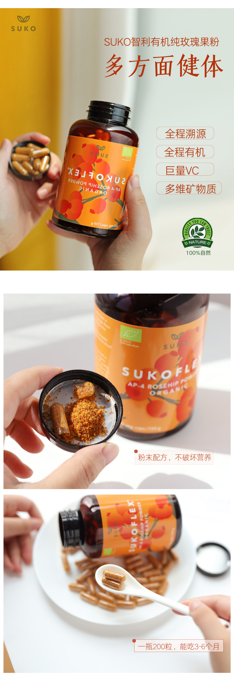 亢氧羙白亢炎!丹麦SUKO Nordic有机AP4玫瑰果200粒,高含量150000mg/瓶!来自有机认证种植园!含巨量VC提高兔疫力!1岁以上就能吃!日期27年3月
