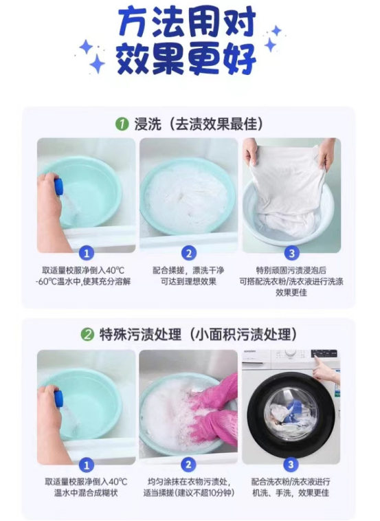 活性氧的活跃度和水温有关,当温度达到一定程度时,活性氧才可以发挥到最强效果 所以使用这款产品,建议结合衣物的材质特性,选择40-60度之间的水温,并适当延长浸泡时间哦