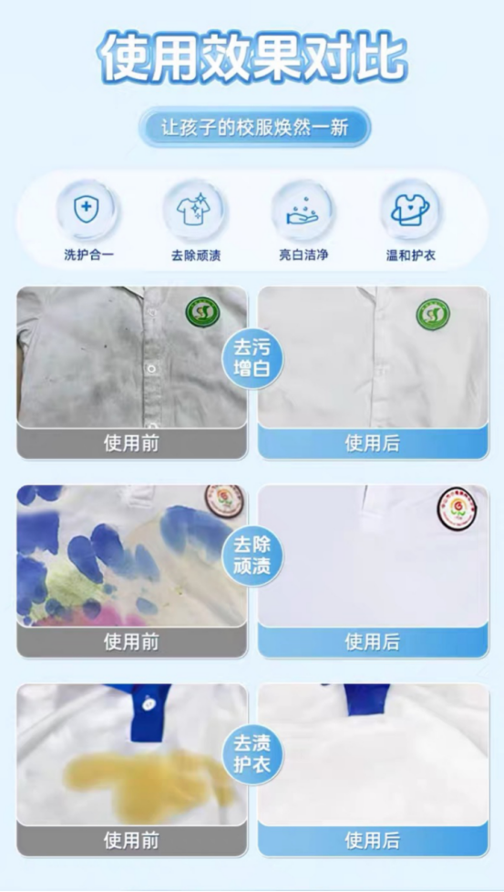 使用对比 简直就是去污黑科技“炸”掉顽固 拯救孩子的校服衣物!!! 绿色环保容易降解,泡一泡,搓一搓 校服上的墨渍、污迹等统统能搞定 它不仅仅针对校服😎😎😎 日常衣物对它来说都是小case✅