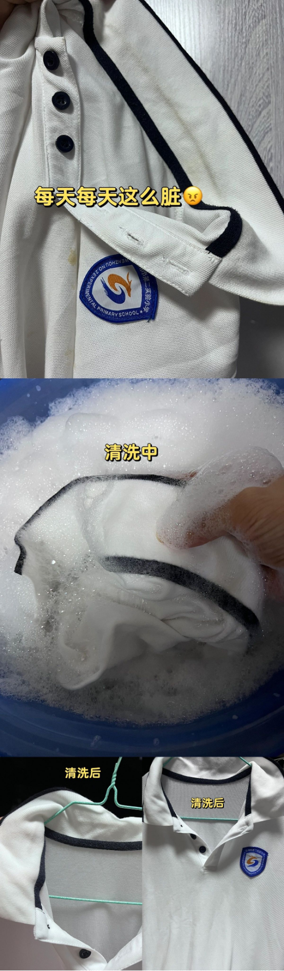 日常穿的校服最容易蹭到各种污渍,倒入校服净,浸泡几分钟后 轻松搓几下,污垢瞬间消失,过完水干干净净,普通洗衣粉可没有这个效果
