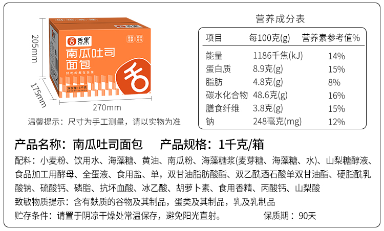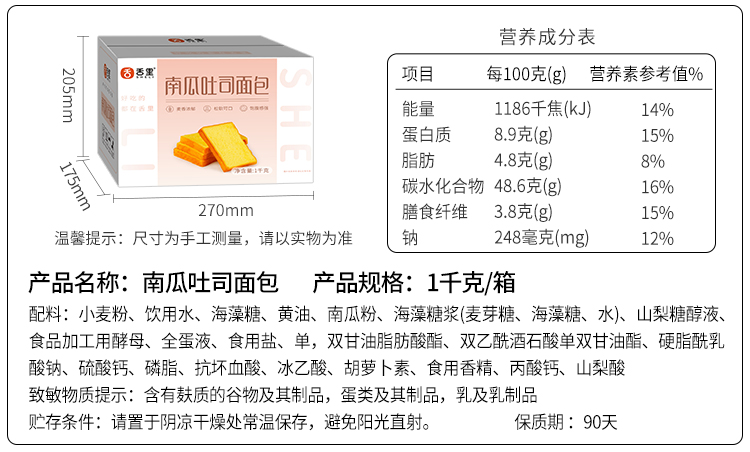 【积分兑换】南瓜吐司面包350g
