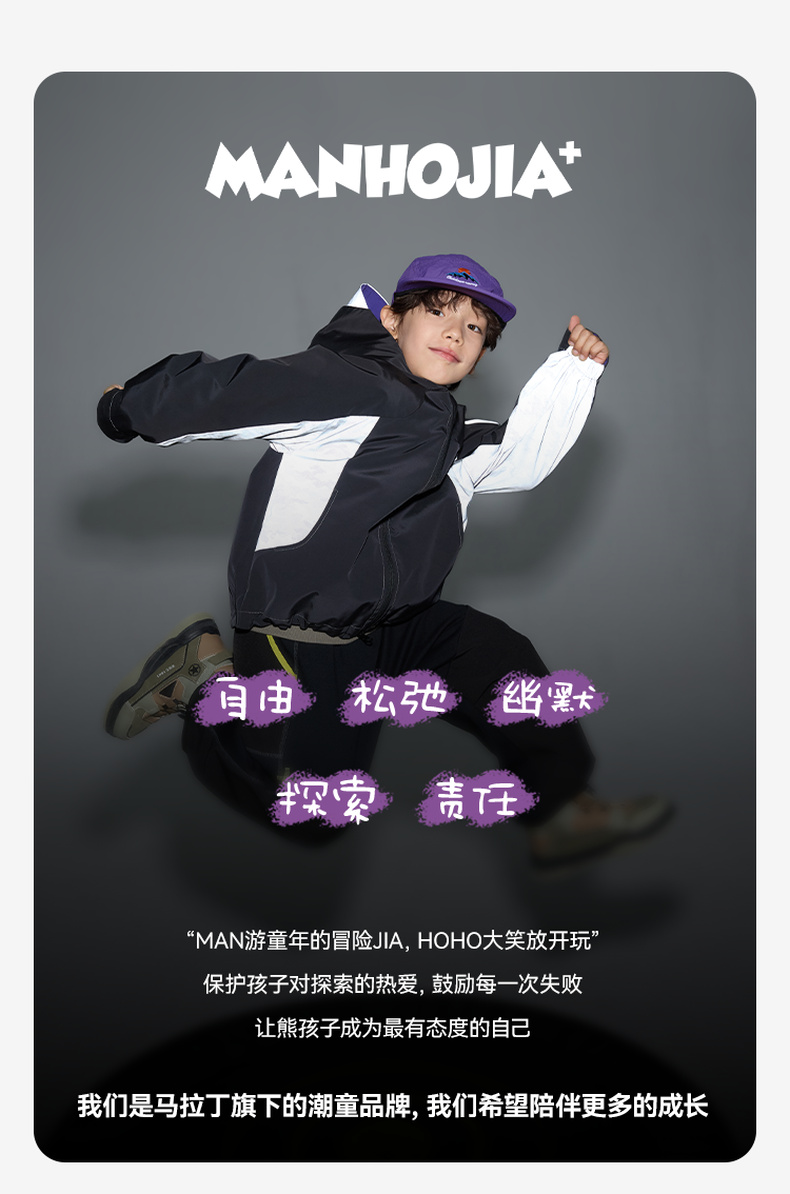 - 马拉丁旗下的城市户外潮童品牌,为3-12岁的孩子提供实用与细节设计的时尚度童装,打造现代简潮和城市户外感的着装,man游童年的冒险jia!