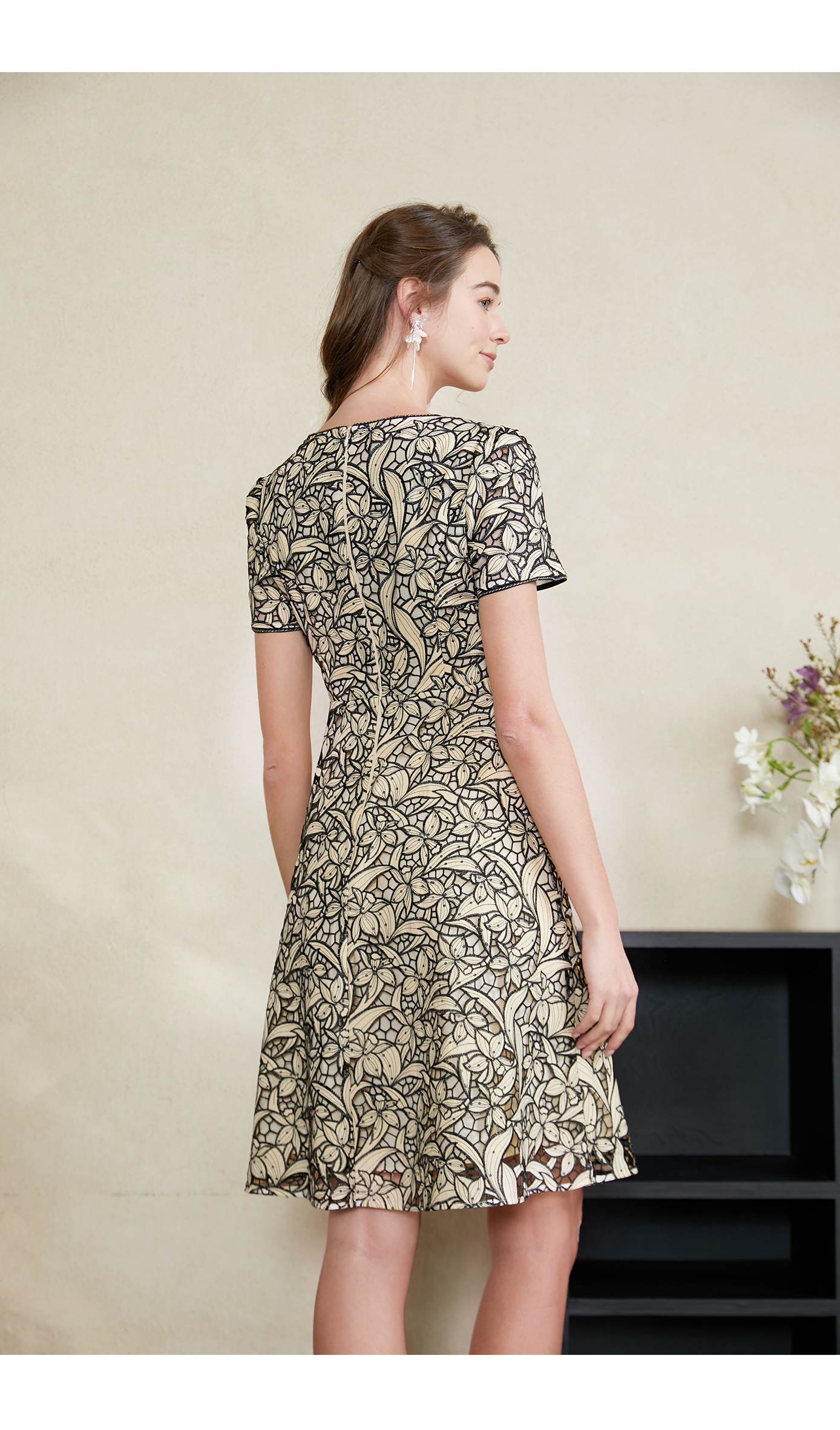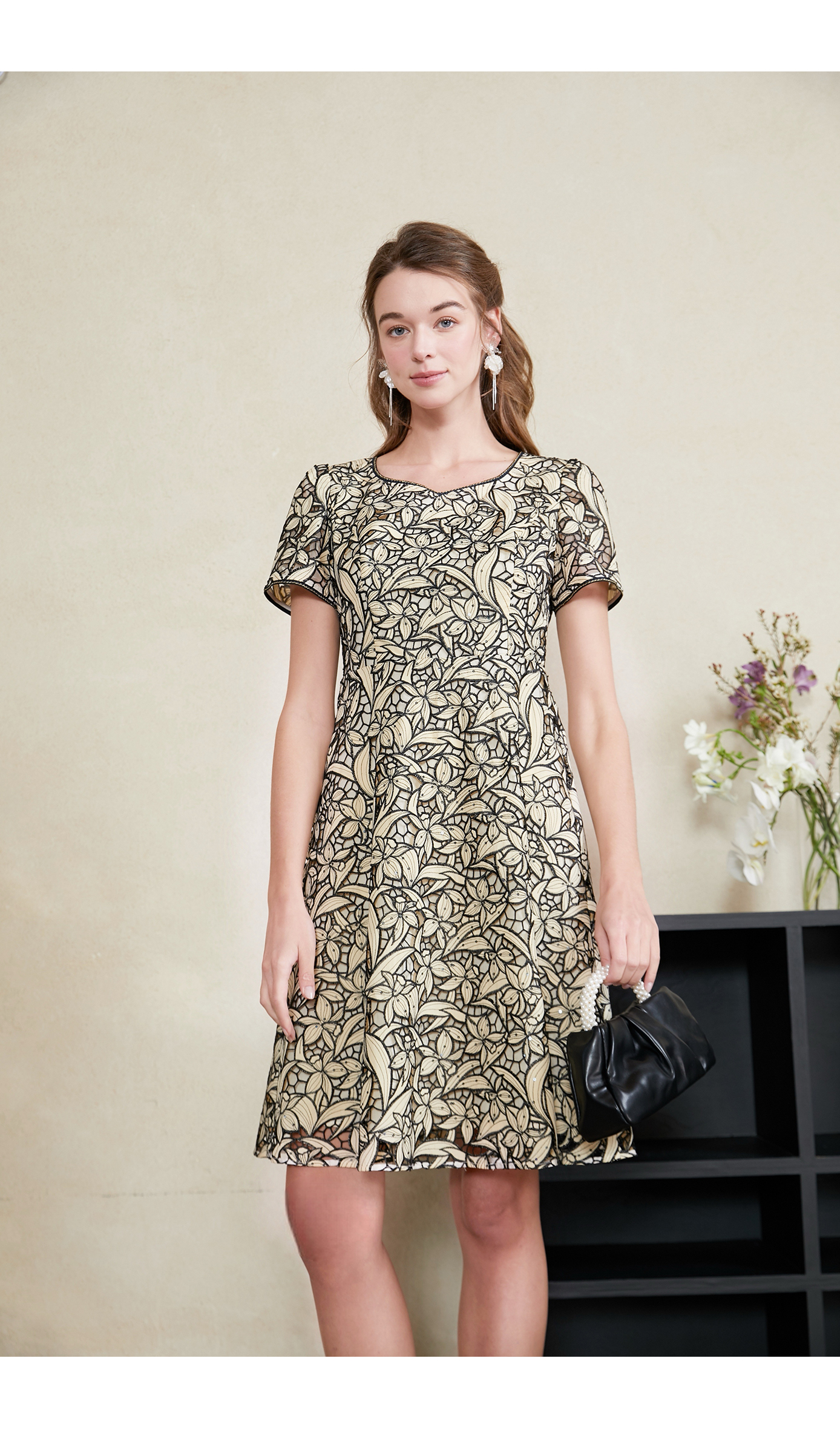司歌刺绣蕾丝重磅收腰短袖连衣裙A911050X