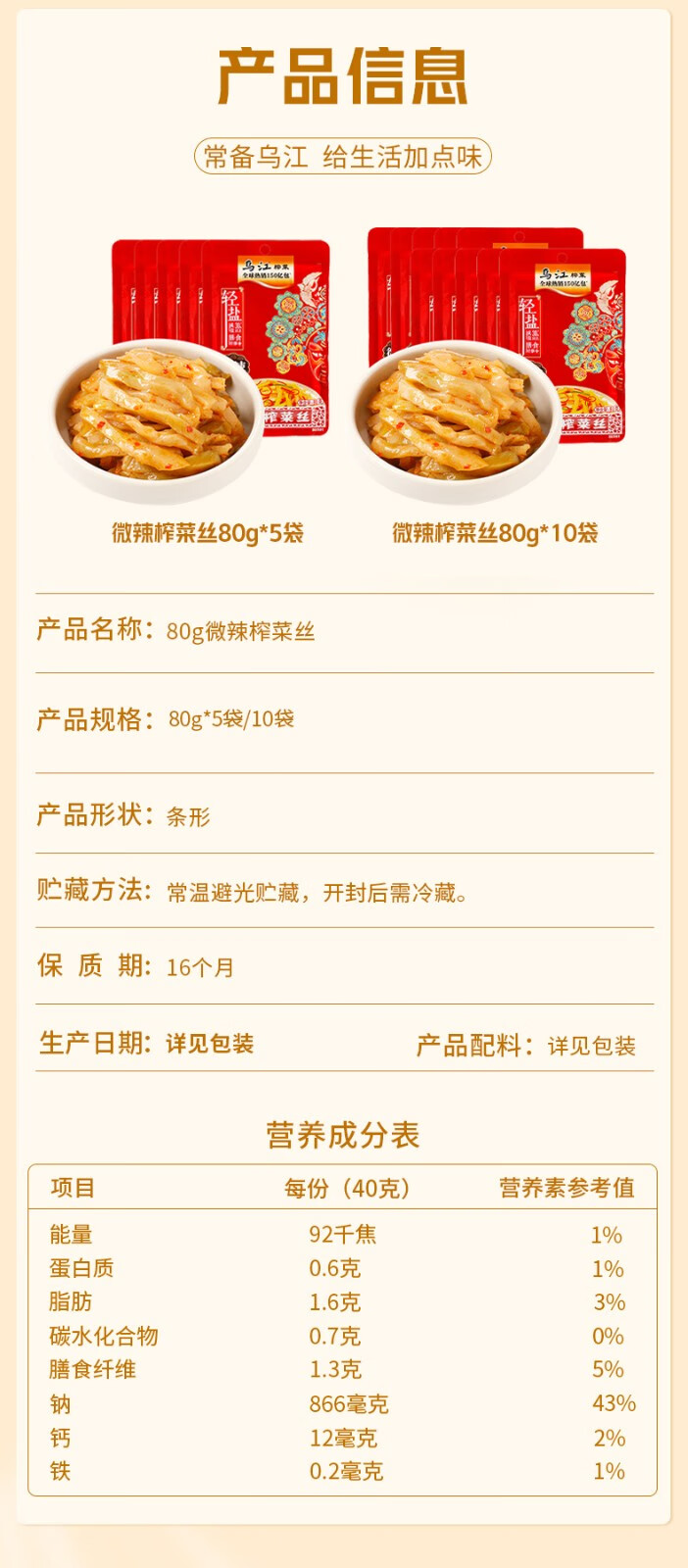 乌江涪陵轻盐微辣榨菜丝(量贩)80g*10袋