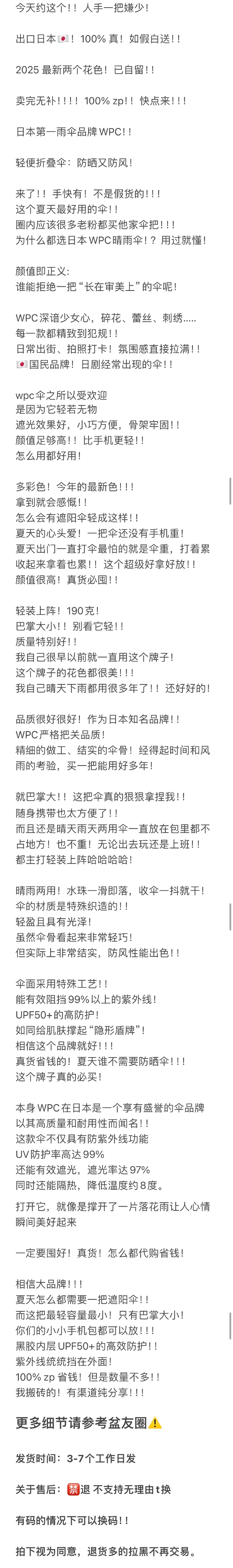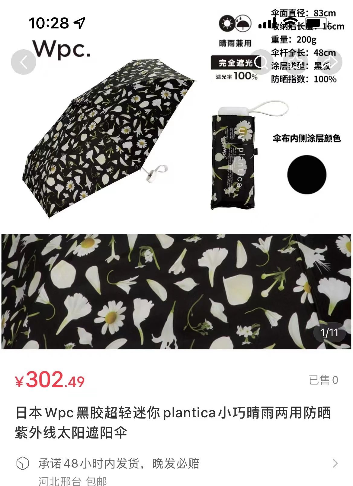 纯元福利款!wpc晴雨两用伞 出口订单 超轻190克黑胶涂层防uv100%