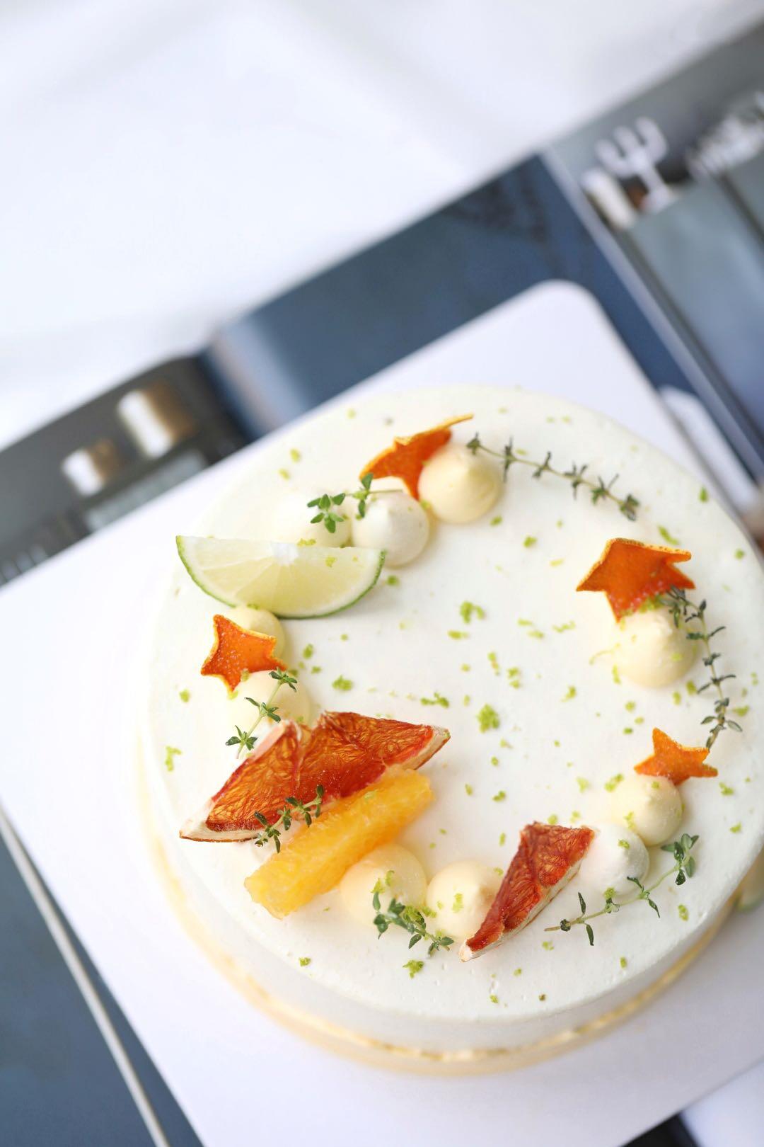 「食材」新西兰动物淡奶油,轻乳酪戚风蛋糕,赣南脐橙,自制香橙布丁,青柠檬,自制橙皮,蜜桔。