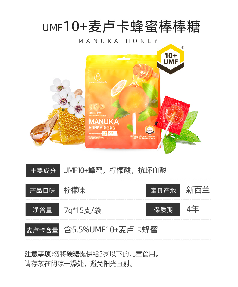 荷塔威-UMF10+麦卢卡蜂蜜棒棒糖(柠檬味)7g*15支新鲜日期