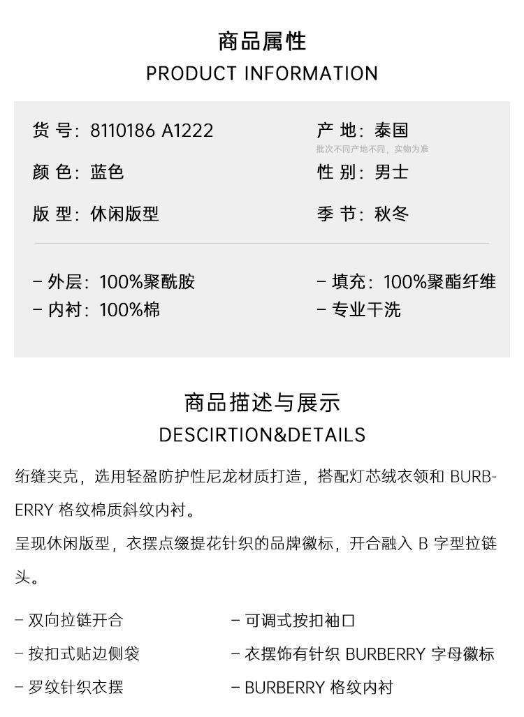 BURBERRY 巴宝莉 男士字母字母徽标绗缝尼龙夹克棉服 蓝色 8110186 A1222
