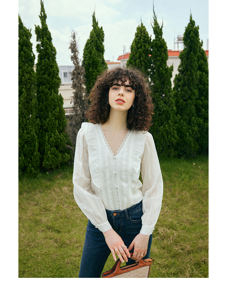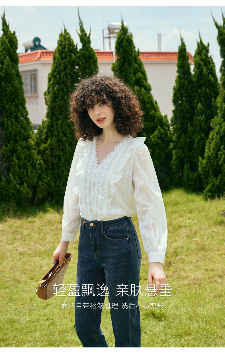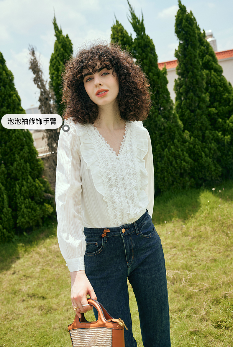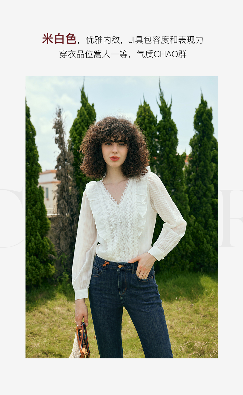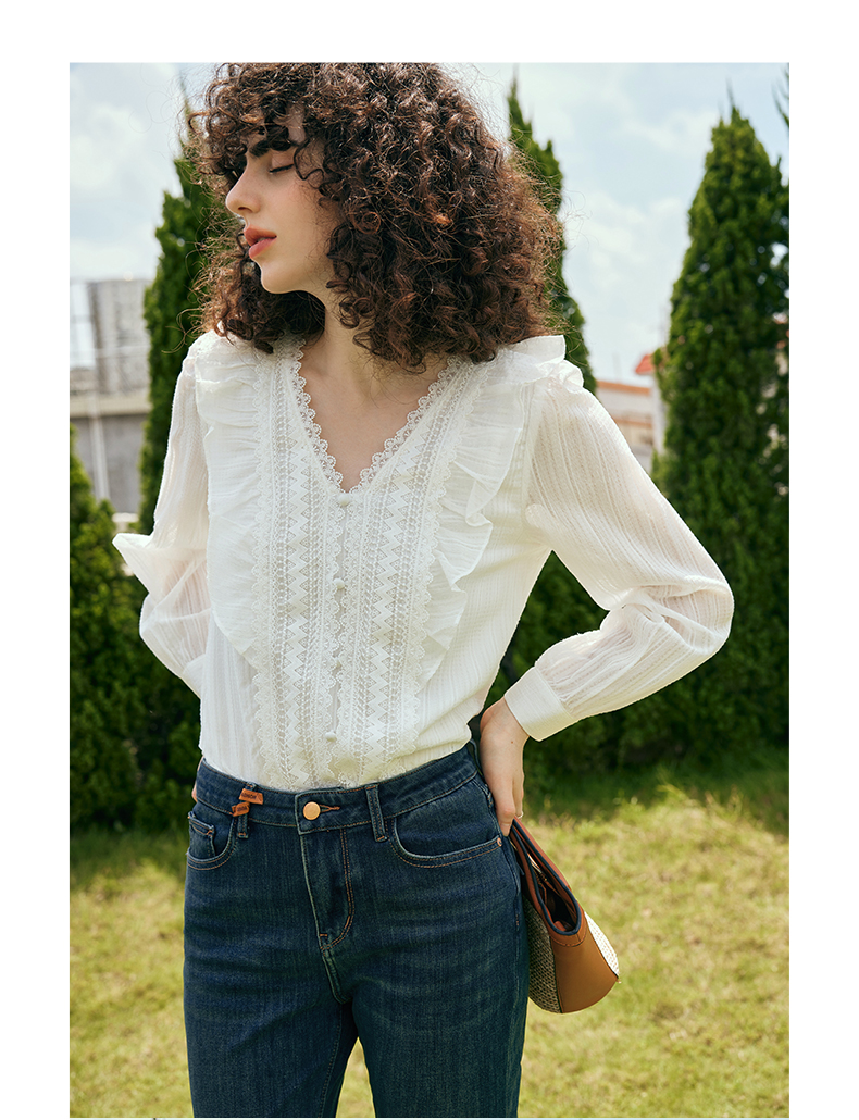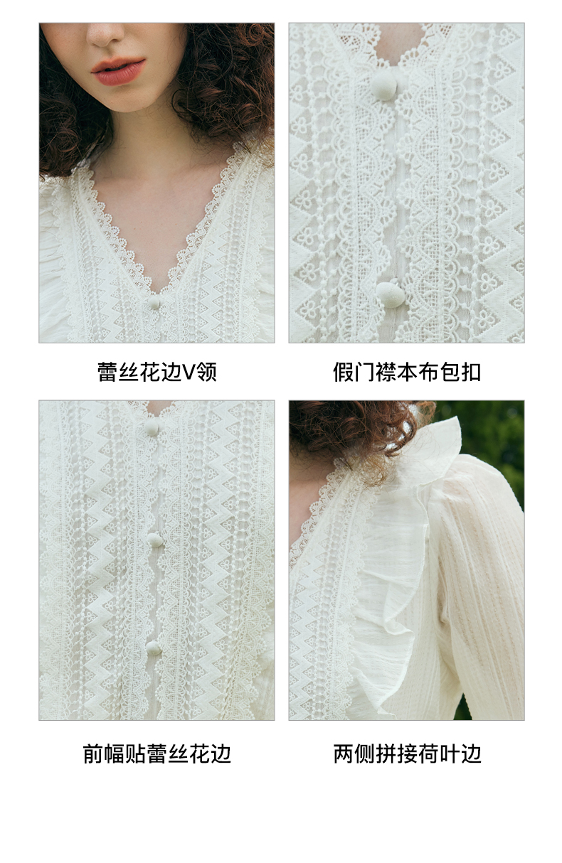 OLrain欧芮儿米白色蕾丝雪纺衫女初秋2023新款法式荷叶边V领小衫