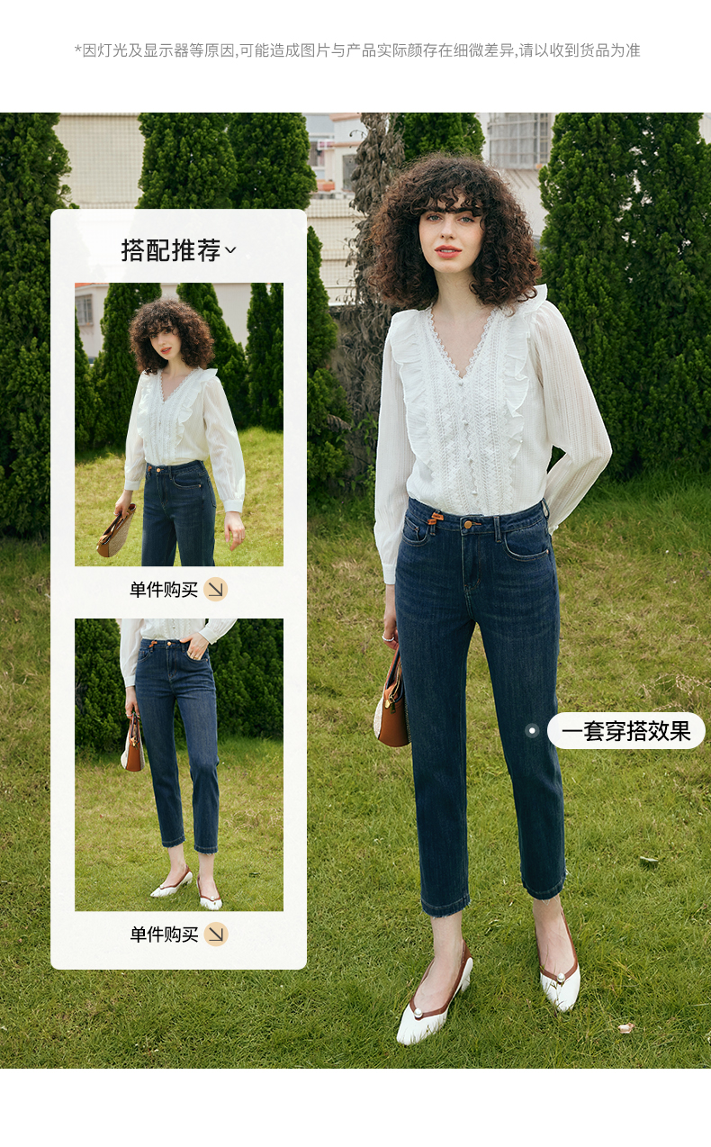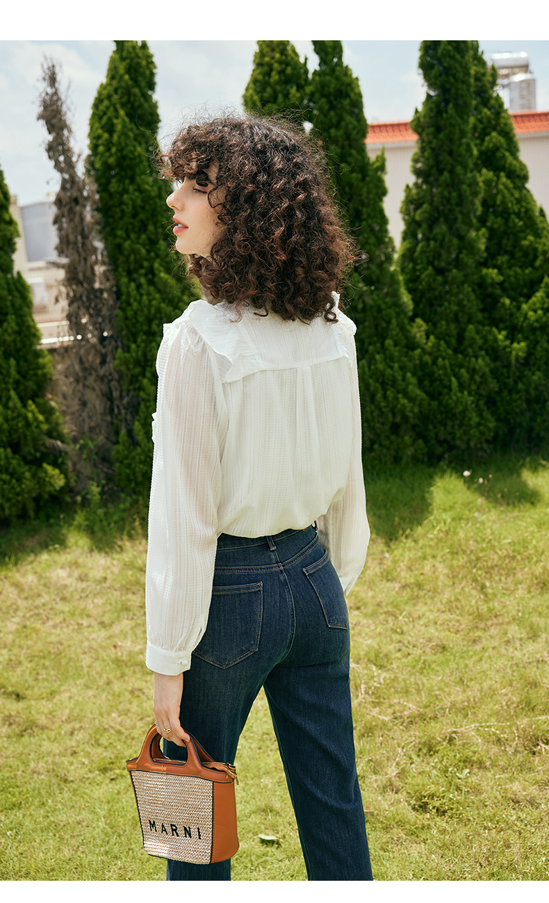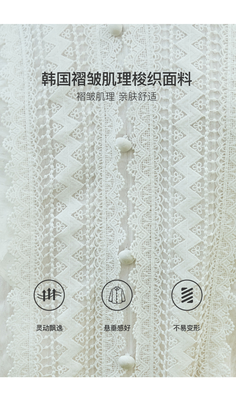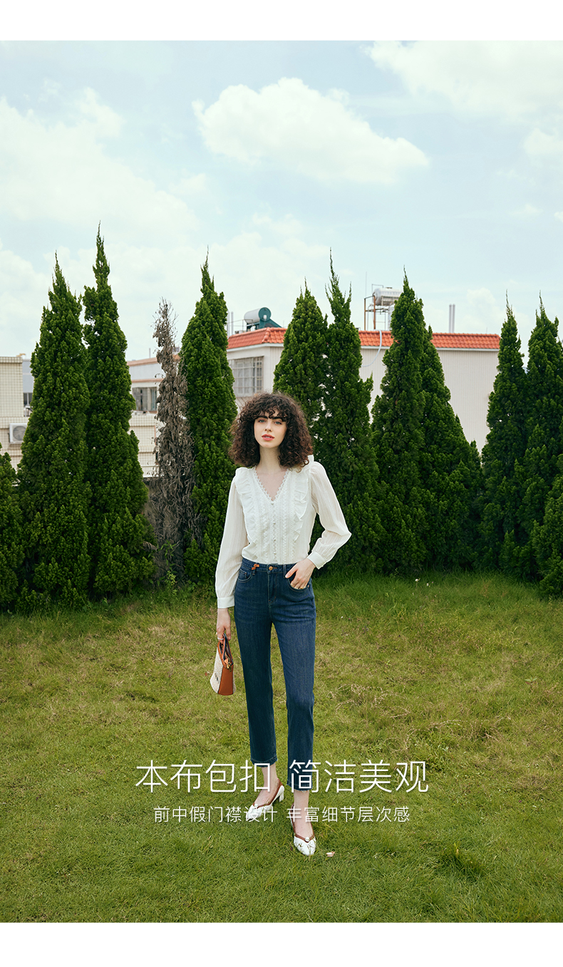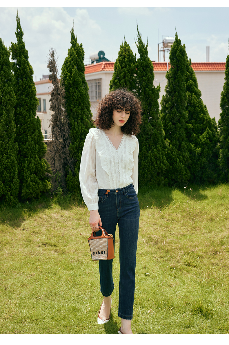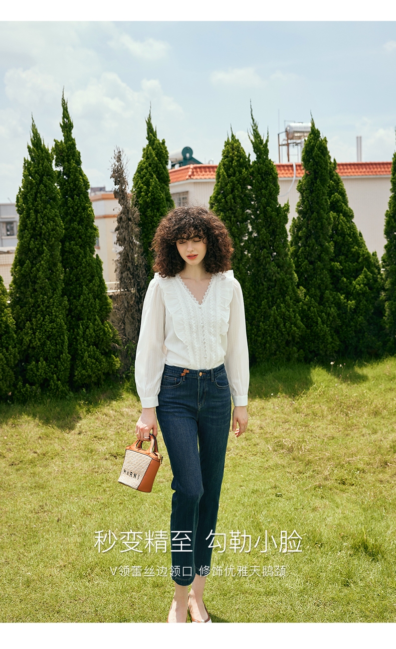 OLrain欧芮儿米白色蕾丝雪纺衫女初秋2023新款法式荷叶边V领小衫