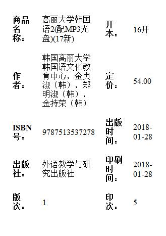 《高丽大学韩国语2》由韩国高丽大学韩国语文化教育中心的诸位具有多年教学经验和研究成果的优秀教师编写而成。教材注重语言的实用性,强调口语能力,内容活泼生动,通俗易懂,辅以大量的练习,帮助实现每课学习目标的同时,逐步提升学习者的韩国语表达能力。- 外研社旗舰店 (微信公众号认证)