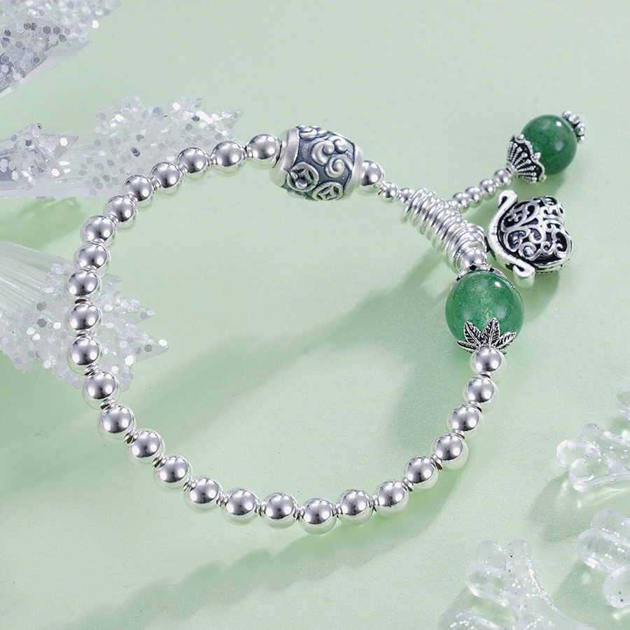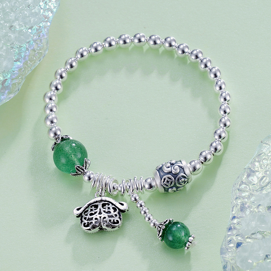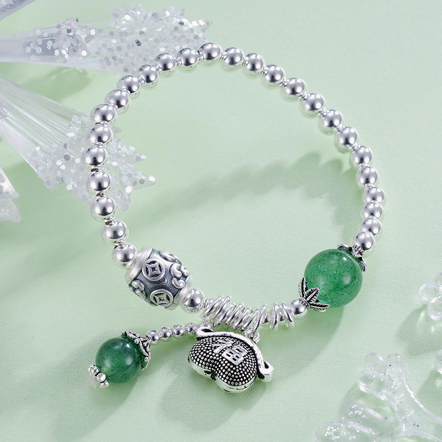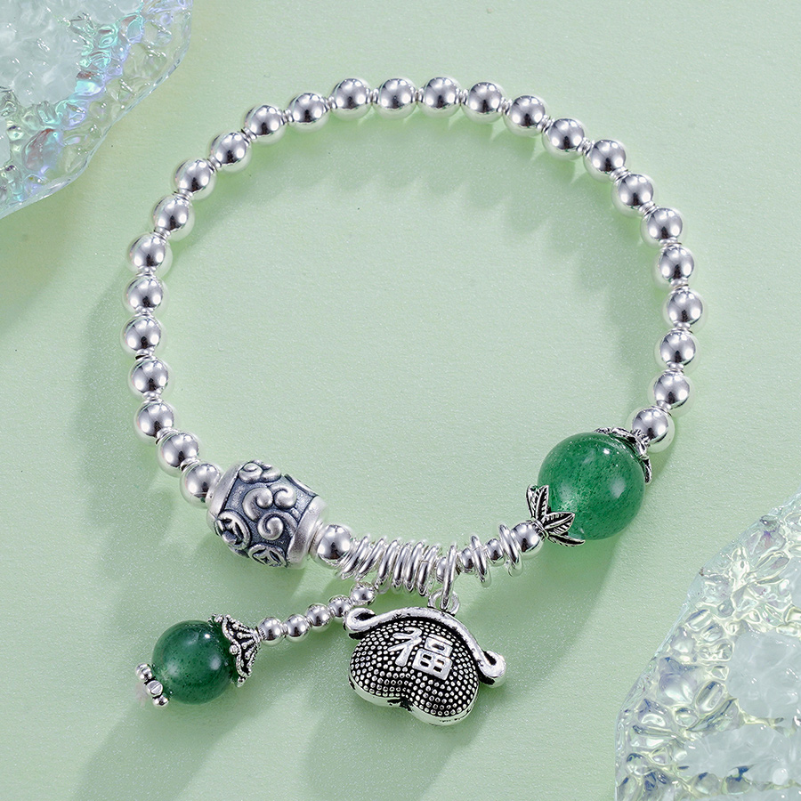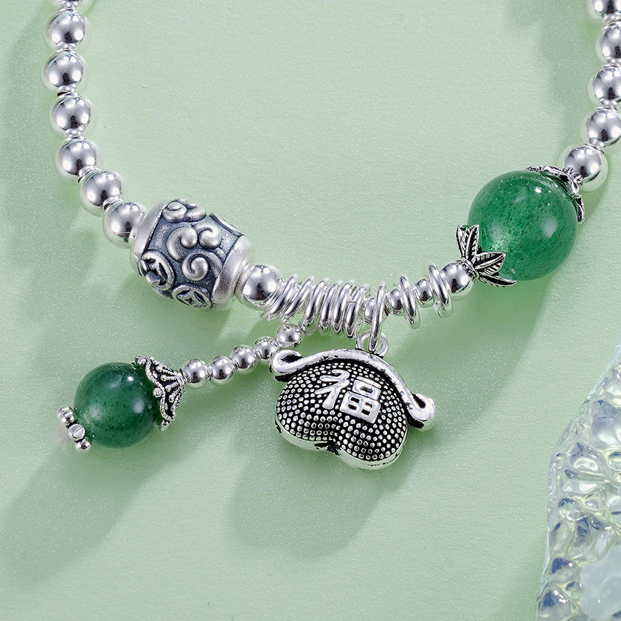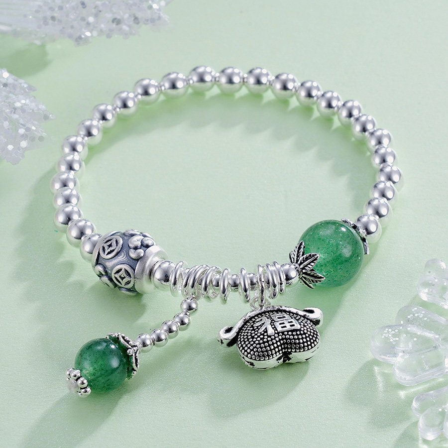 【寓意】:整条手链以纯银圆珠串联,将福袋元素有机融入,寓意祥和兴旺,迎财纳福。搭配绿玉髓圆珠作为亮点,展现祥和美满的深远意境。