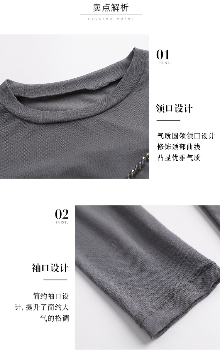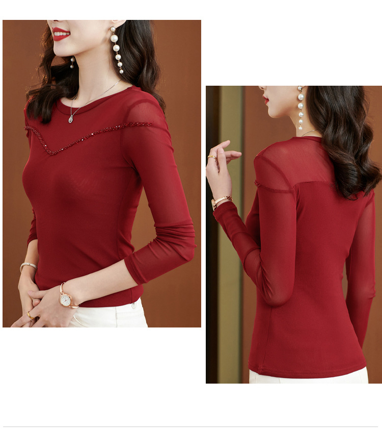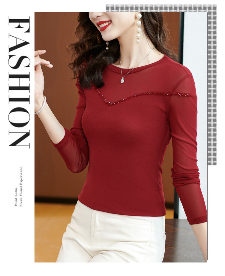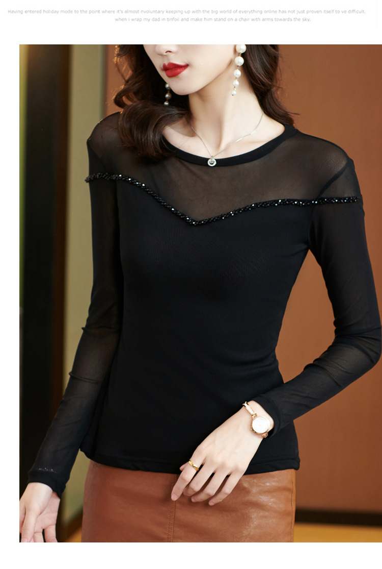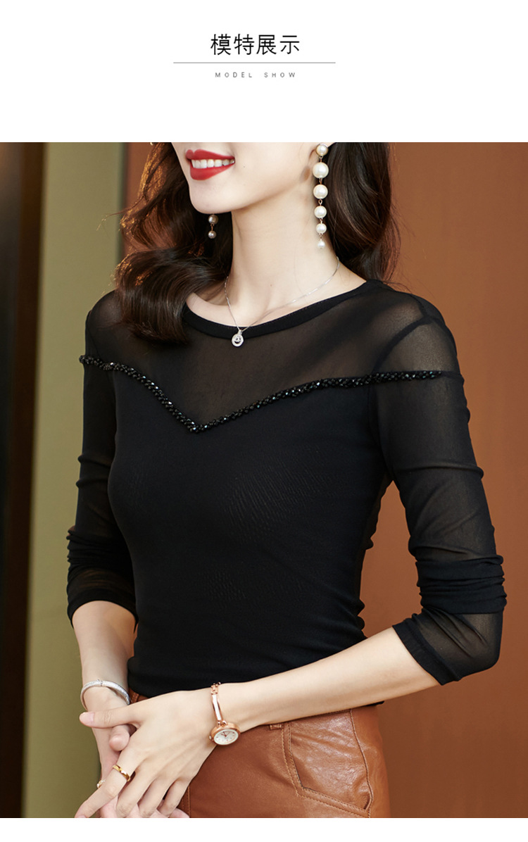 新款网纱,圆领时尚钉珠百搭洋气打底衫长袖修身显瘦T恤KQL-6276