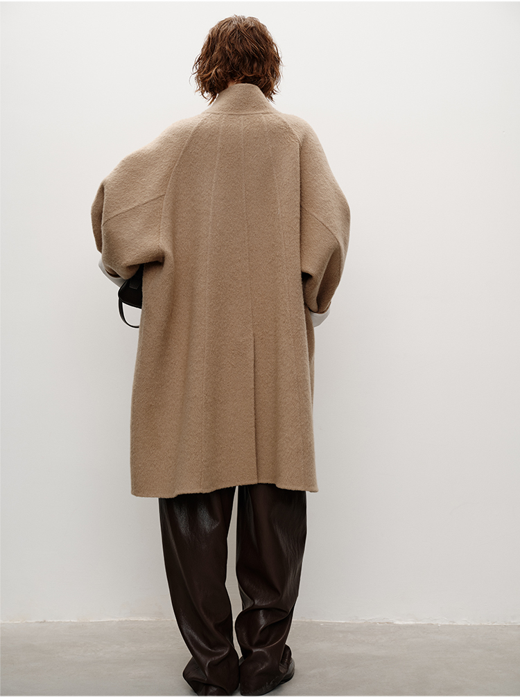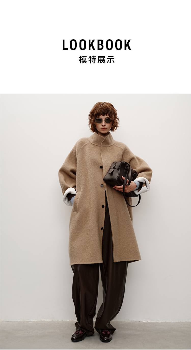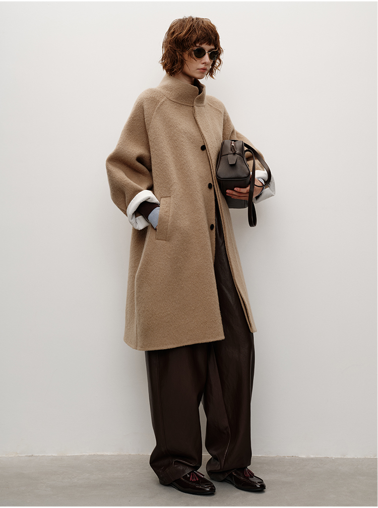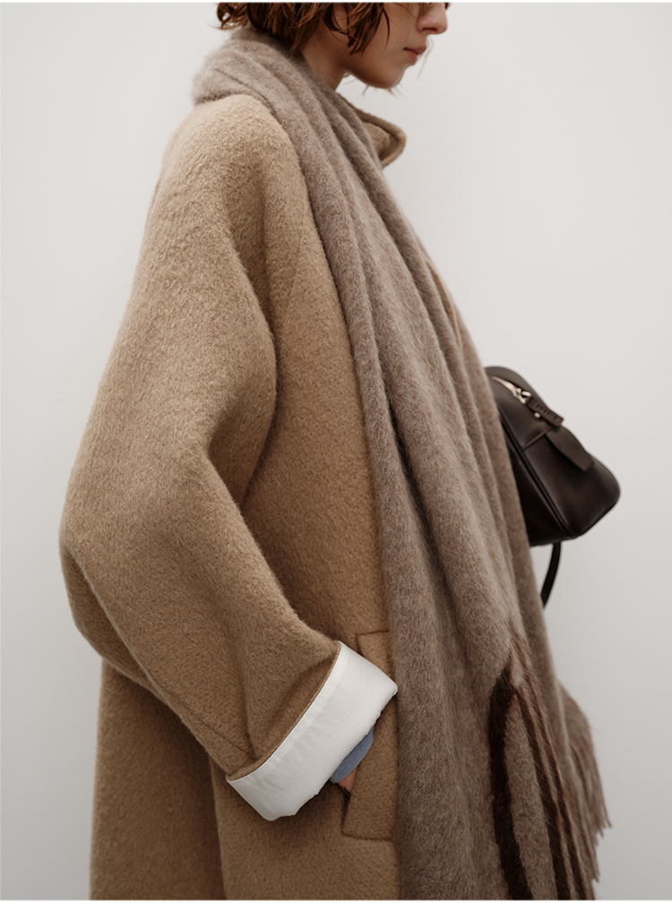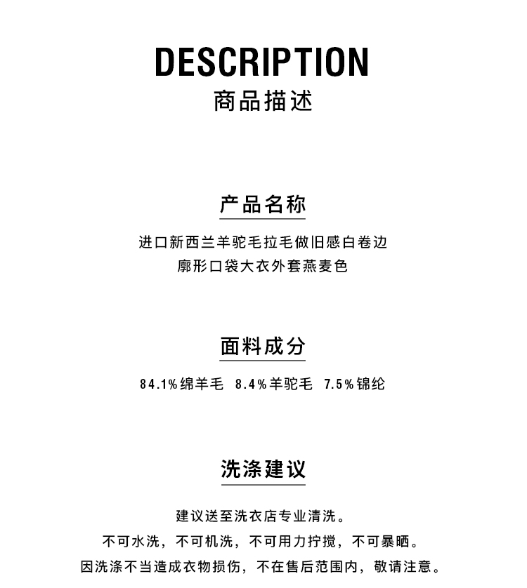 HIDEMI 进口新西兰羊驼毛拉毛做旧感白卷边廓形口袋大衣外套 燕麦色