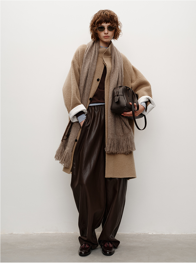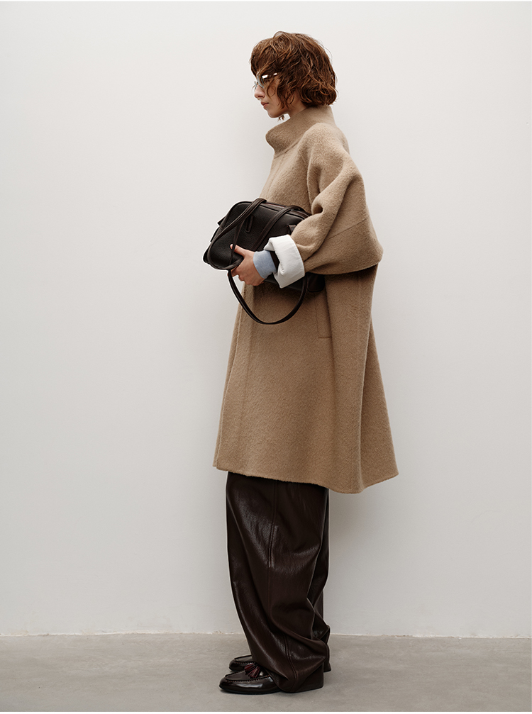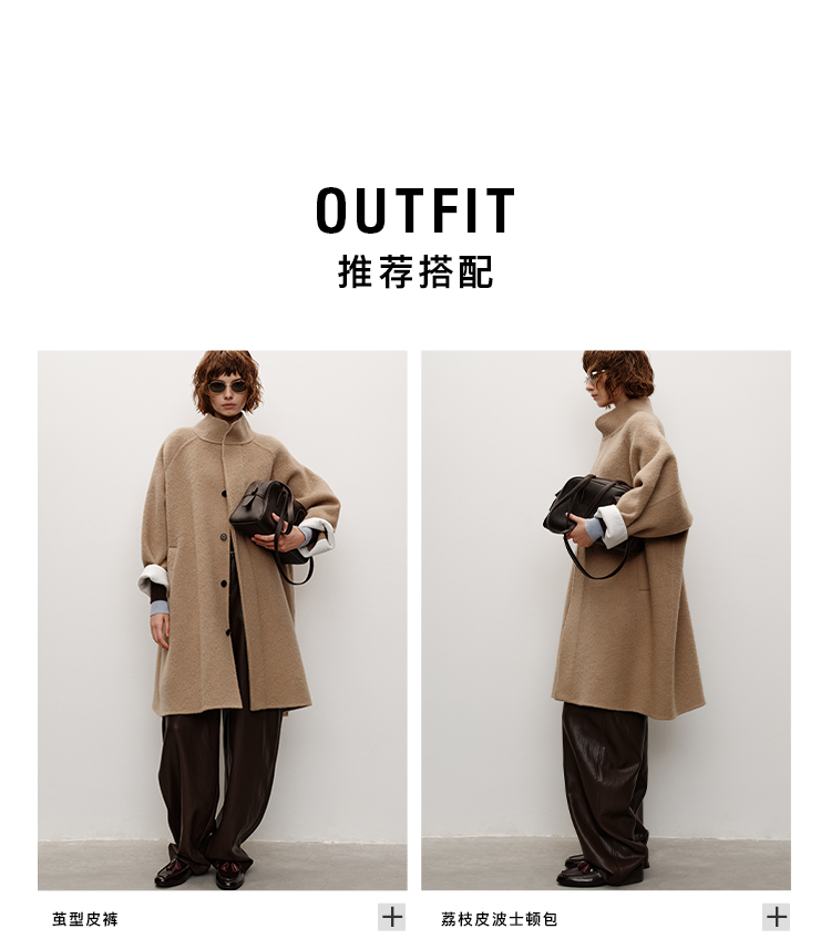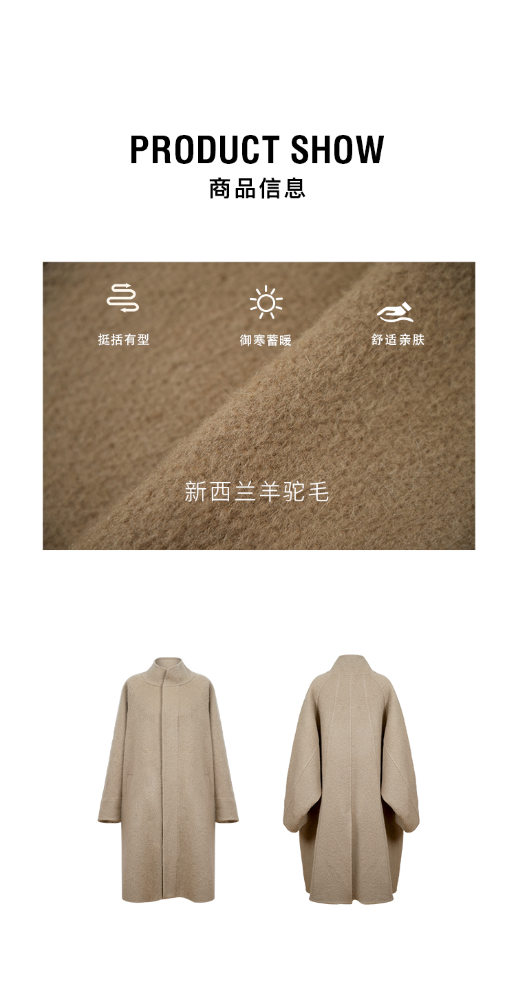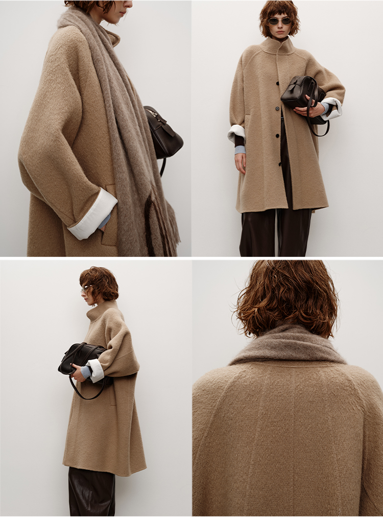 HIDEMI 进口新西兰羊驼毛拉毛做旧感白卷边廓形口袋大衣外套 燕麦色