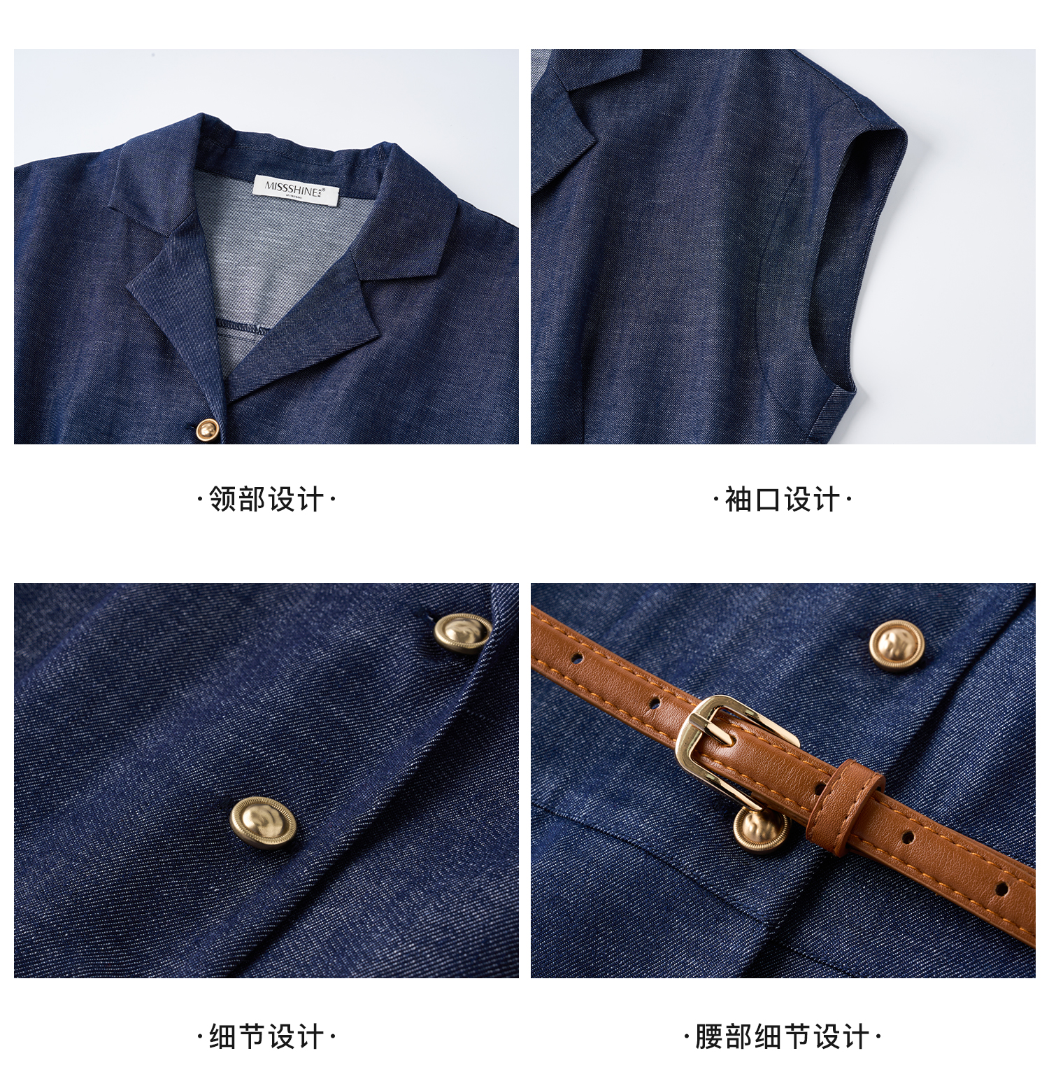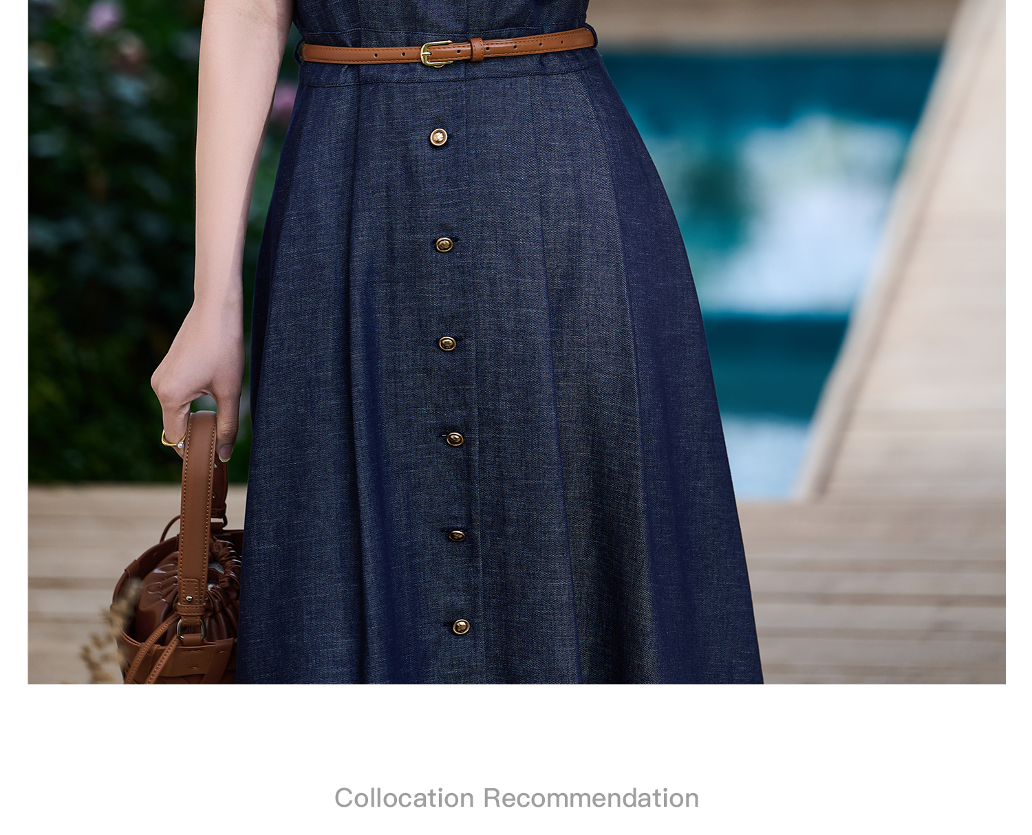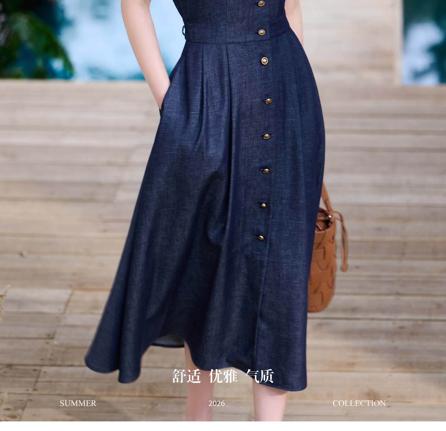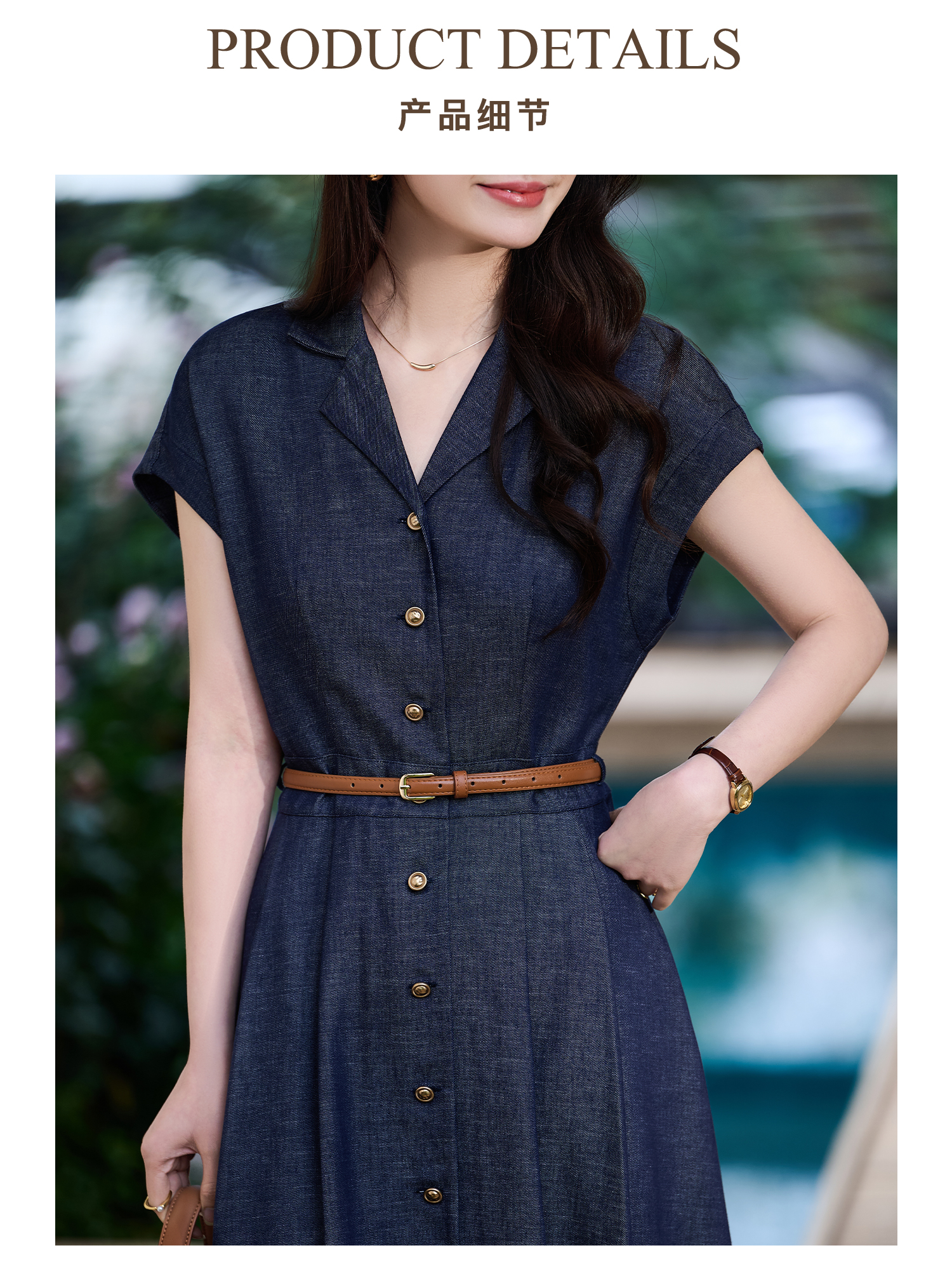 港风复古~天丝亚麻仿牛仔 凉感垂坠 米思阳2026春夏新款深蓝色衬衫领连衣裙女气质收腰显瘦牛仔裙子6147