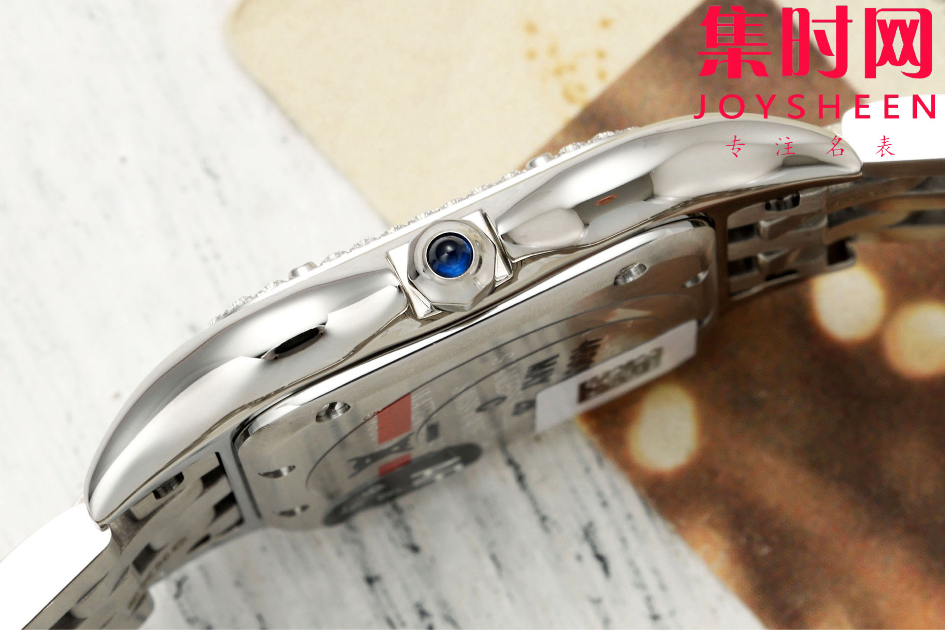 表壳表冠材质:精钢,表冠镶嵌1颗凸圆形蓝色合成尖晶石