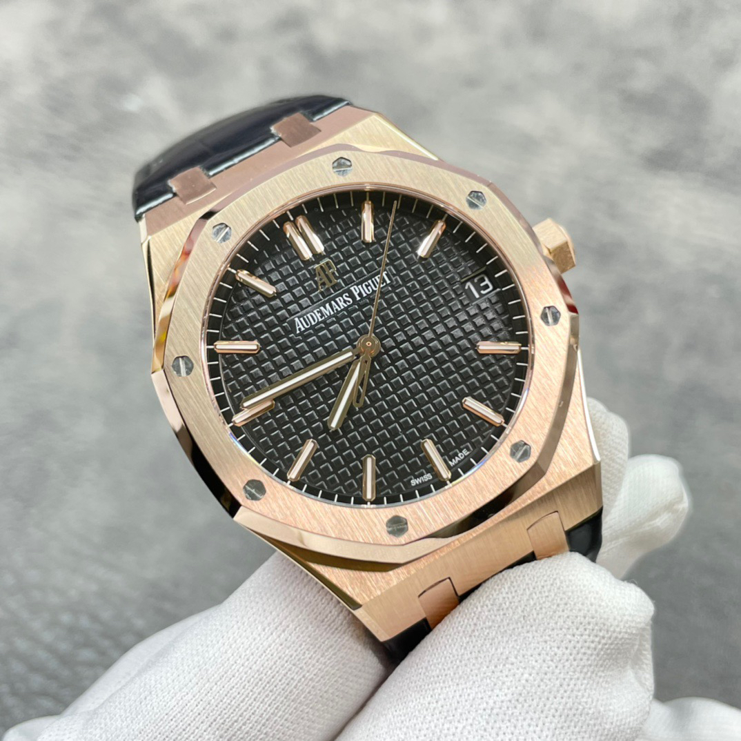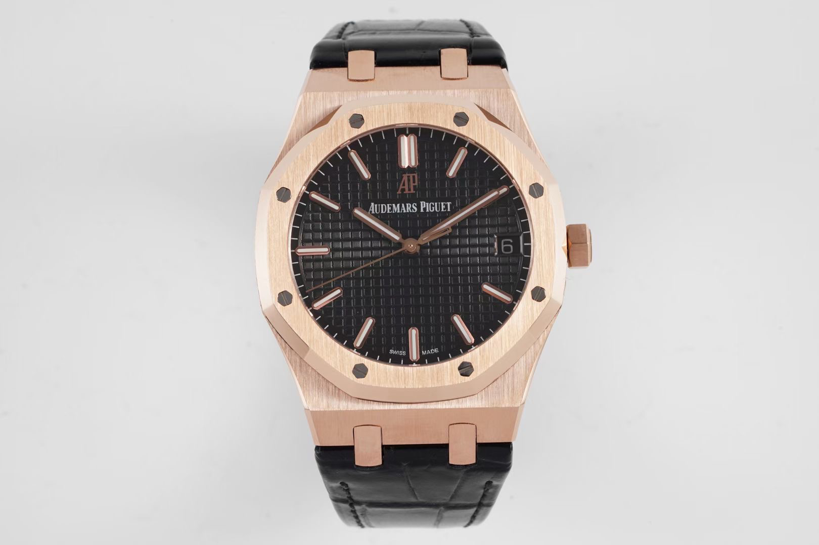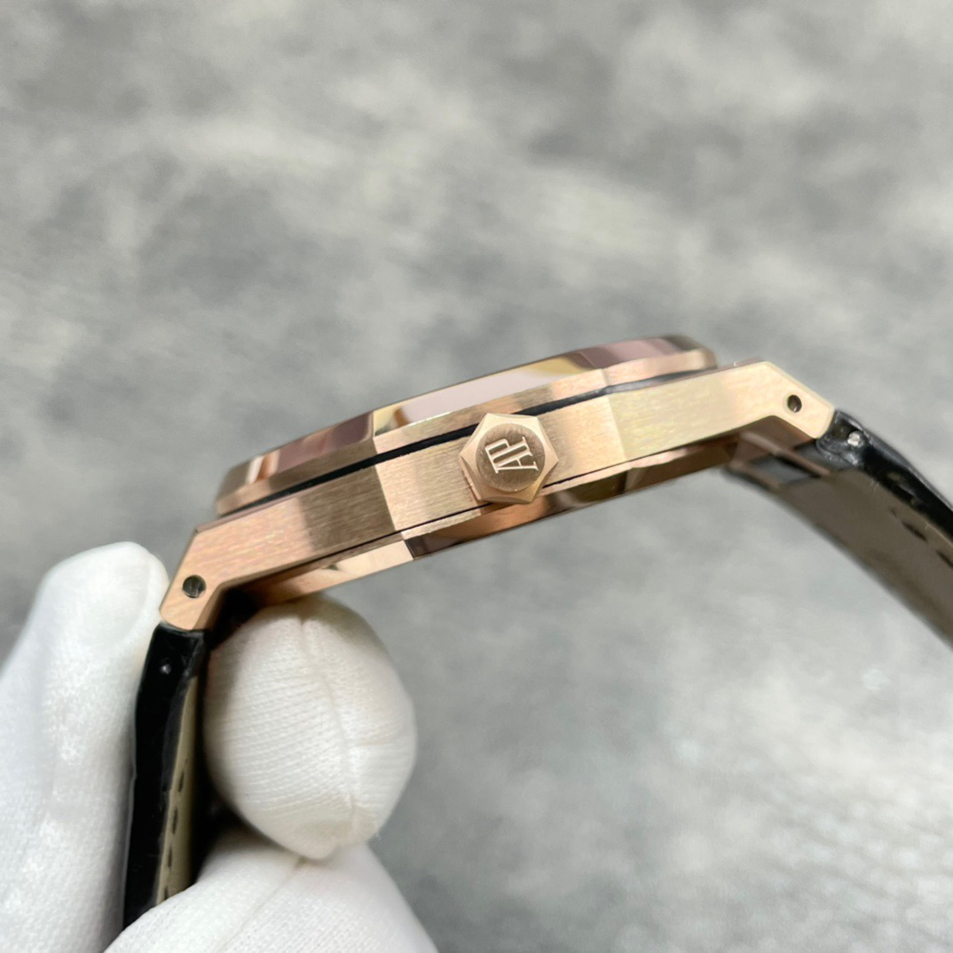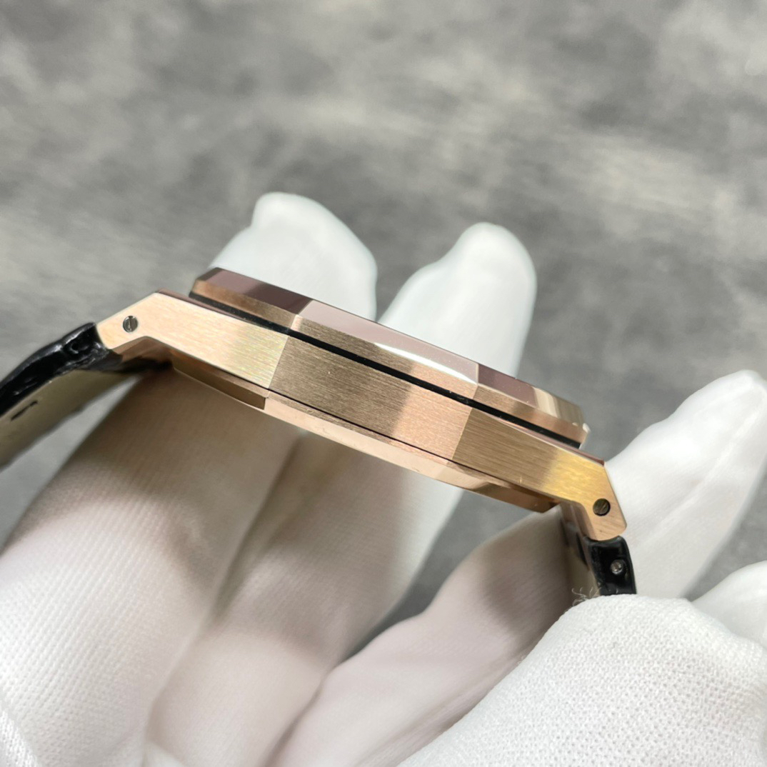 ZF皇家橡树15500玫瑰金黑盘 乃目前市面钢表的巅峰之作,—— 实力演绎 卫冕"钢"王!【6大精妙之处】1.正品拆解开模,尺寸为41X10.4毫米与正品一致!2.完全还原正品表壳的每一处细节,尽显正品"棱角分明 坚毅果敢"的阳刚气质。3.钢带的做工无可挑剔,比市面上任何钢带表做工均要更上一层楼,钢带头粒和表头衔接的"缓冲带"的松紧程度与正品一模一样。4.自动陀的与原装致敬,是市面唯一做到颜色于原装一致的版本(市面一般版本均偏红)其上的ap族徽雕刻独一无二。5.打破夹板概念,采用原装进口9015机芯改爱彼CAL.4302一体机!更稳定,更优秀,更真实。6.表盘的"饼干纹理"立体饱满,精神抖擞!绝非普通小厂一般失魂落魄。体验精妙 感受不同!N新品 爱彼皇家橡树15500——乃目前市面钢表的巅峰之作,—— 实力演绎 卫冕"钢"王!【6大精妙之处】1.正品拆解开模,尺寸为41X10.4毫米与正品一致!2.完美还原正品表壳的每一处细节,尽显正品"棱角分明 坚毅果敢"的阳刚气质。3.钢带的做工无可挑剔,比市面上任何钢带表做工均要更上一层楼,钢带头粒和表头衔接的"缓冲带"的松紧程度与正品一模一样。4.自动陀的与原装致敬,是市面唯一做到颜色于原装一致的版本(市面一般版本均偏红)其上的ap族徽雕刻独一无二。5.打破夹板概念,采用9015机芯改爱彼CAL.4302一体机!更稳定,更优秀,更真实。6.表盘的"饼干纹理"立体饱满,精神抖擞!绝非普通小厂一般失魂落魄。体验精妙 感受不同!N出品 必属精品!