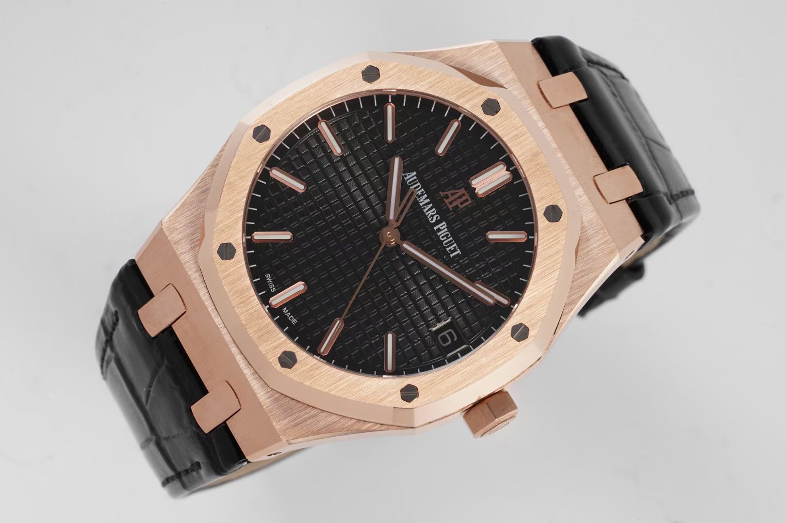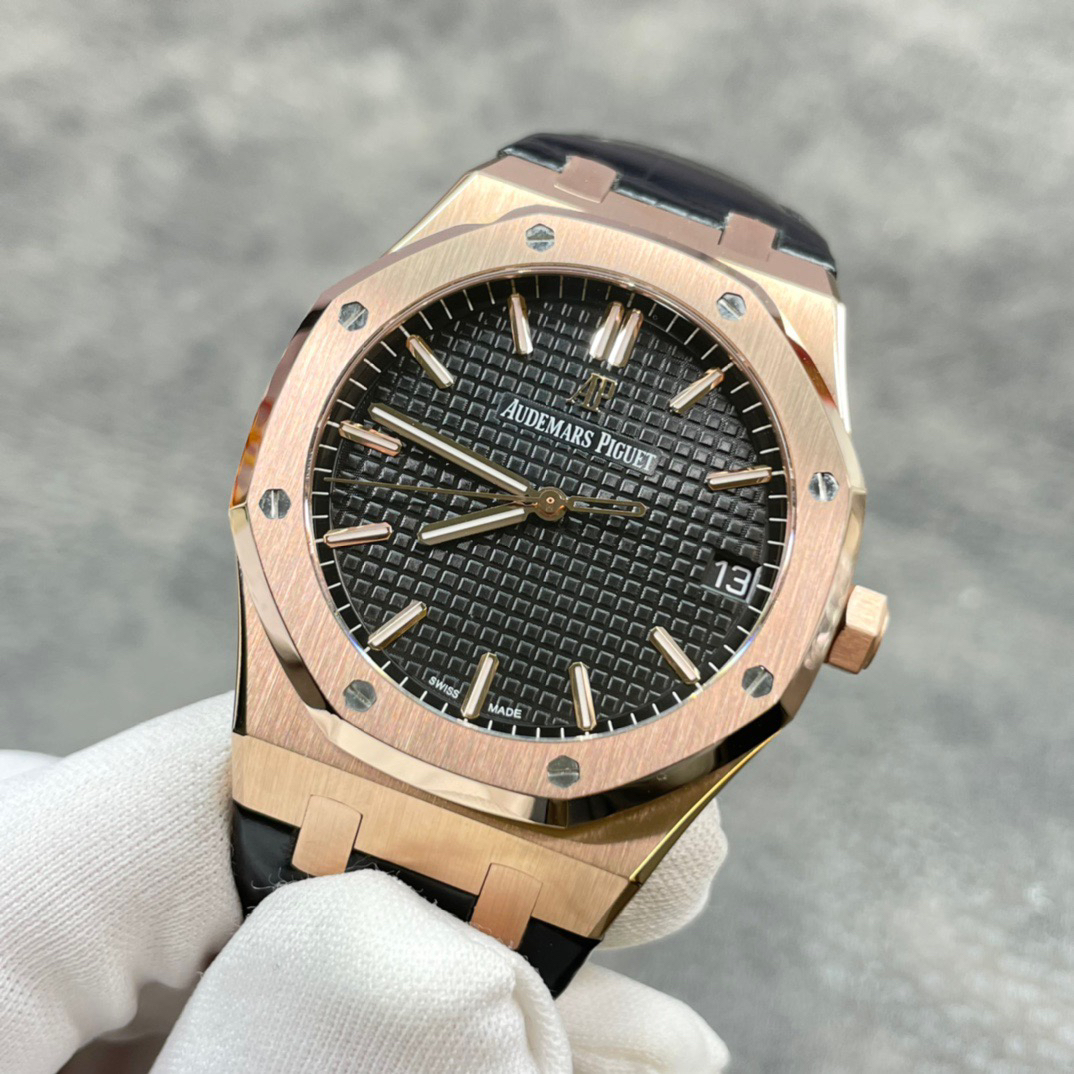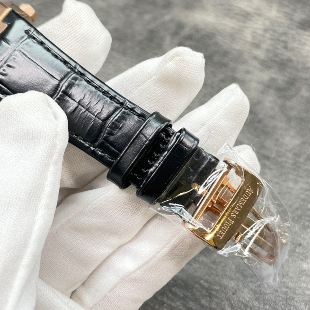 ZF皇家橡树15500玫瑰金黑盘 乃目前市面钢表的巅峰之作,—— 实力演绎 卫冕"钢"王!【6大精妙之处】1.正品拆解开模,尺寸为41X10.4毫米与正品一致!2.完全还原正品表壳的每一处细节,尽显正品"棱角分明 坚毅果敢"的阳刚气质。3.钢带的做工无可挑剔,比市面上任何钢带表做工均要更上一层楼,钢带头粒和表头衔接的"缓冲带"的松紧程度与正品一模一样。4.自动陀的与原装致敬,是市面唯一做到颜色于原装一致的版本(市面一般版本均偏红)其上的ap族徽雕刻独一无二。5.打破夹板概念,采用原装进口9015机芯改爱彼CAL.4302一体机!更稳定,更优秀,更真实。6.表盘的"饼干纹理"立体饱满,精神抖擞!绝非普通小厂一般失魂落魄。体验精妙 感受不同!N新品 爱彼皇家橡树15500——乃目前市面钢表的巅峰之作,—— 实力演绎 卫冕"钢"王!【6大精妙之处】1.正品拆解开模,尺寸为41X10.4毫米与正品一致!2.完美还原正品表壳的每一处细节,尽显正品"棱角分明 坚毅果敢"的阳刚气质。3.钢带的做工无可挑剔,比市面上任何钢带表做工均要更上一层楼,钢带头粒和表头衔接的"缓冲带"的松紧程度与正品一模一样。4.自动陀的与原装致敬,是市面唯一做到颜色于原装一致的版本(市面一般版本均偏红)其上的ap族徽雕刻独一无二。5.打破夹板概念,采用9015机芯改爱彼CAL.4302一体机!更稳定,更优秀,更真实。6.表盘的"饼干纹理"立体饱满,精神抖擞!绝非普通小厂一般失魂落魄。体验精妙 感受不同!N出品 必属精品!