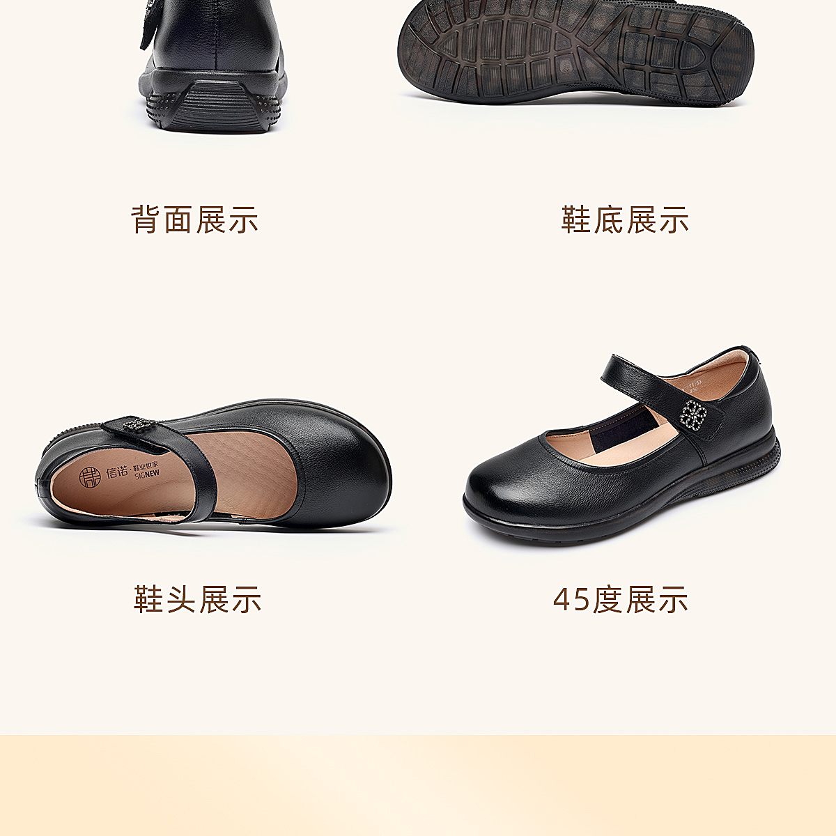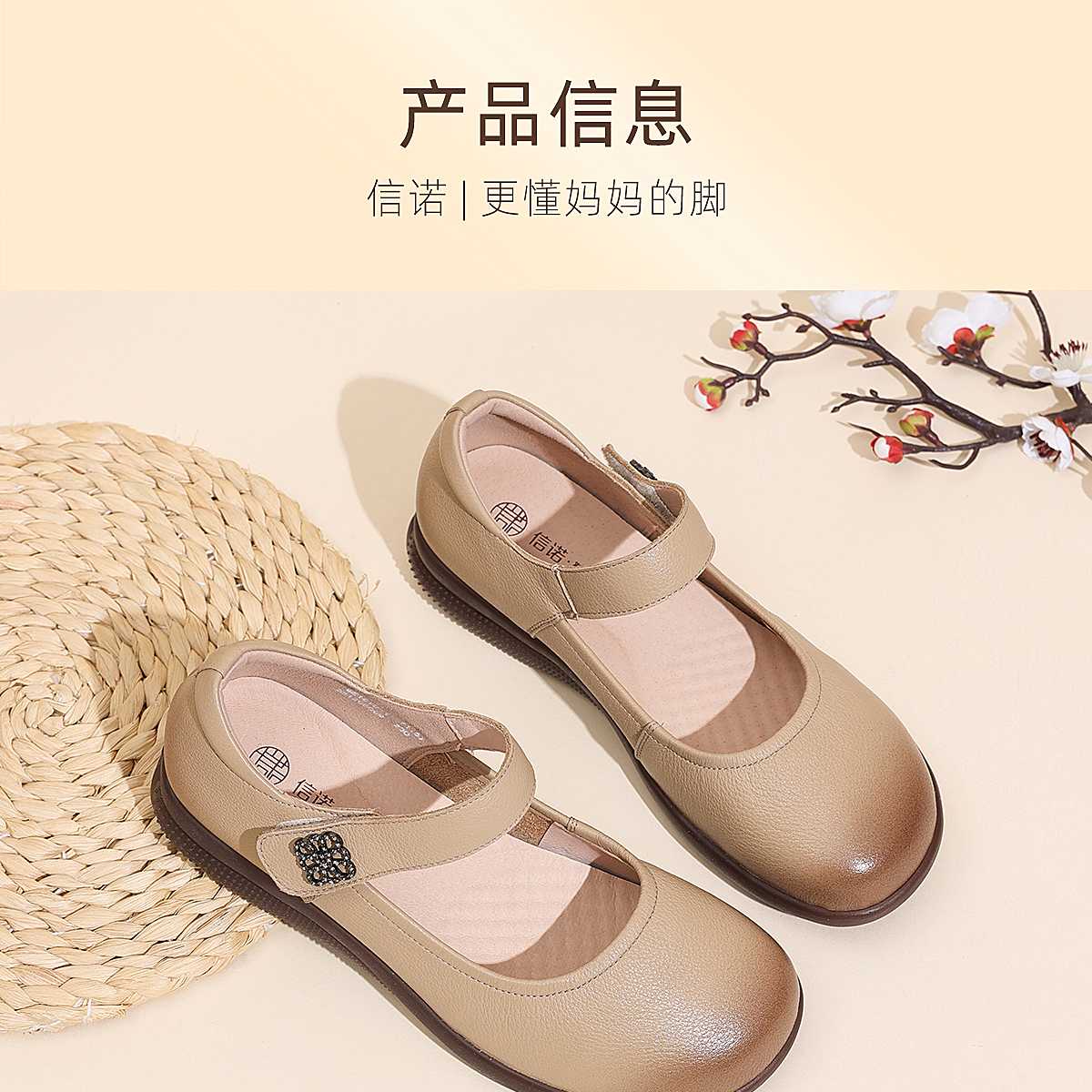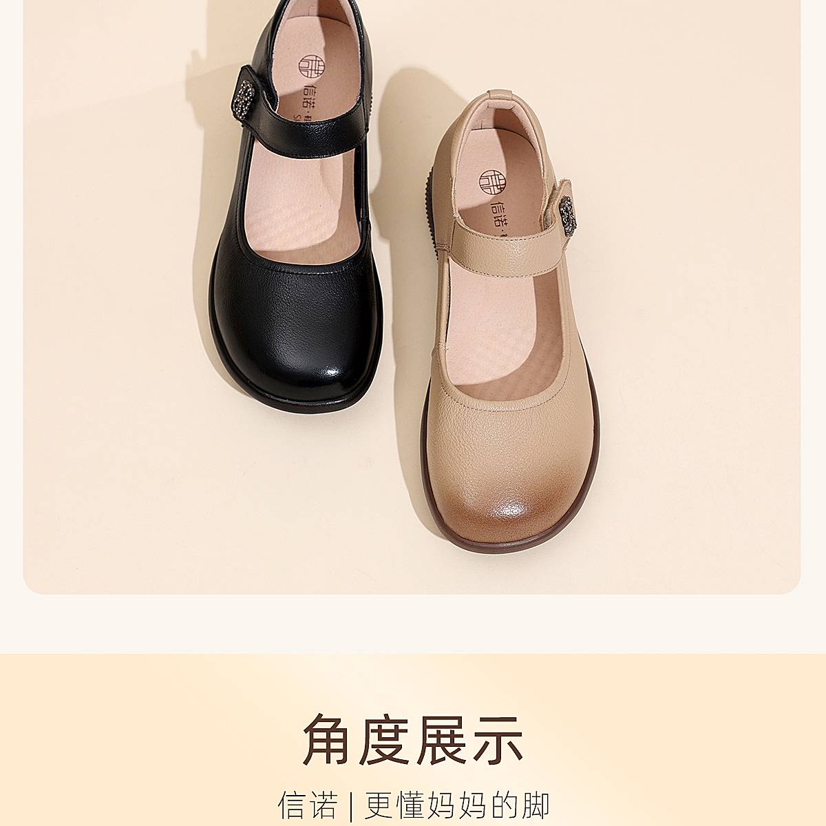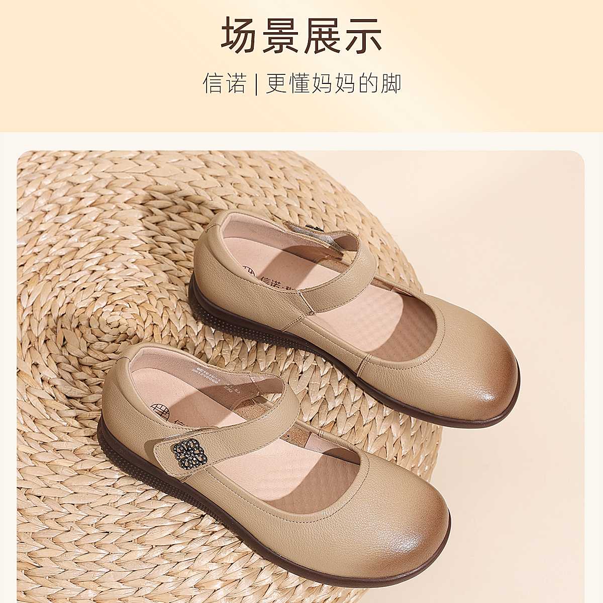 信诺真皮玛丽珍鞋女平底软底单鞋通勤风妈妈鞋舒适皮鞋6C1018-1