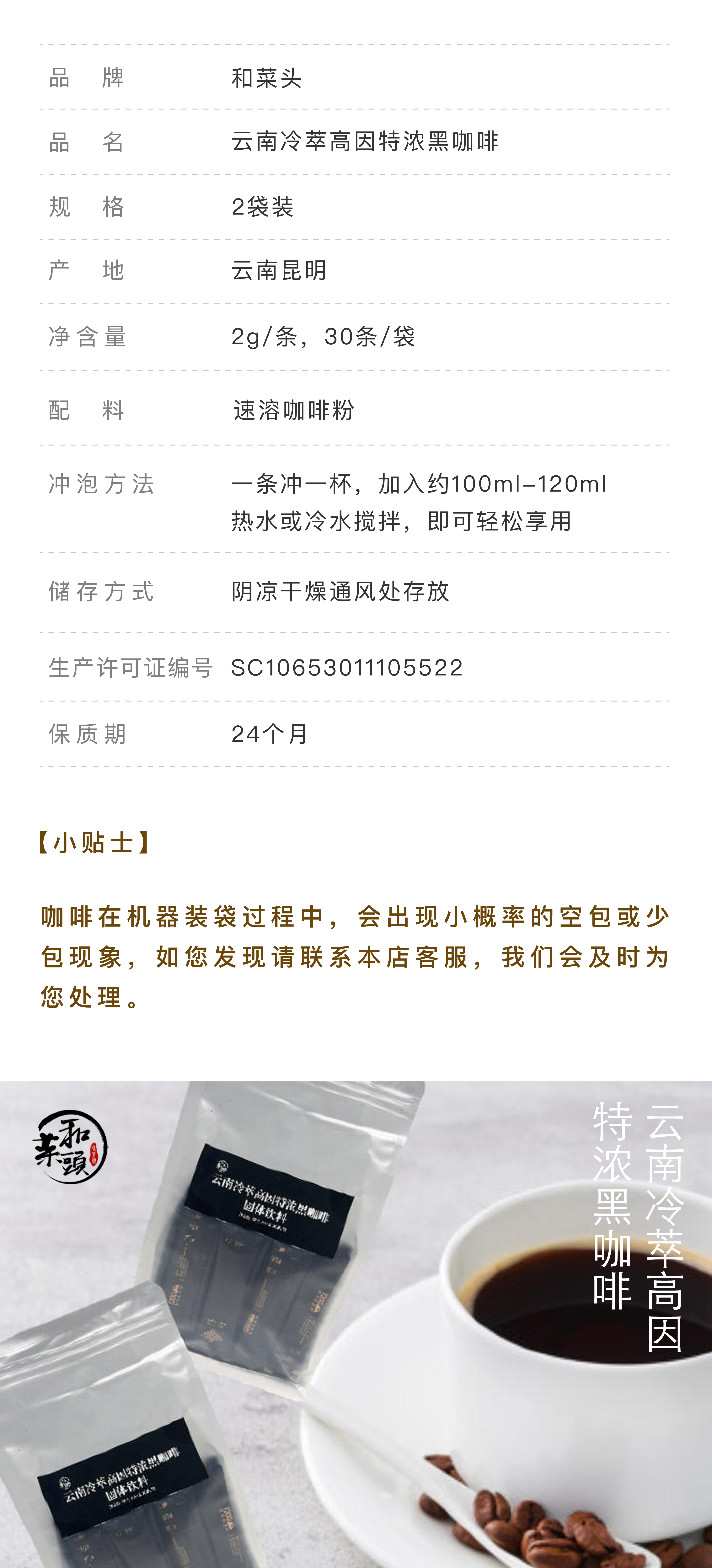 和菜头 云南冷萃高因特浓黑咖啡 2袋装(2g/条,30条/袋共60条)
