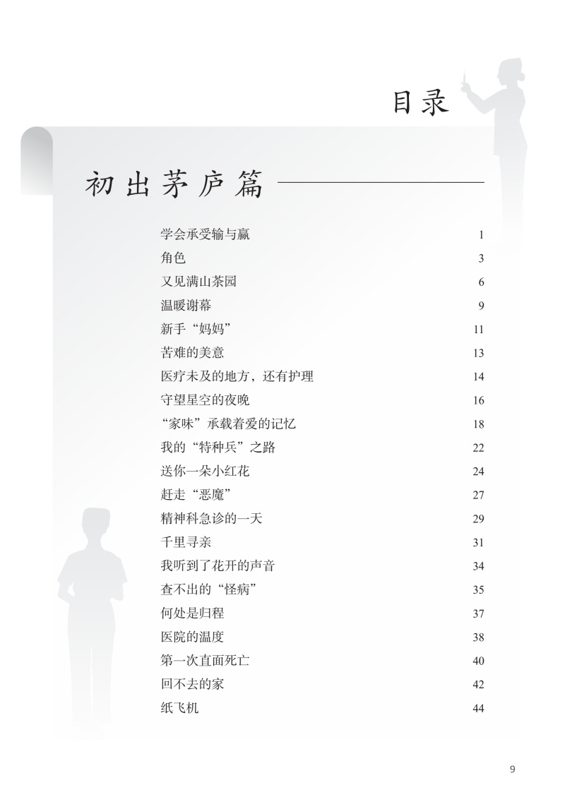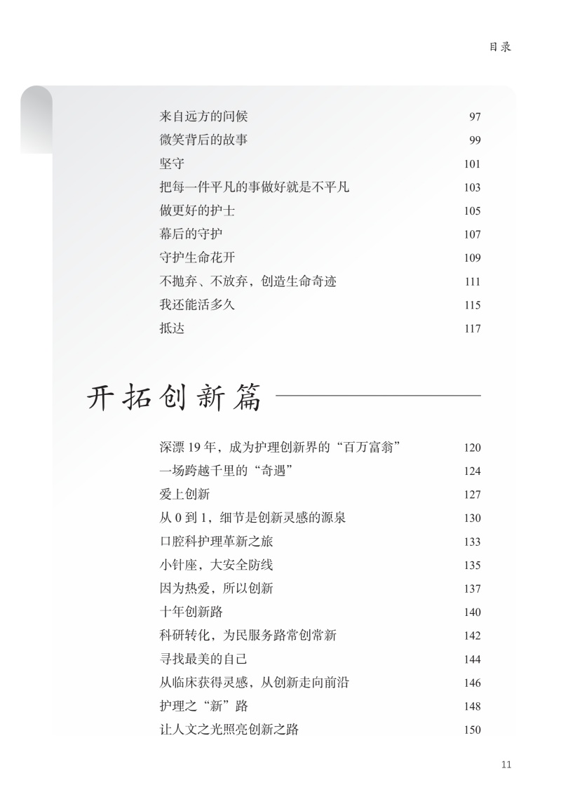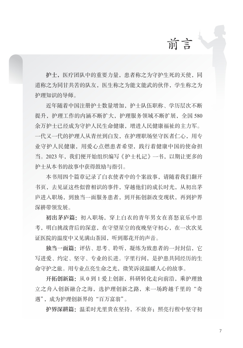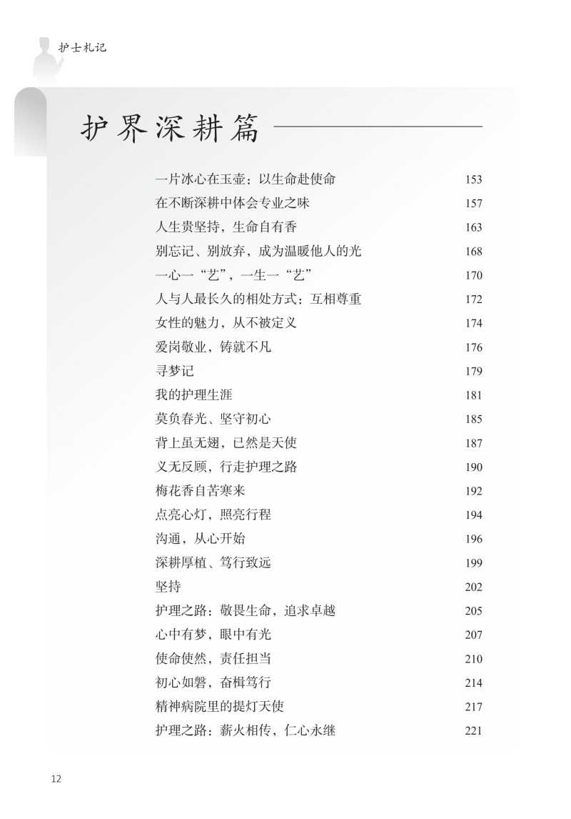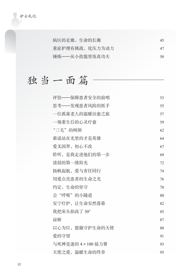 本书以护士职业生涯时间轴为主线,分为初出茅庐、独当一面、成为专家、创新创业故事四个模块。故事内容包括新手护士的成长之路、护士临床见闻及感悟、临床经典案例、援疆援藏护士故事、行业先锋榜样的先进事迹、护士创新创造等,传播给年轻护士有益的启示和激励,记录和宣传行业中的先锋榜样及经典的事迹,弘扬无私、奉献、谨慎、责任、创新等精神内核,同时通过故事展现护士的核心能力,传递临床经验及技能。以点燃广大护士的工作热情,潜移默化地影响其职业态度,增强其职业认同感,提高其职业素养,对护士职业生涯规划起到参考作用。