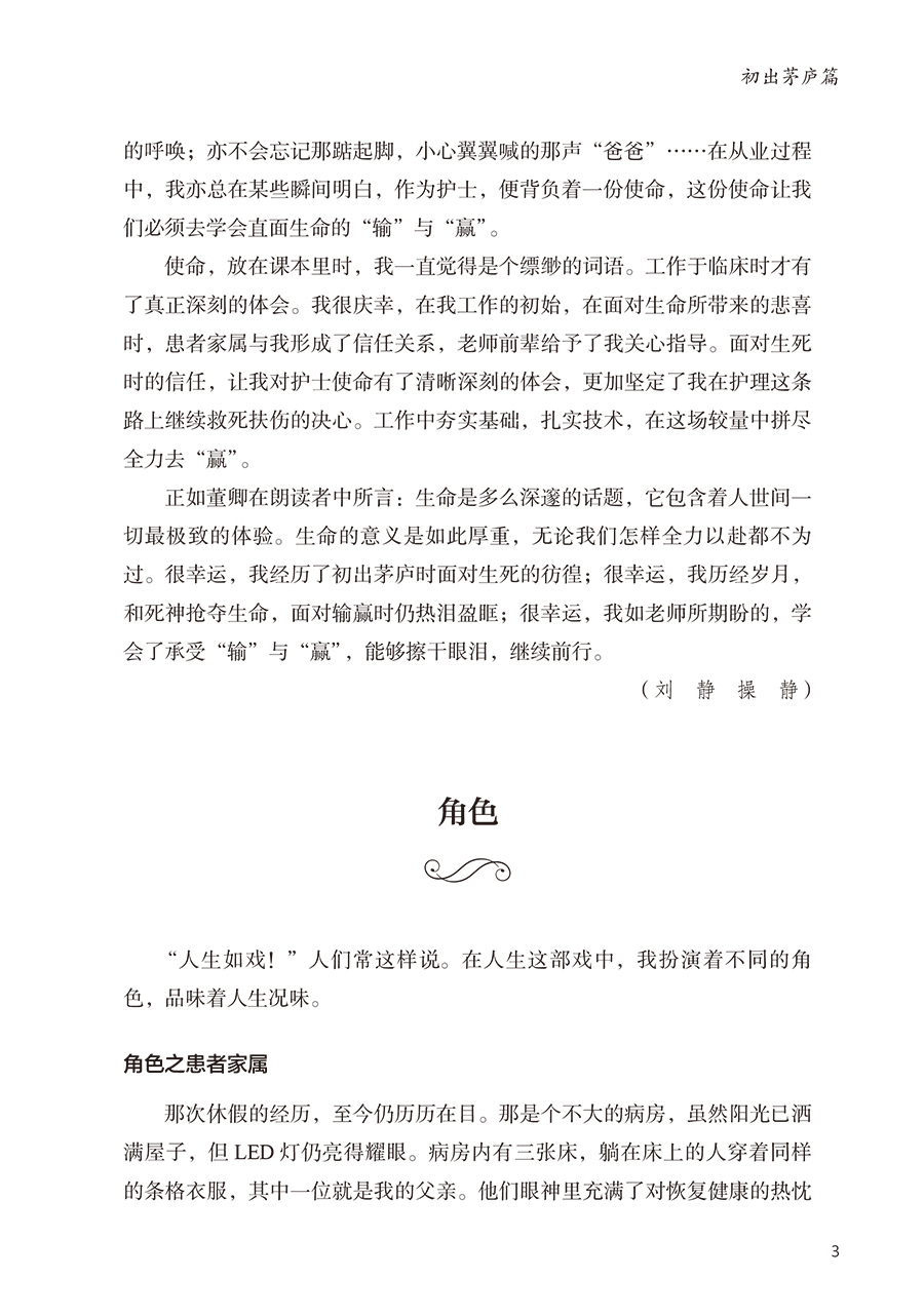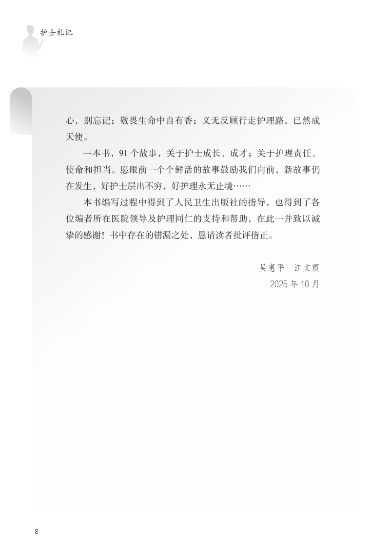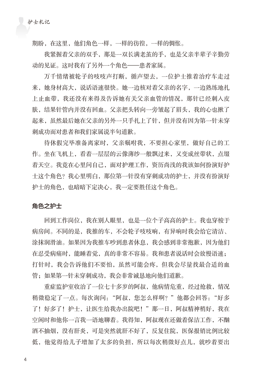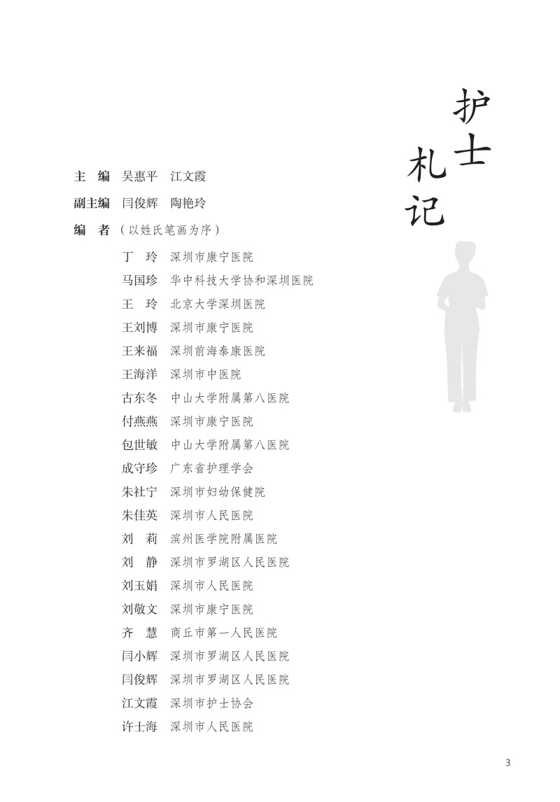 本书以护士职业生涯时间轴为主线,分为初出茅庐、独当一面、成为专家、创新创业故事四个模块。故事内容包括新手护士的成长之路、护士临床见闻及感悟、临床经典案例、援疆援藏护士故事、行业先锋榜样的先进事迹、护士创新创造等,传播给年轻护士有益的启示和激励,记录和宣传行业中的先锋榜样及经典的事迹,弘扬无私、奉献、谨慎、责任、创新等精神内核,同时通过故事展现护士的核心能力,传递临床经验及技能。以点燃广大护士的工作热情,潜移默化地影响其职业态度,增强其职业认同感,提高其职业素养,对护士职业生涯规划起到参考作用。