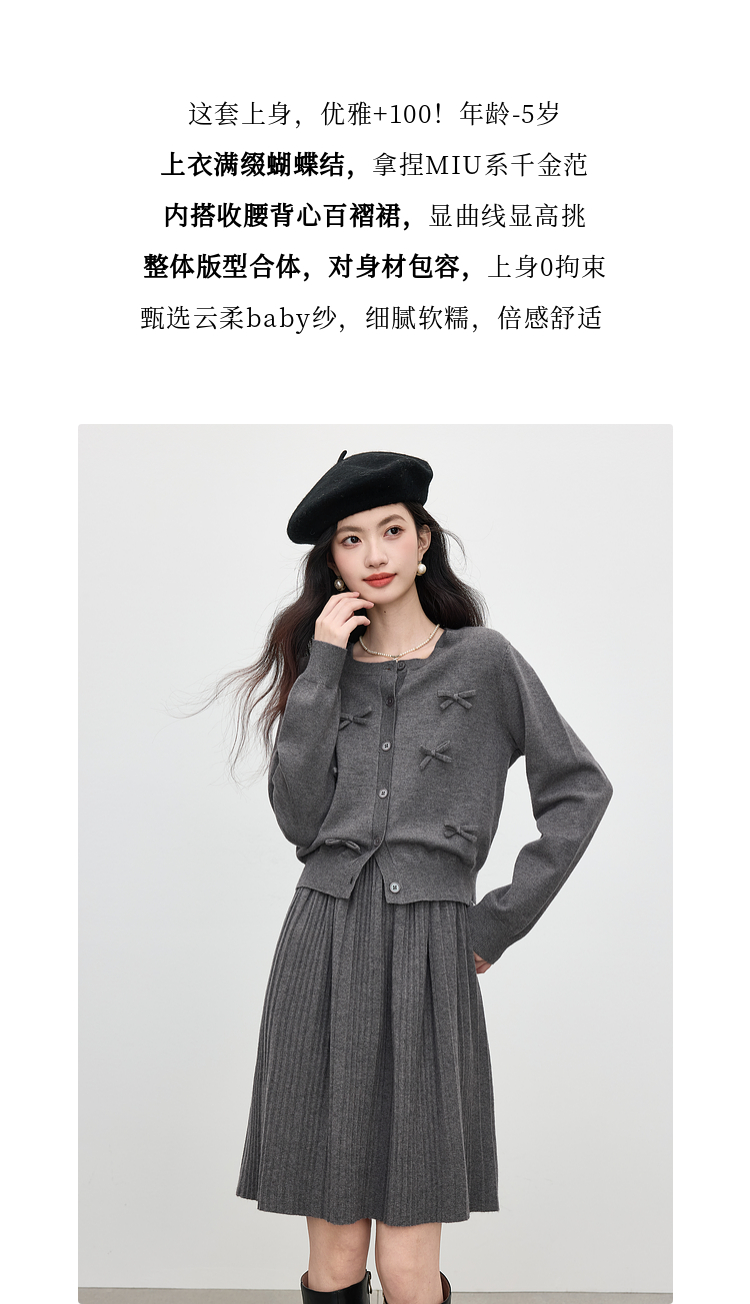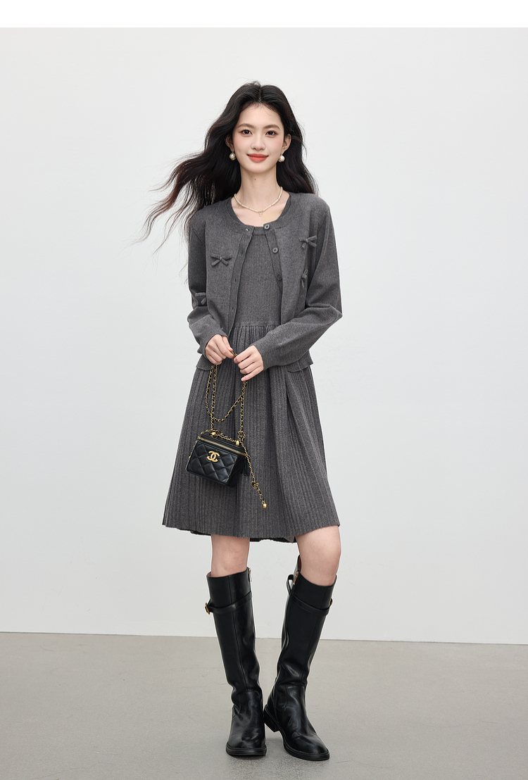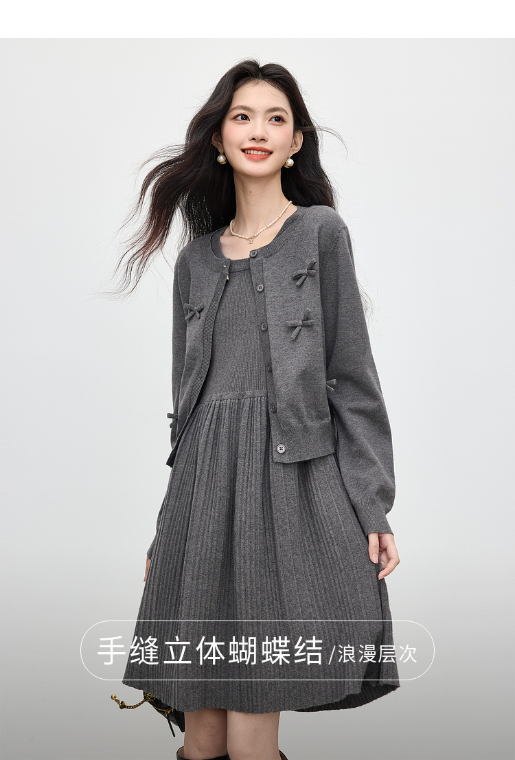【09/03新品】熙世界格雷系灰色针织开衫连衣裙套装女秋季新款毛衣百褶裙两件套
