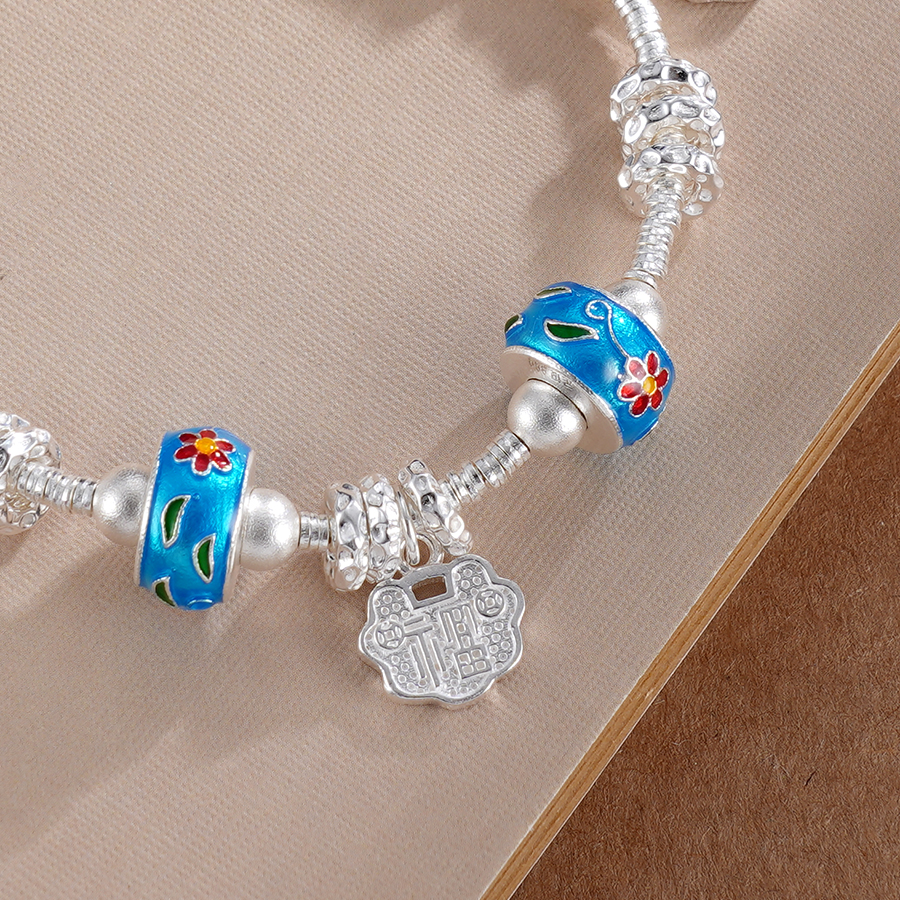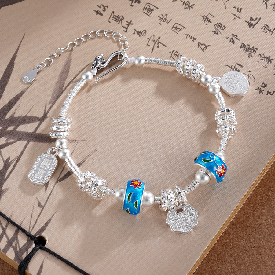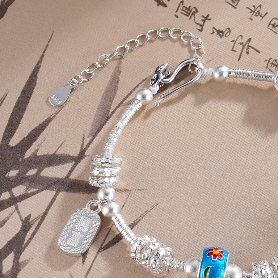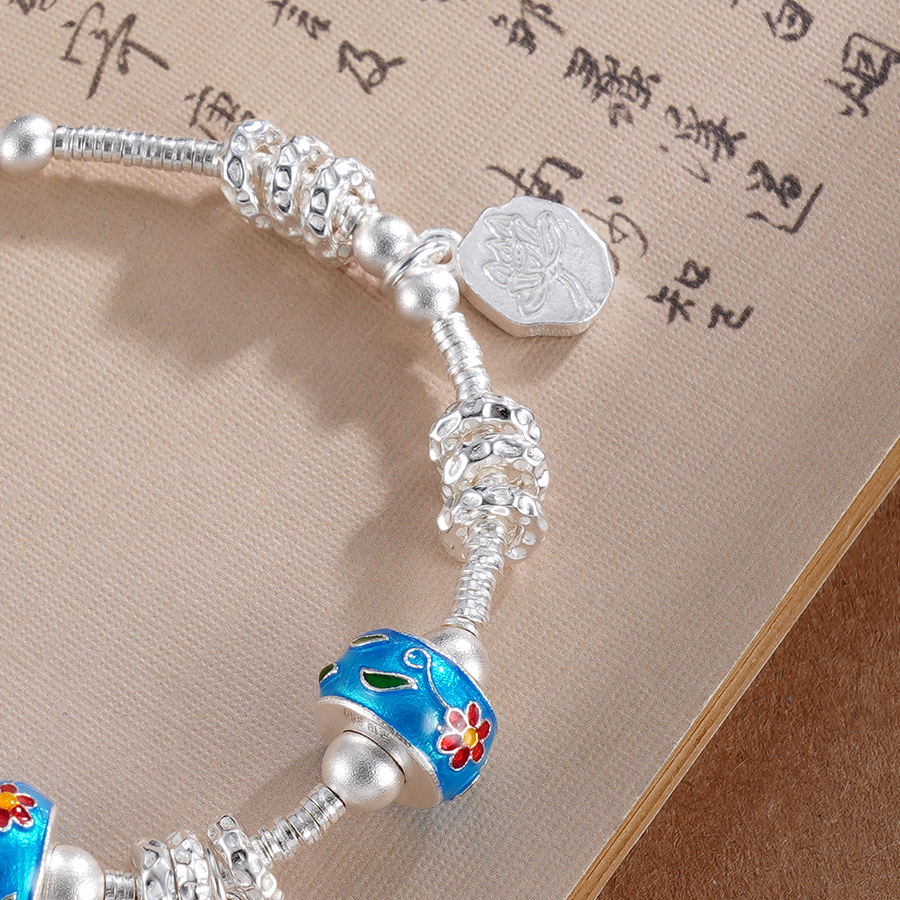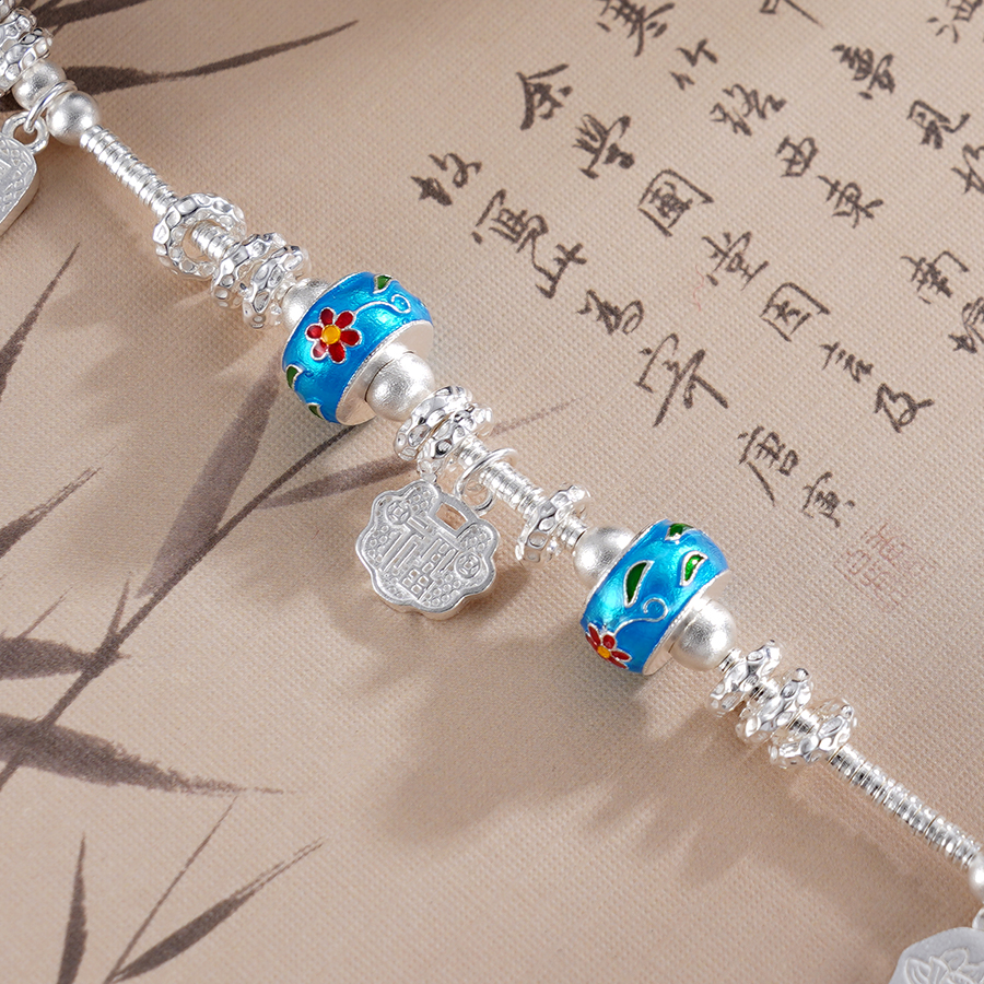 【寓意】:纯银盘缠手串,滚珠之上以珐琅工艺点染花朵,明媚又梦幻。加上如意与莲花的点缀,可谓传统元素满满。寓意祥瑞美好,清雅喜悦。