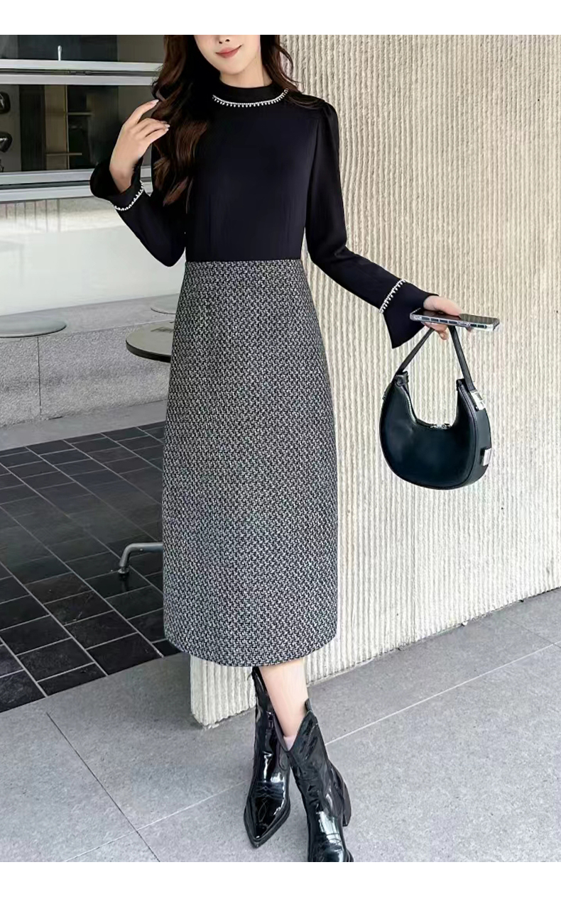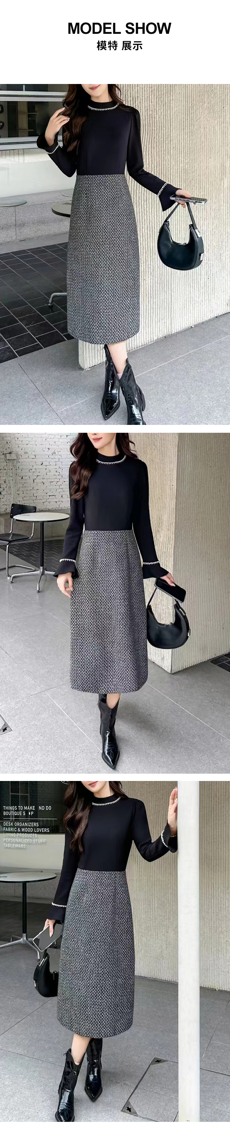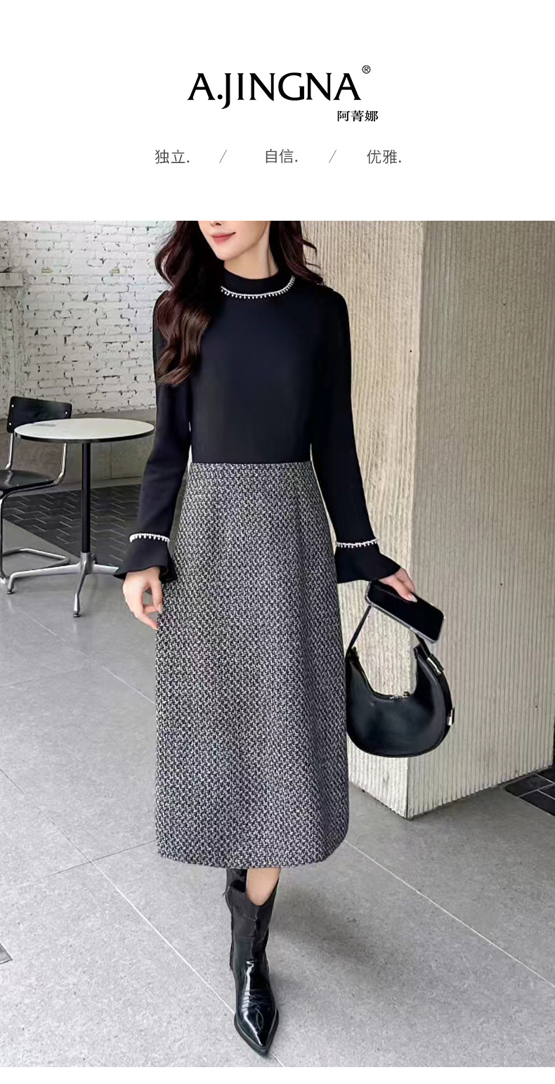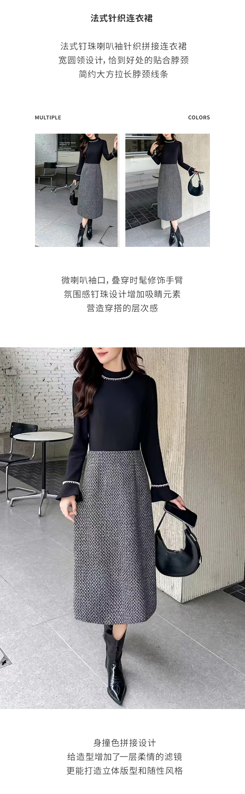 【法式钉珠】阿菁娜冬季新款法式钉珠连衣裙喇叭袖撞色拼接设计F30D212005