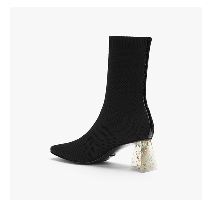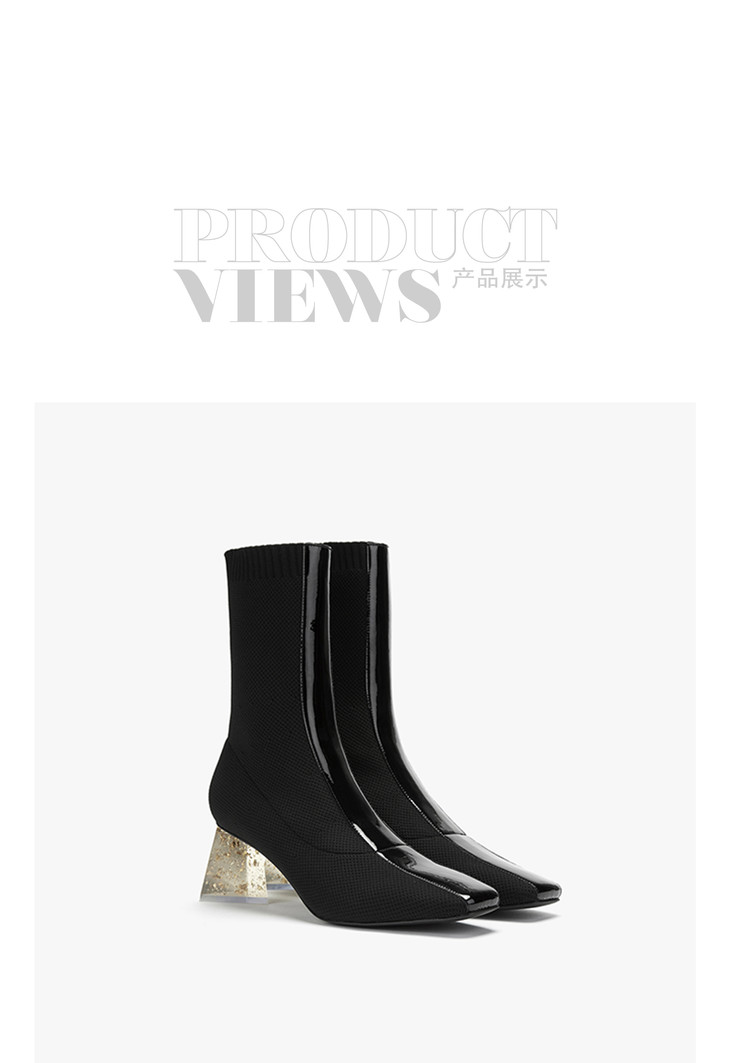 lost in echo2020秋季新款黑色飞织女靴 三角金箔水晶跟漆皮短靴女鞋