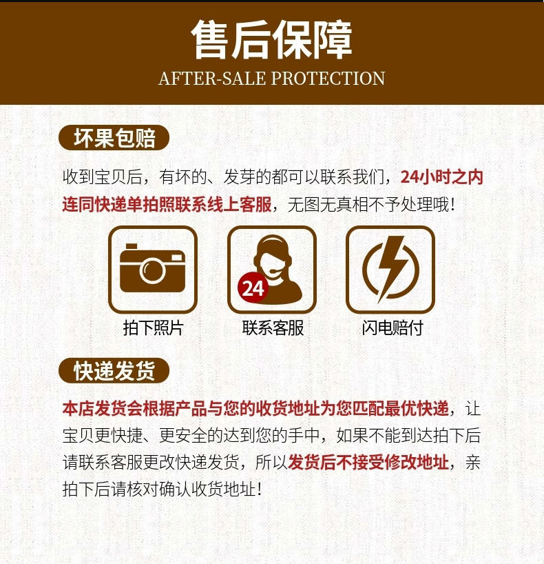 2、请自产品签收起12小时内反馈售后,逾期不接受售后,自行负责。 3、售后必须提供快递面单,否则不予处理。个人口感不在售后范围,地址错误,电话不通不接,拒收,超时签收都不售后,不接受者勿拍。 |
