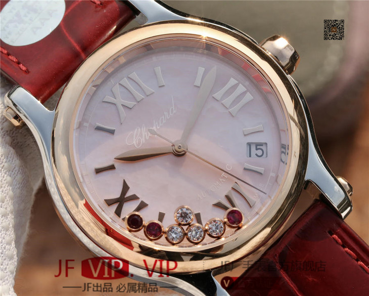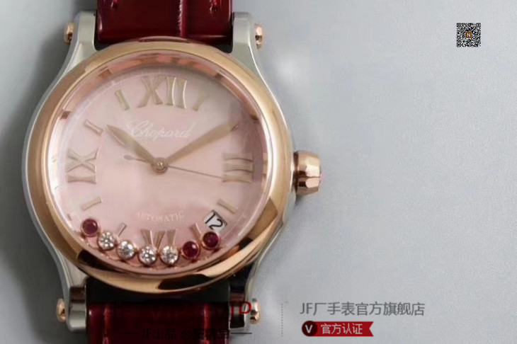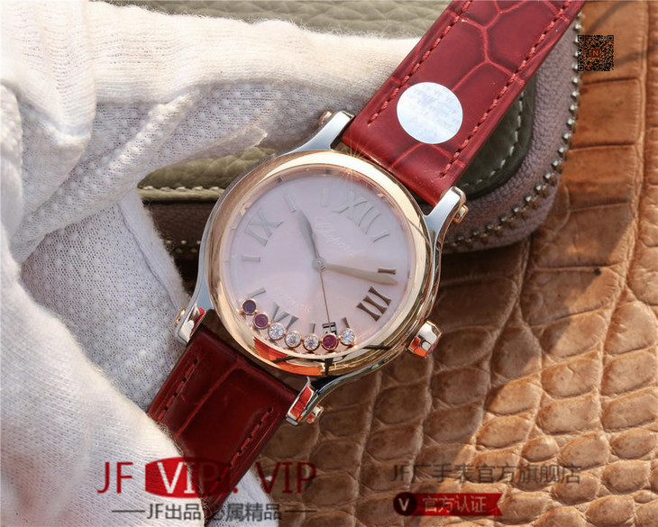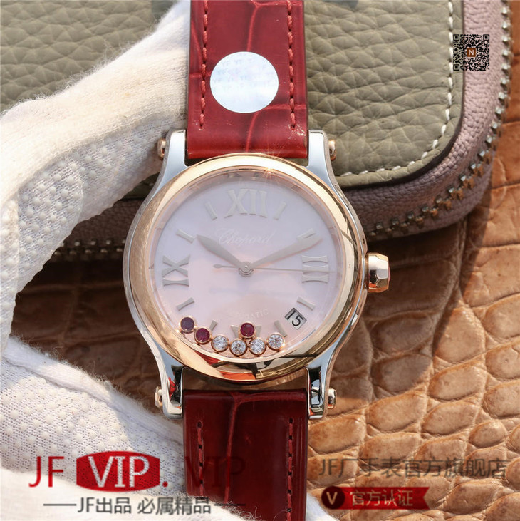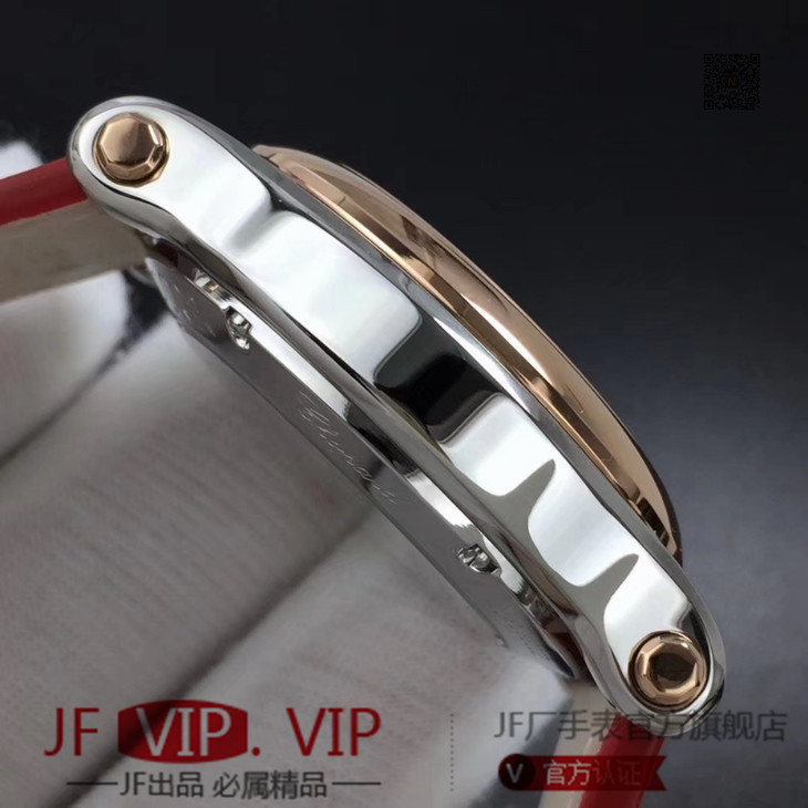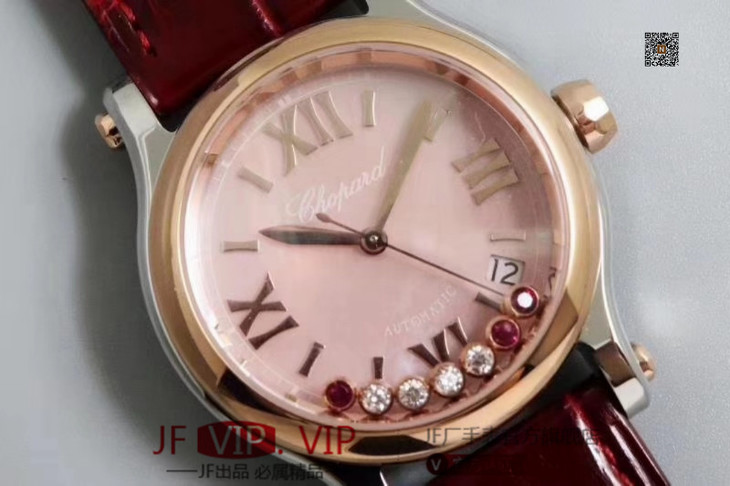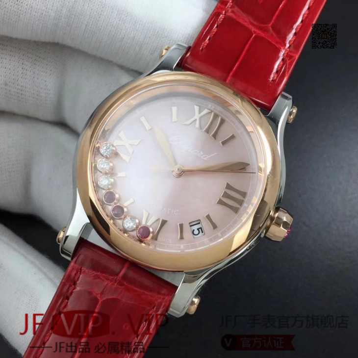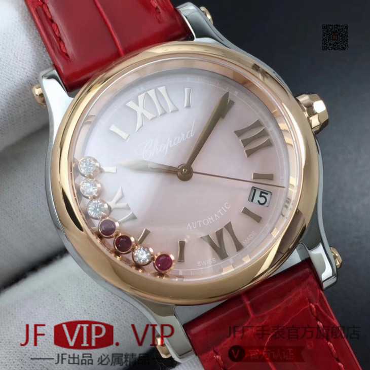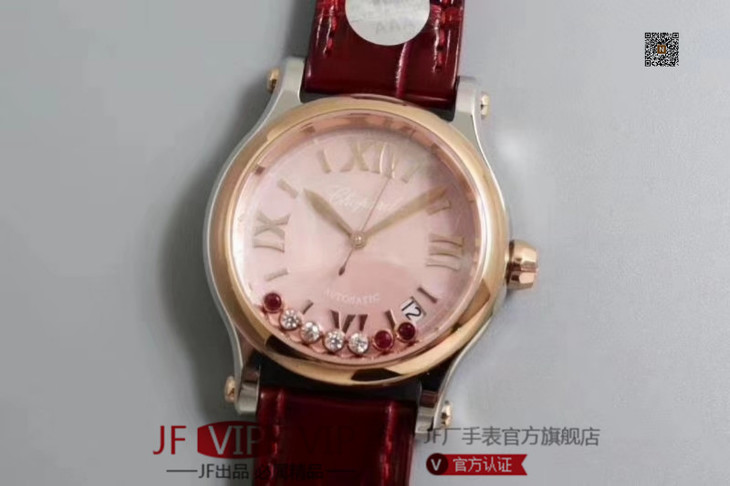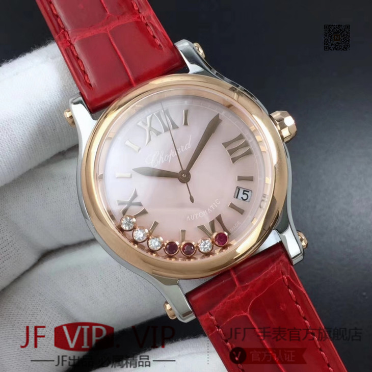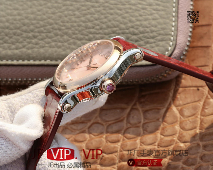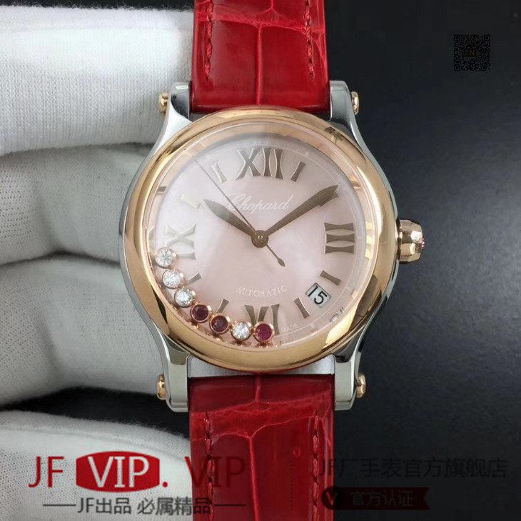 YF萧邦30周年特别款。女士腕表,皮表带,自动机械机芯,透底。与旧款有所不同镜面换了三颗红宝石最特别的是侧面调时把采用了粉色宝石—璀璨宝石灵动飞舞 释放腕间风华 铭记情人间 每一刻的美好悸动。