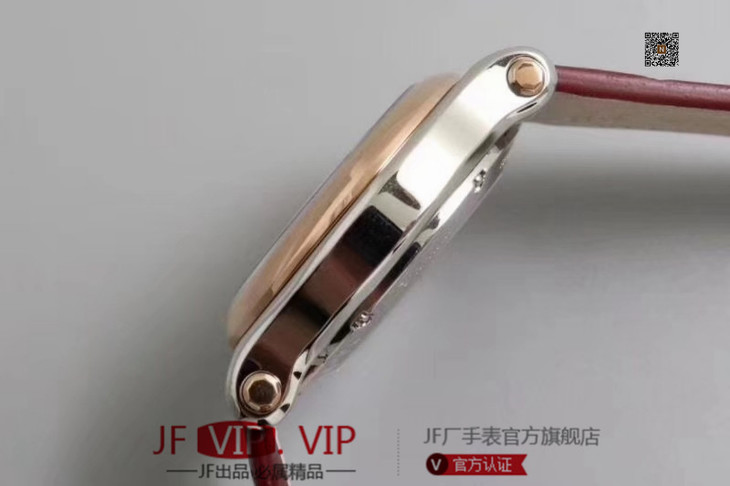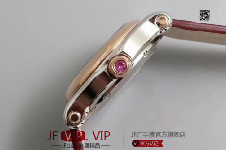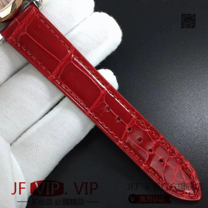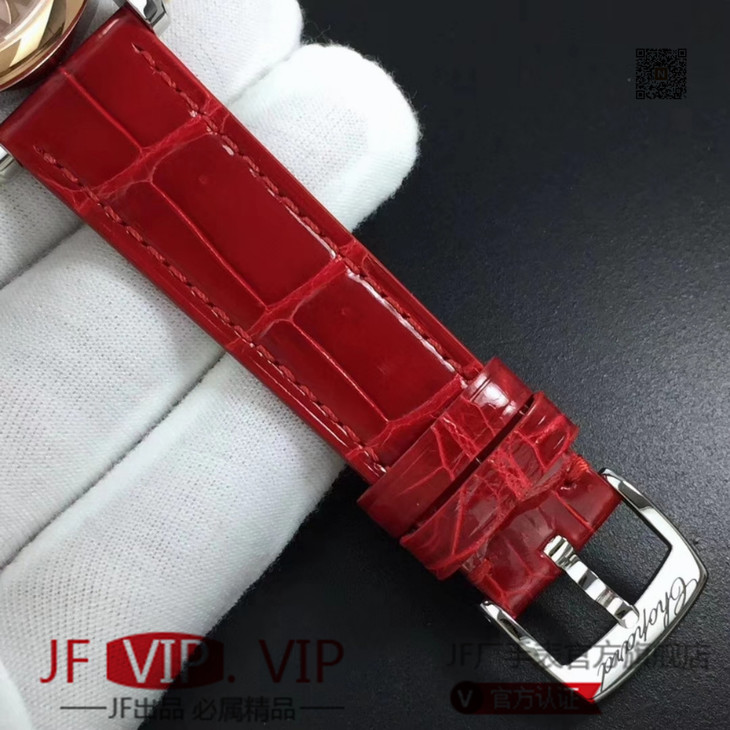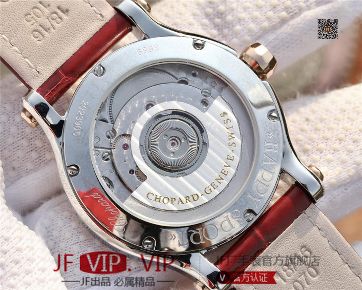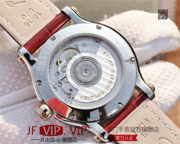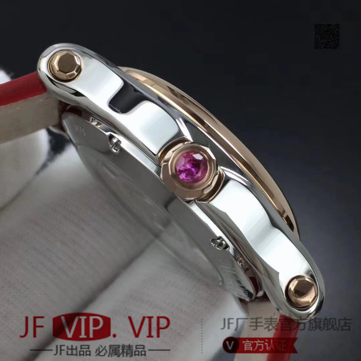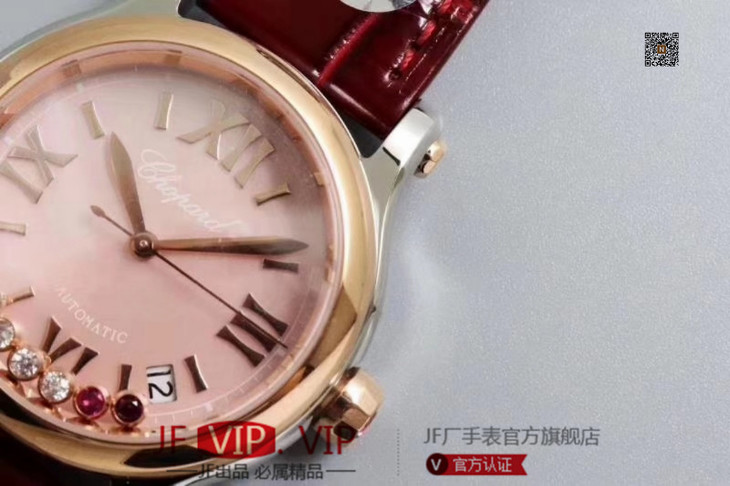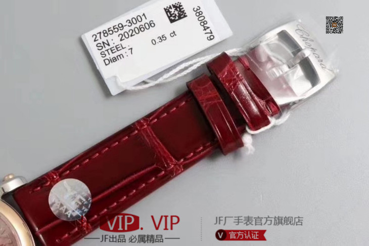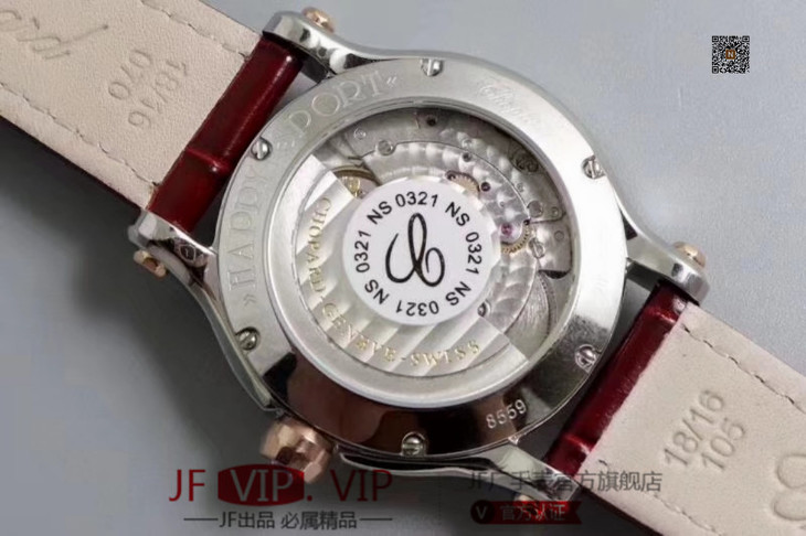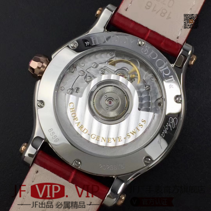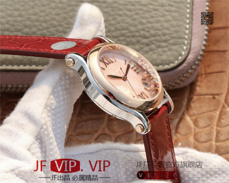 YF萧邦30周年特别款。女士腕表,皮表带,自动机械机芯,透底。与旧款有所不同镜面换了三颗红宝石最特别的是侧面调时把采用了粉色宝石—璀璨宝石灵动飞舞 释放腕间风华 铭记情人间 每一刻的美好悸动。