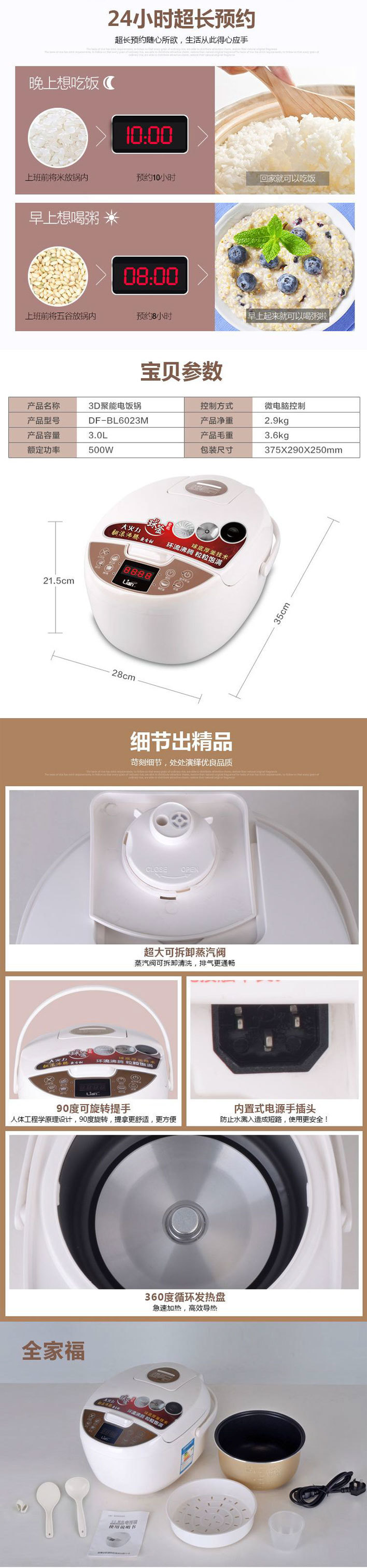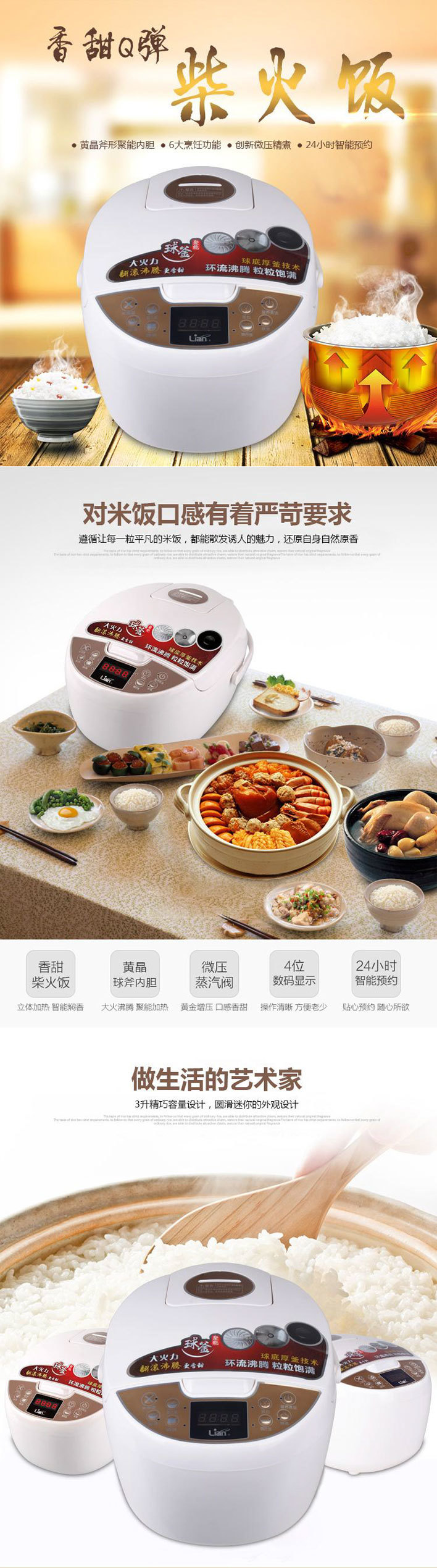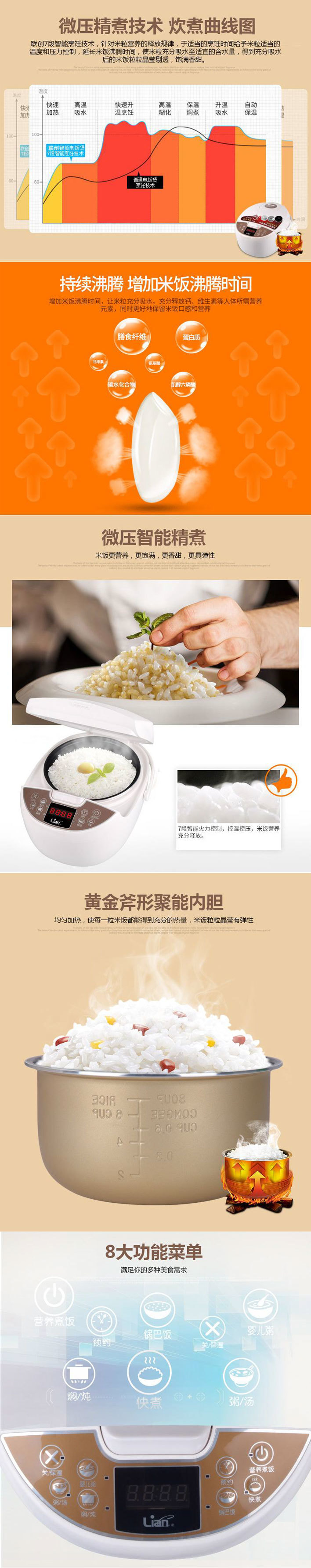 Lian联创 3D聚能电饭煲 聚能内胆 8大功能 500W 3L容量 白色