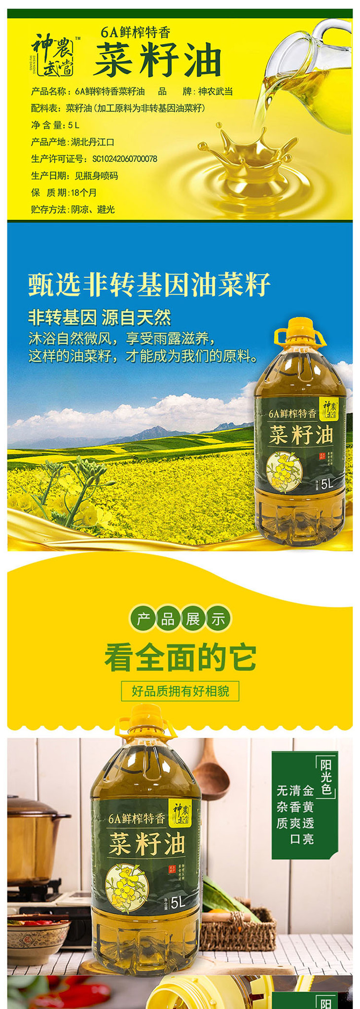 丹江口 神农武当 6A鲜榨特香菜籽油5L/桶 十堰