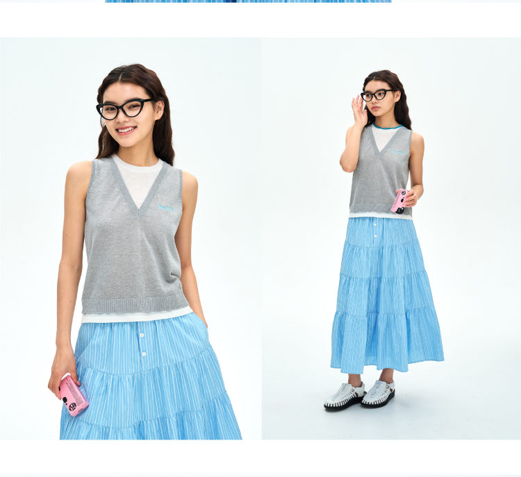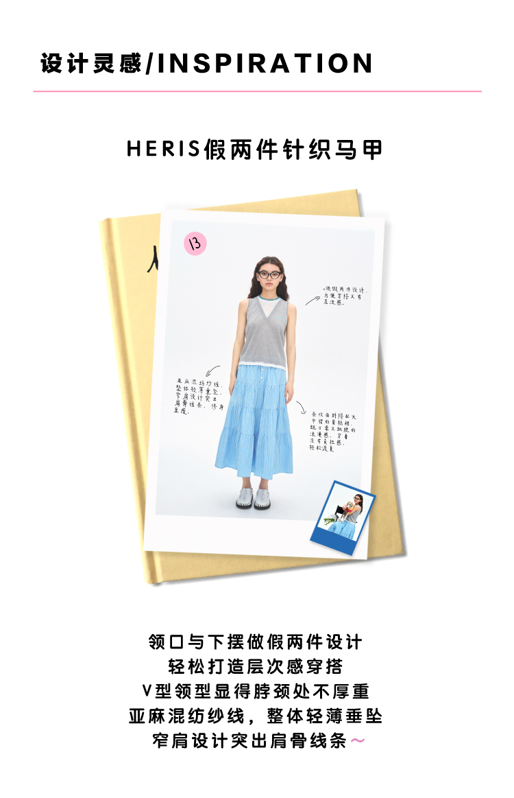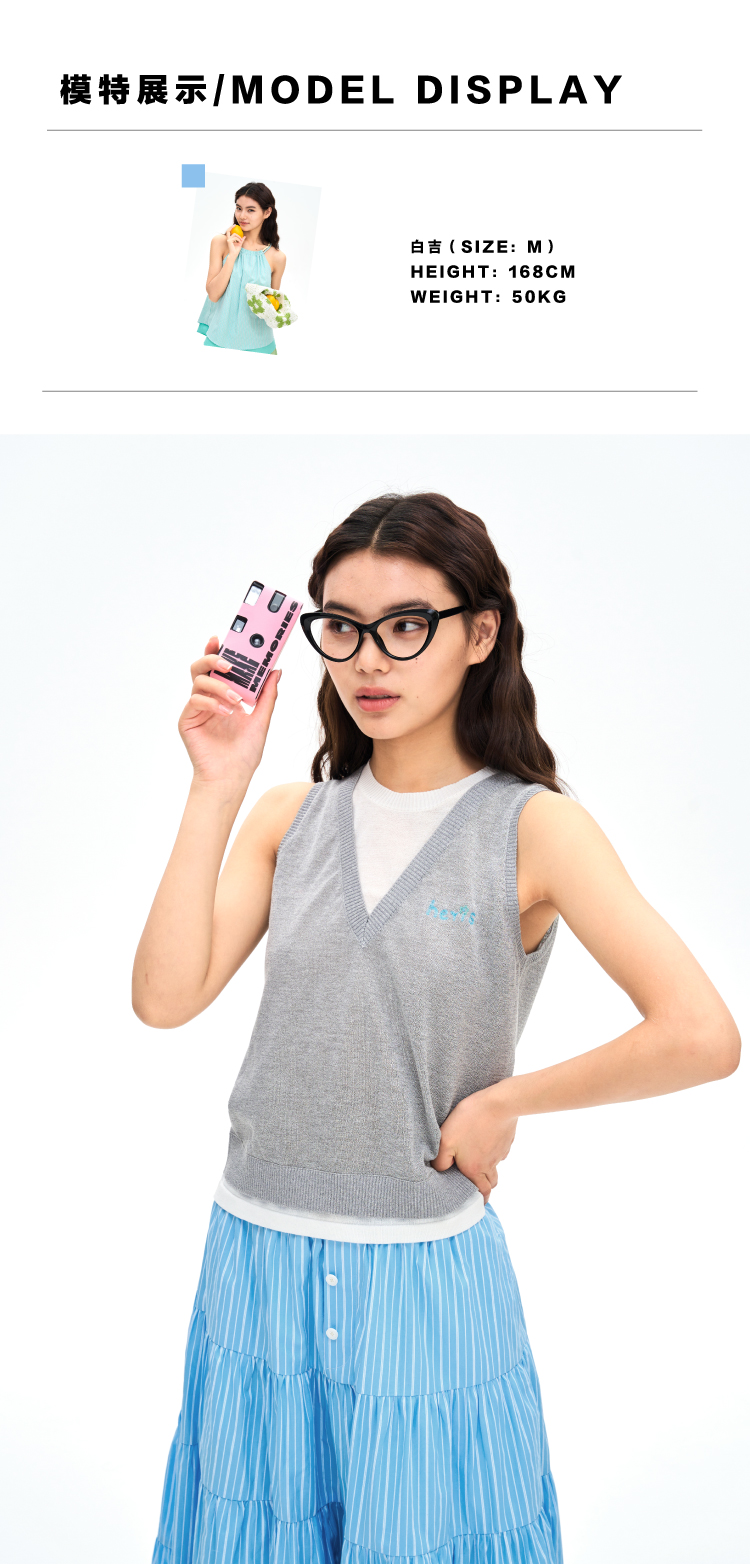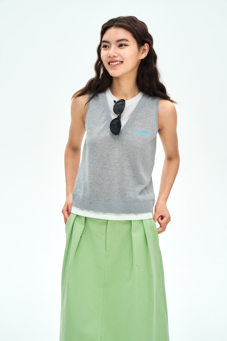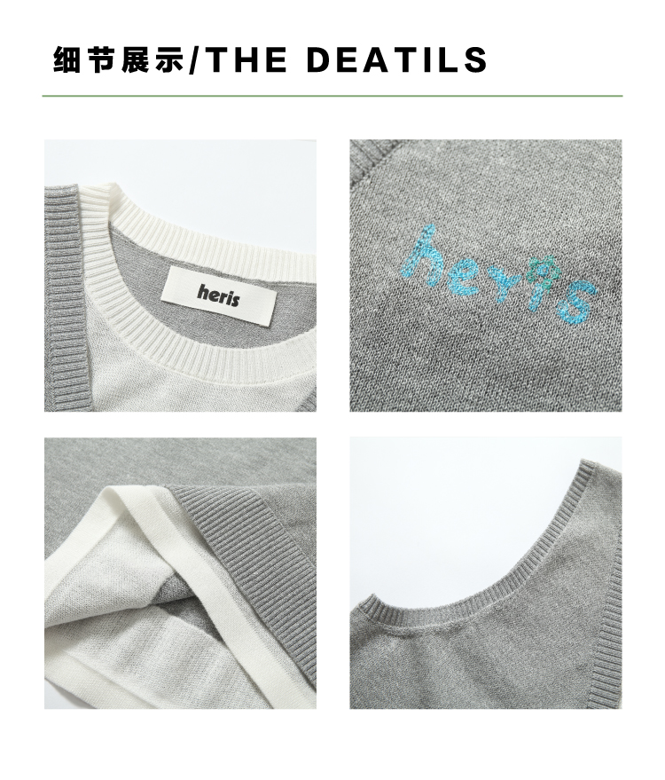 heris/H42122/灰白色假两件设计 亚麻混纺凉感纱线 V领叠穿针织马甲