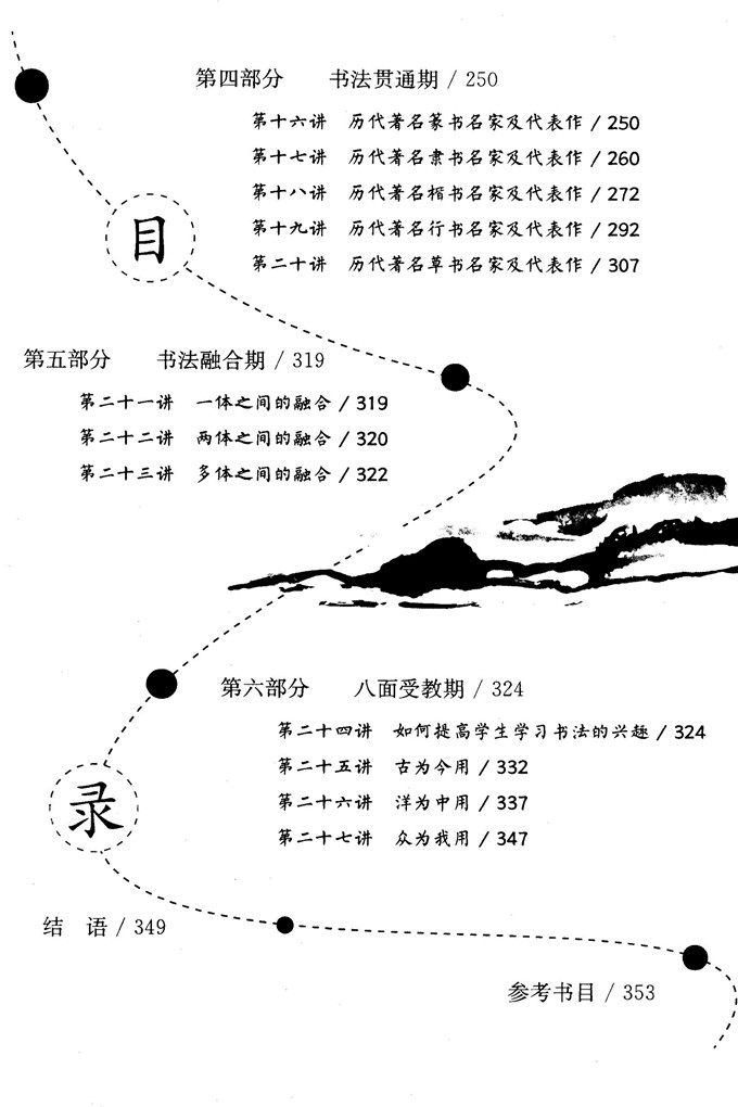 第六部分:八面受教期。在教授学生书法技法之外,如何提高他们的学习兴趣,如何让他们更好地吸收书法艺术的营养,这是教师需要关注的问题。本部分旨在指导学生注重字外功夫。除了提供一些可提高学生书法兴趣的方法外,还介绍了古代书法理论、西方现代学习理论在书法教学中的运用及其他相关艺术门类等对书法艺术的影响等内容,意在培养学生关注生活、培养丰富的兴趣点。