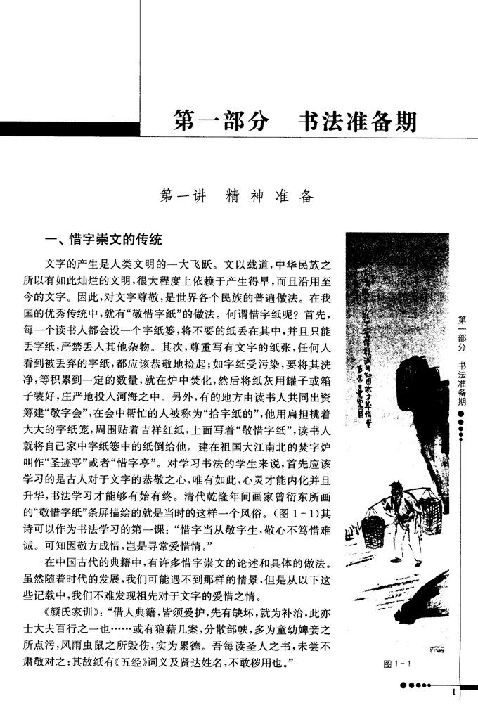 第一部分:书法准备期。主要是让学生对书法及其相关的内容有基本的认识,为学习书法做好准备。