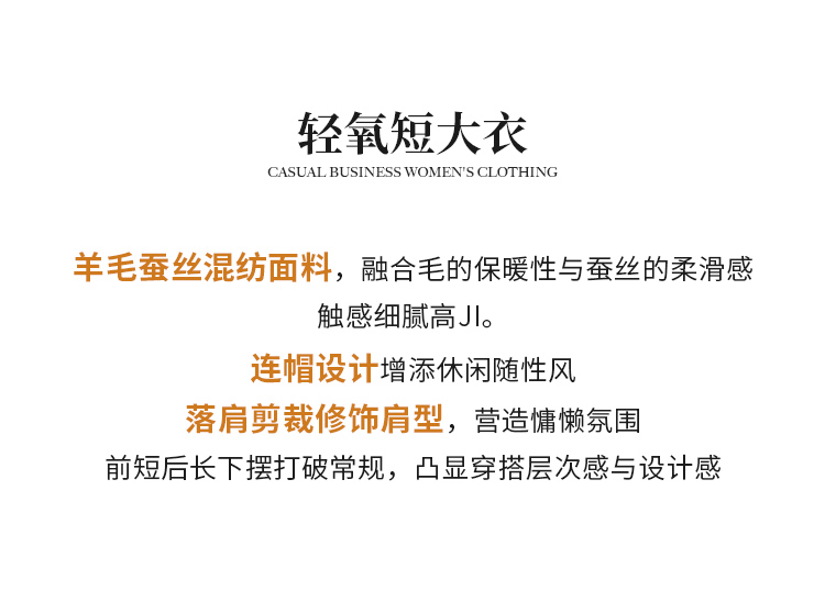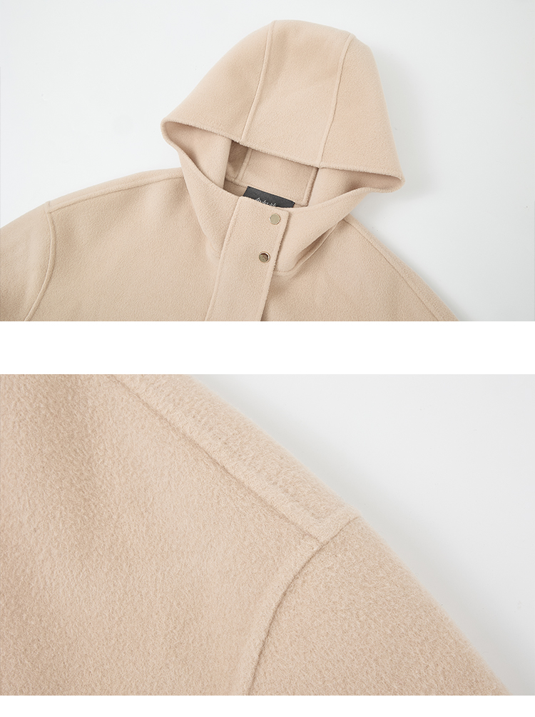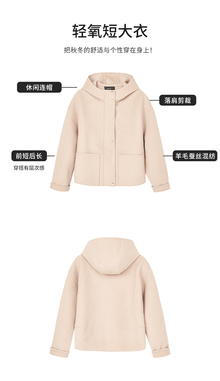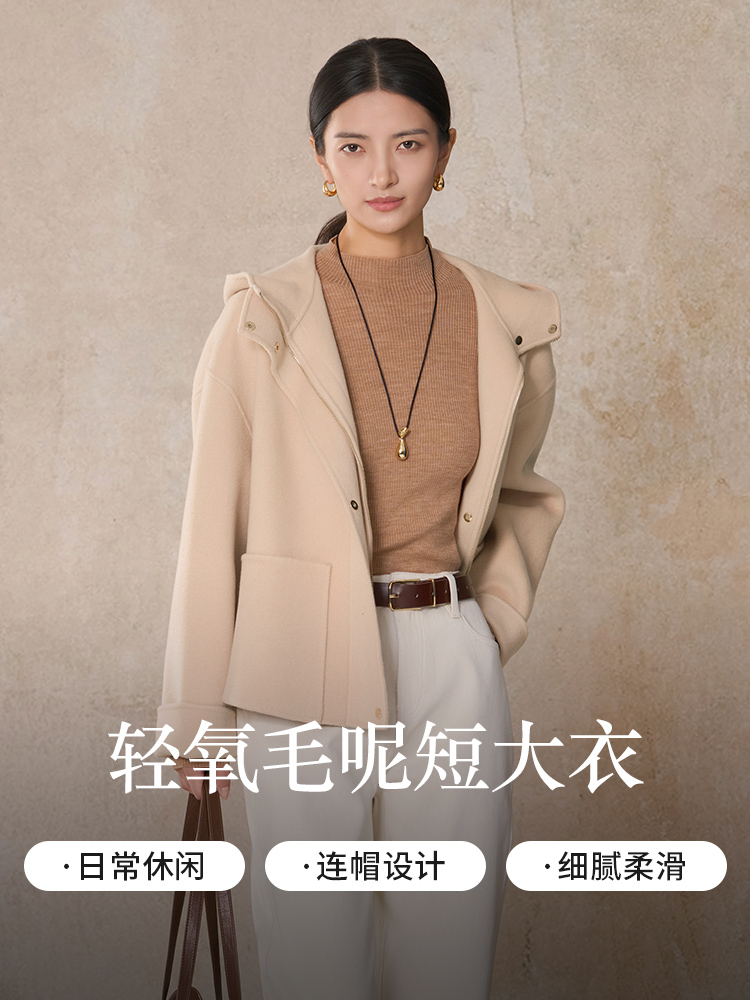 【商场同款】CNC5012 “ 轻氧短大衣 ” 羊毛蚕丝混纺触感细腻高级 驼色连帽短大衣