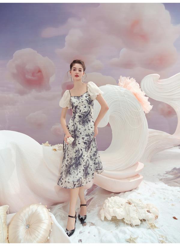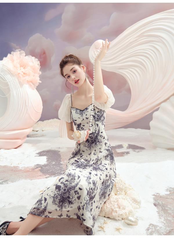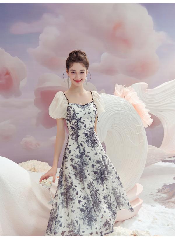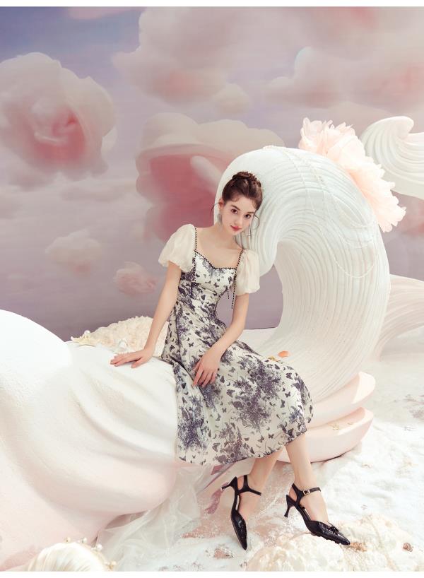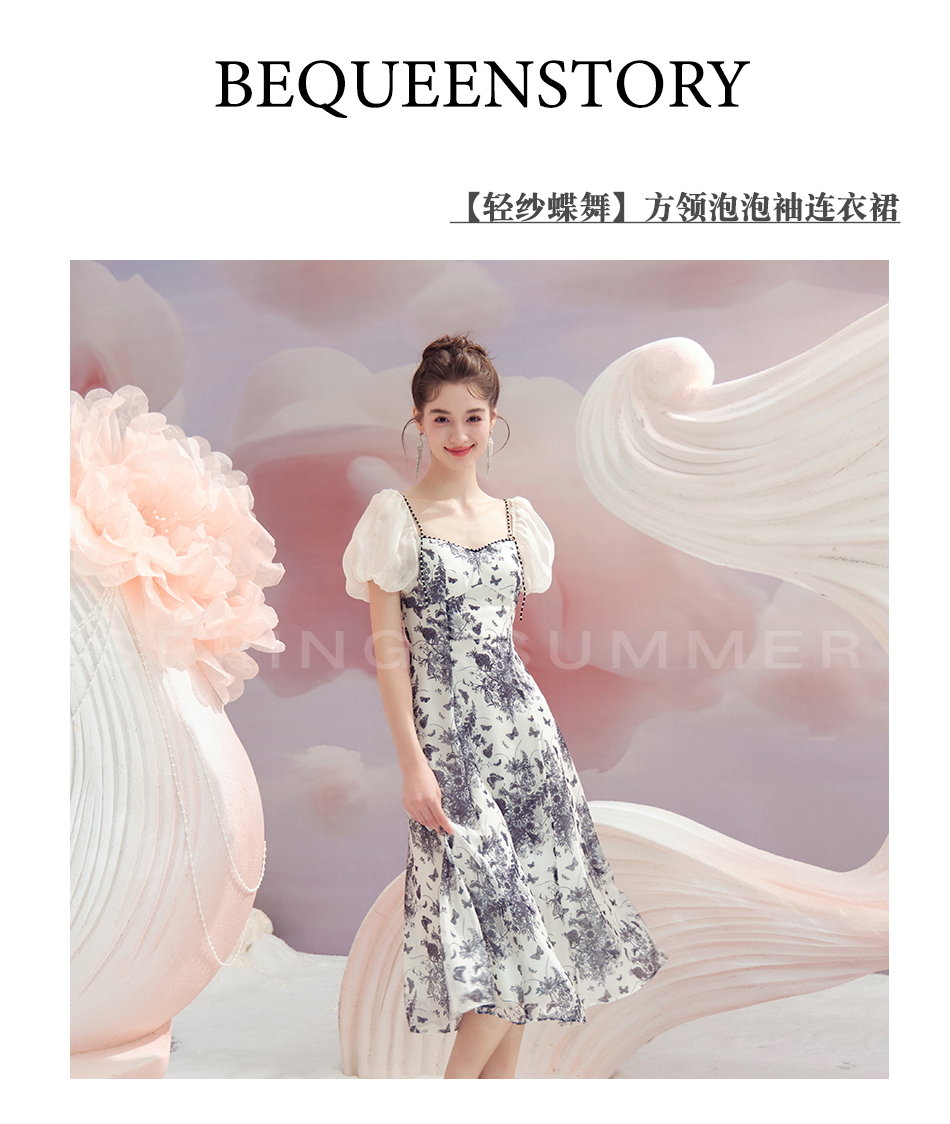 BeQueenStory【轻纱蝶舞】方领泡泡袖显瘦气质连衣裙2023夏季新款