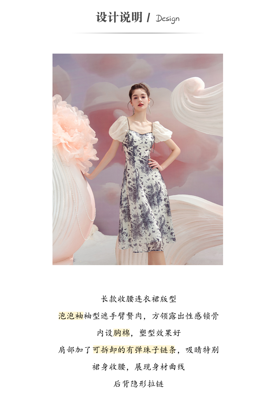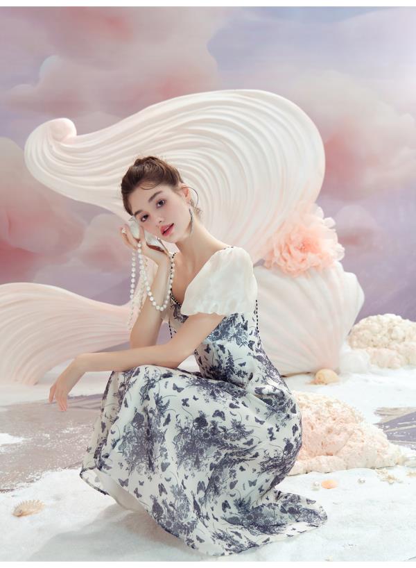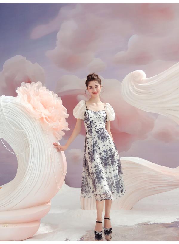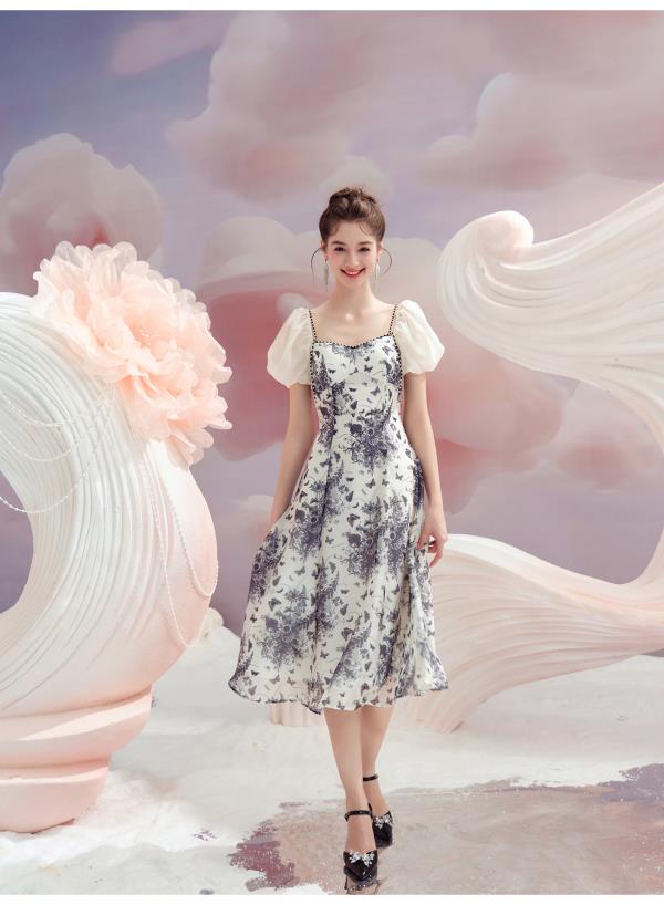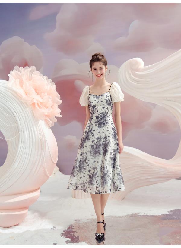 BeQueenStory【轻纱蝶舞】方领泡泡袖显瘦气质连衣裙2023夏季新款
