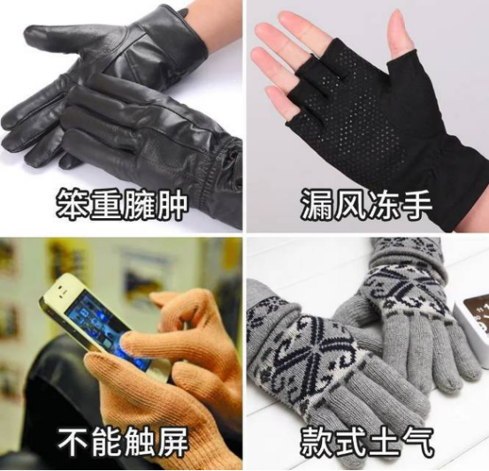 ❌传统手套槽点太多了:露指的不保暖、保暖的又丑又笨重,重要的是还没有触屏功能,真的都很难用···