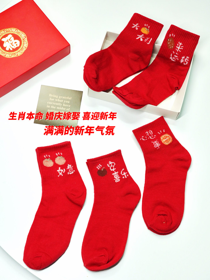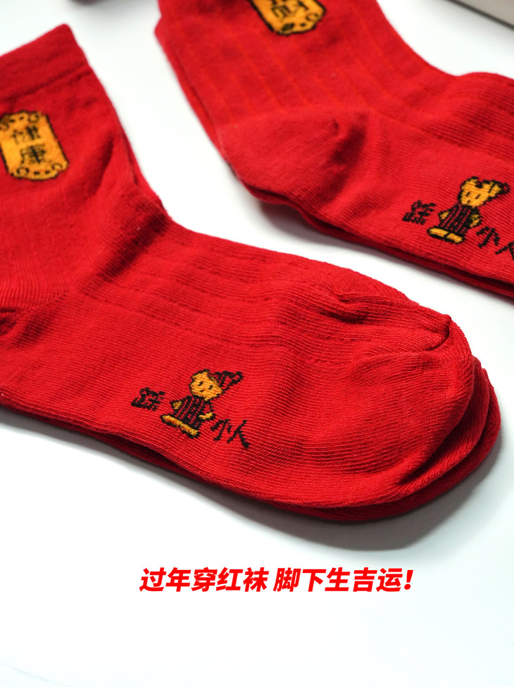 穿上这双开运年袜在脚下生吉运 则如意安康,动中求吉 过年穿年袜,好运一整年 年袜都是要买的,何不买双具有美好寓意的 让你鸿运吉祥,好运连绵 中筒设计,吉祥图案刚好在脚踝上面一点,吉祥外露,运势滚滚而来,忙活一年打打牌,摸摸麻将,手气都比别人好。 走访亲友,啃着瓜子唠嗑拜拜年,不用担心扛不住开春的湿冷,穿上这双袜子,能把脚踝牢牢包裹,依然十分暖和,又贴心又喜庆