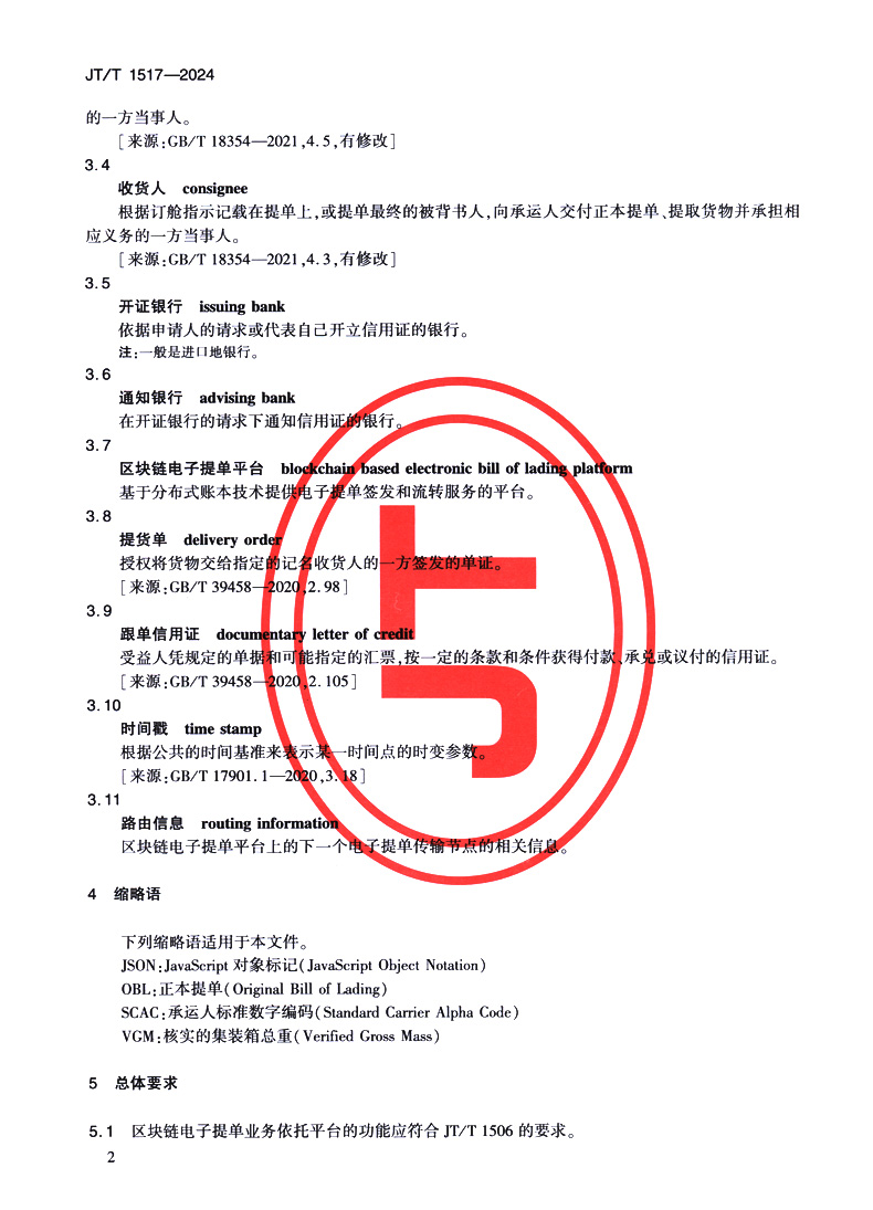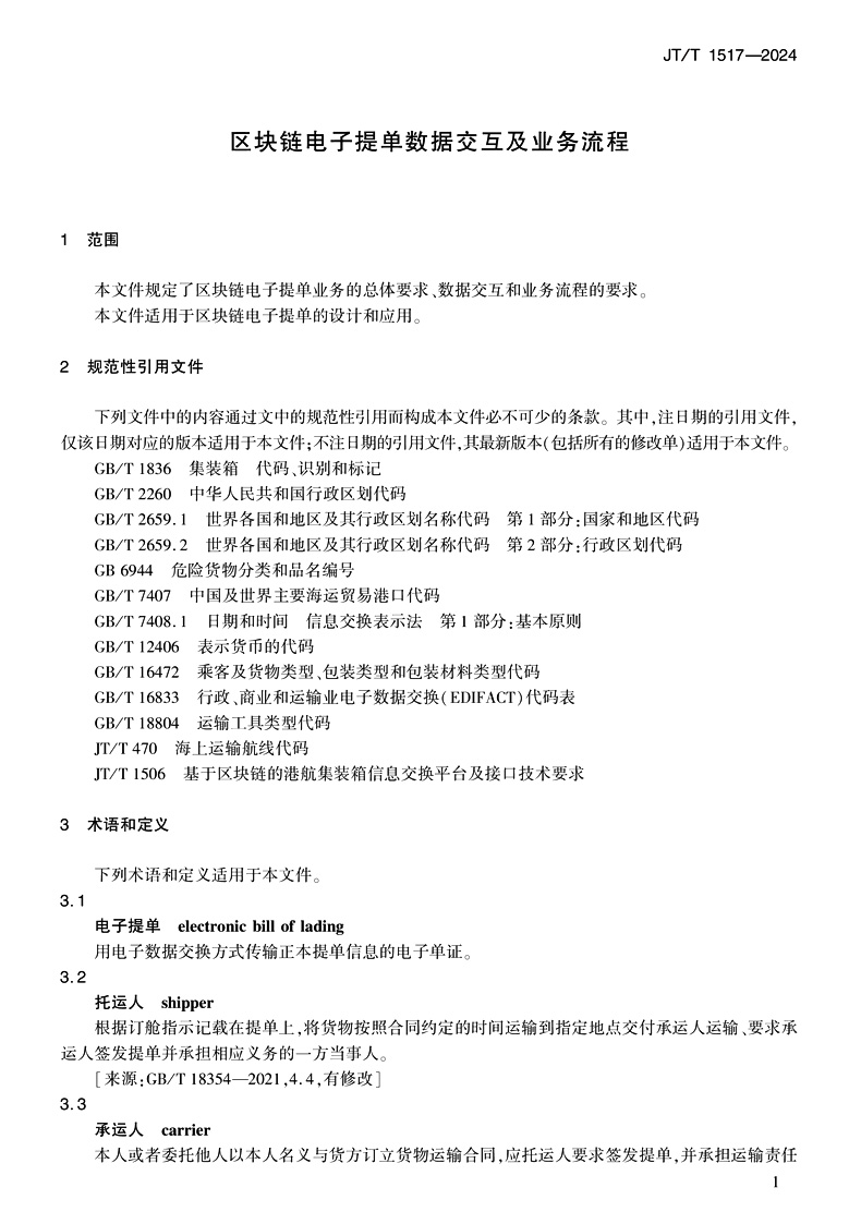 区块链电子提单数据交互及业务流程(JT/T 1517—2024)