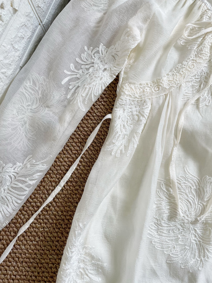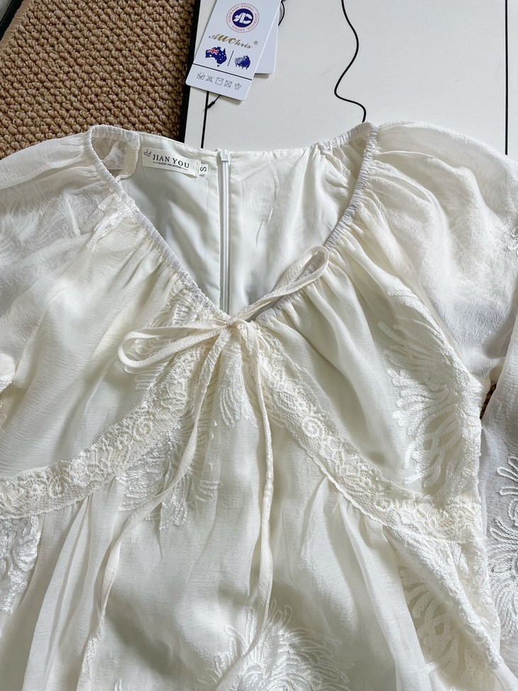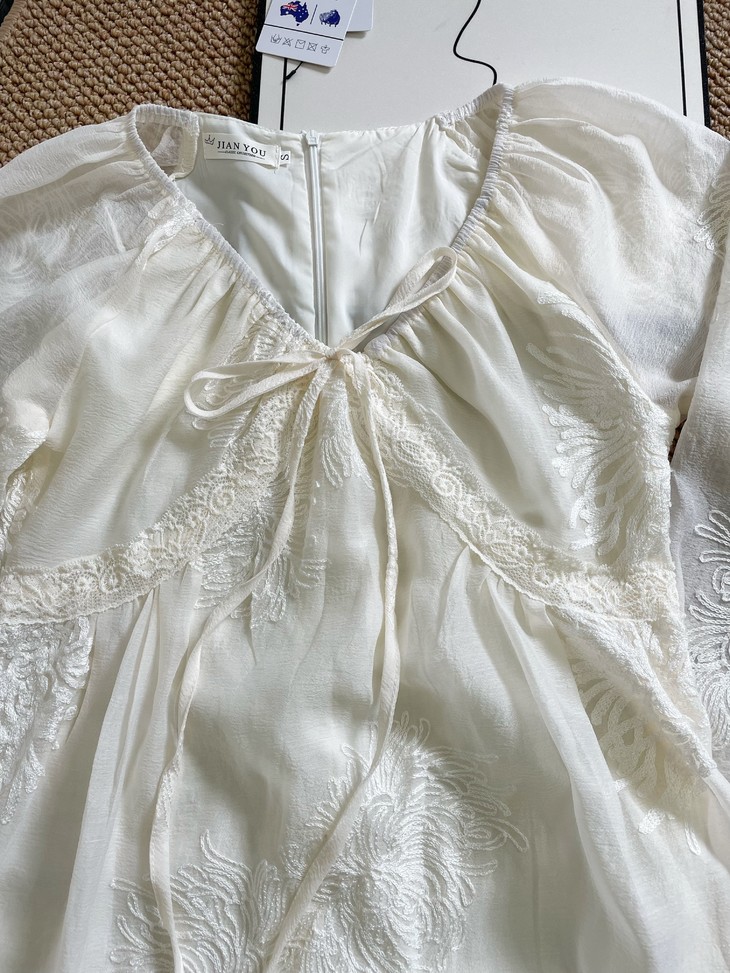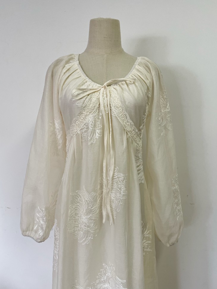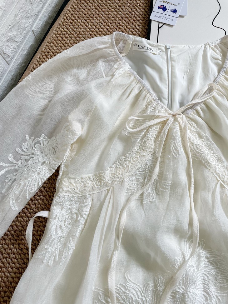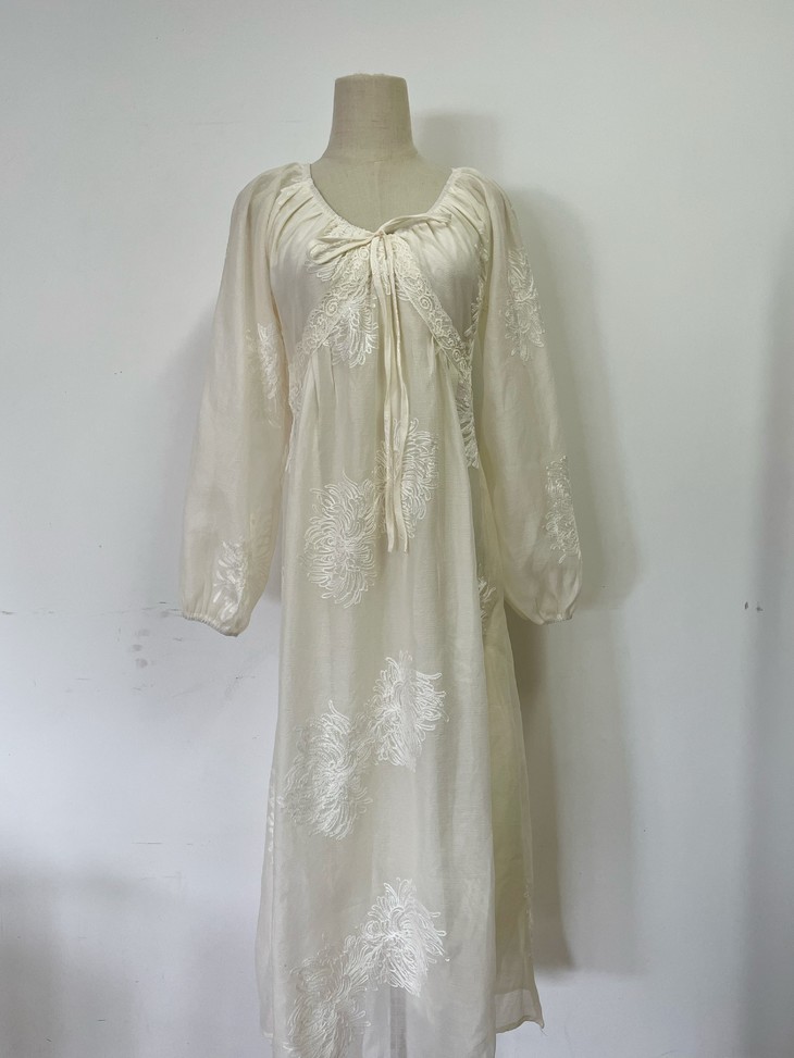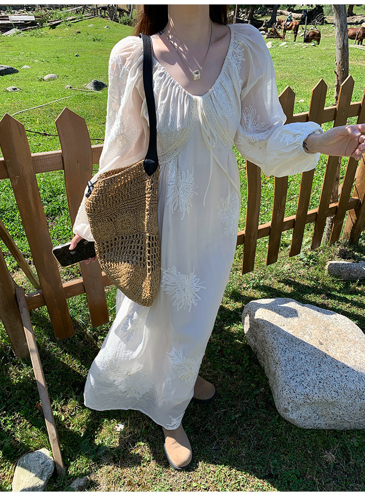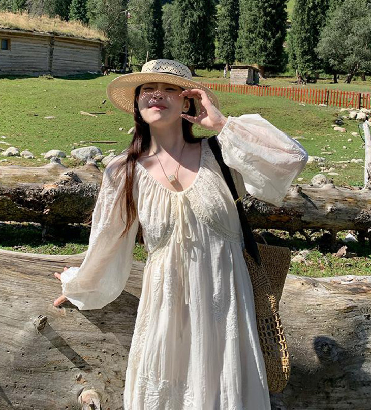 被追问 800 遍的神仙连衣裙找到了! 融合了 “仙气” 与 “实穿” 的宝藏裙子 让你在初秋,美得像从莫奈画里走出来的女主角 领口深度恰到好处,不会走光但能露出精致锁骨 胸前两道象牙白蕾丝太戳我了!! 不是廉价的网纱,而是带立体花纹的纯棉蕾丝 70%莱赛尔材质在微凉的秋日里简直是神级存在 不同于普通棉麻的僵硬,也不像真丝的娇贵 这条裙子的面料带着一种独特的 “温凉感” 奶白色裙摆在阳光下泛着珍珠光泽 行走时像流动的云朵 刺绣花朵随着步伐轻轻晃动 连风都带着温柔的气息~