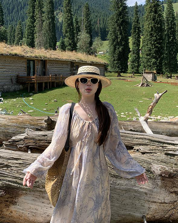 今年挖到的宝藏 TOP1 必须是这条粉紫色天丝裙!! 上周穿去新疆夏塔古道 在雪山溪流间被 12 个陌生小姐姐搭讪要链接 连同行的摄影师都忍不住夸 这颜色简直是为秋天量身定做的 最让我沦陷的是这个配色! 不是俗气的死亡芭比粉 而是把芋泥奶茶和薰衣草紫混合的低饱和色调 裙摆处还藏着若隐若现的灰紫色花纹 像极了秋日傍晚的晚霞~~ 上身美得像从莫奈花园走出来的女主角