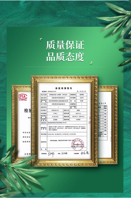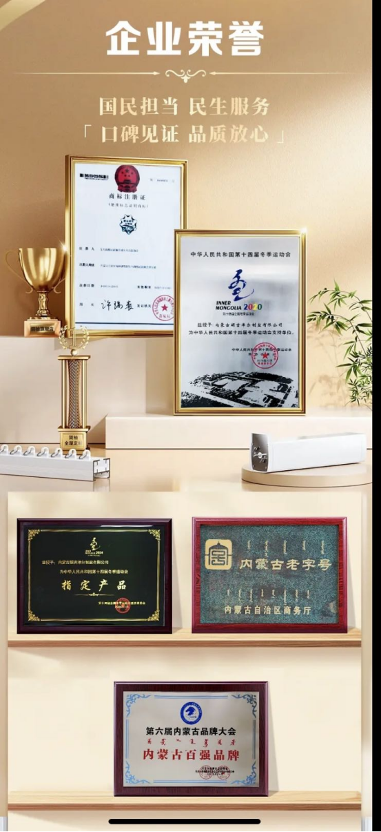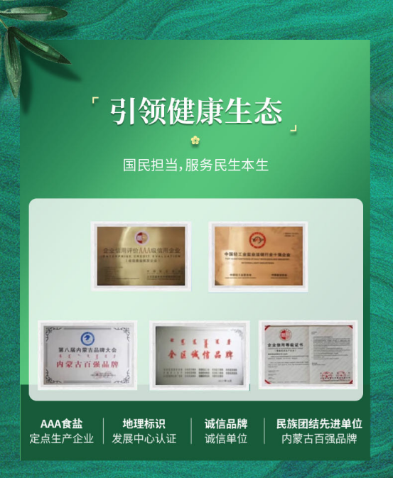 2024年冬运会指定用盐;入选内蒙古百强品牌, 国家盐产品国家地理标志认证产品,老字号品牌V质量检验合格;生态原产地保护。