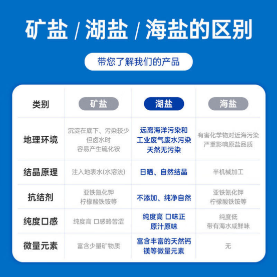 小小的一粒盐,却是我们每天离不开的必需品?那您知道不同的盐有什么区别吗? 我国食用盐产品结构占比: 海盐(10%) 湖盐(3%) 矿井盐(87%) 其中湖盐大多产自内蒙古、新疆、青海等偏远地区,虽然品质上乘,但开采难度和运输成本较高,海盐及井矿盐储备量充足,售价相对便宜。