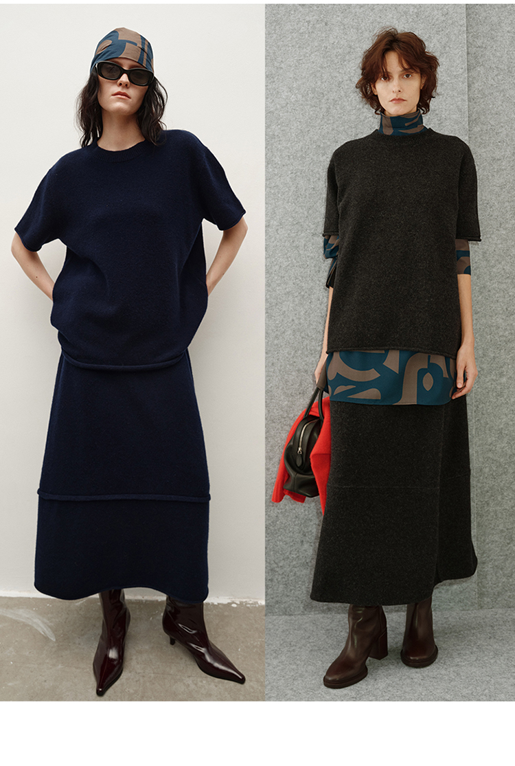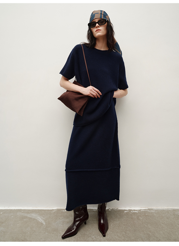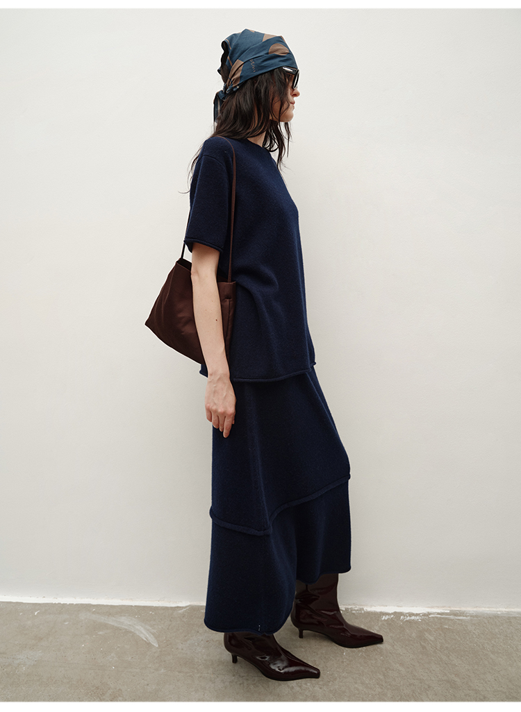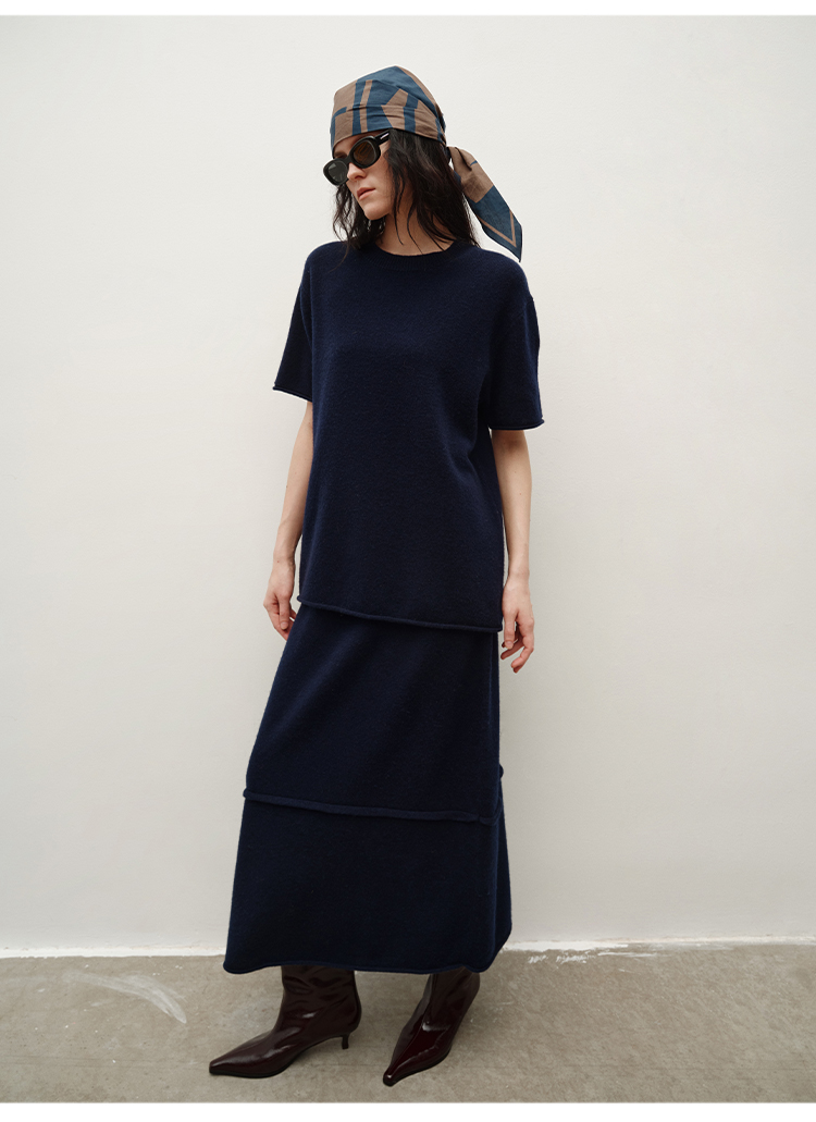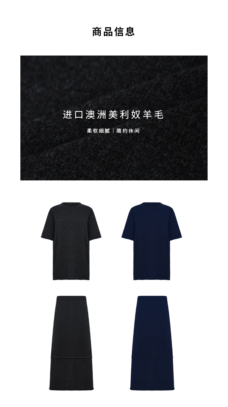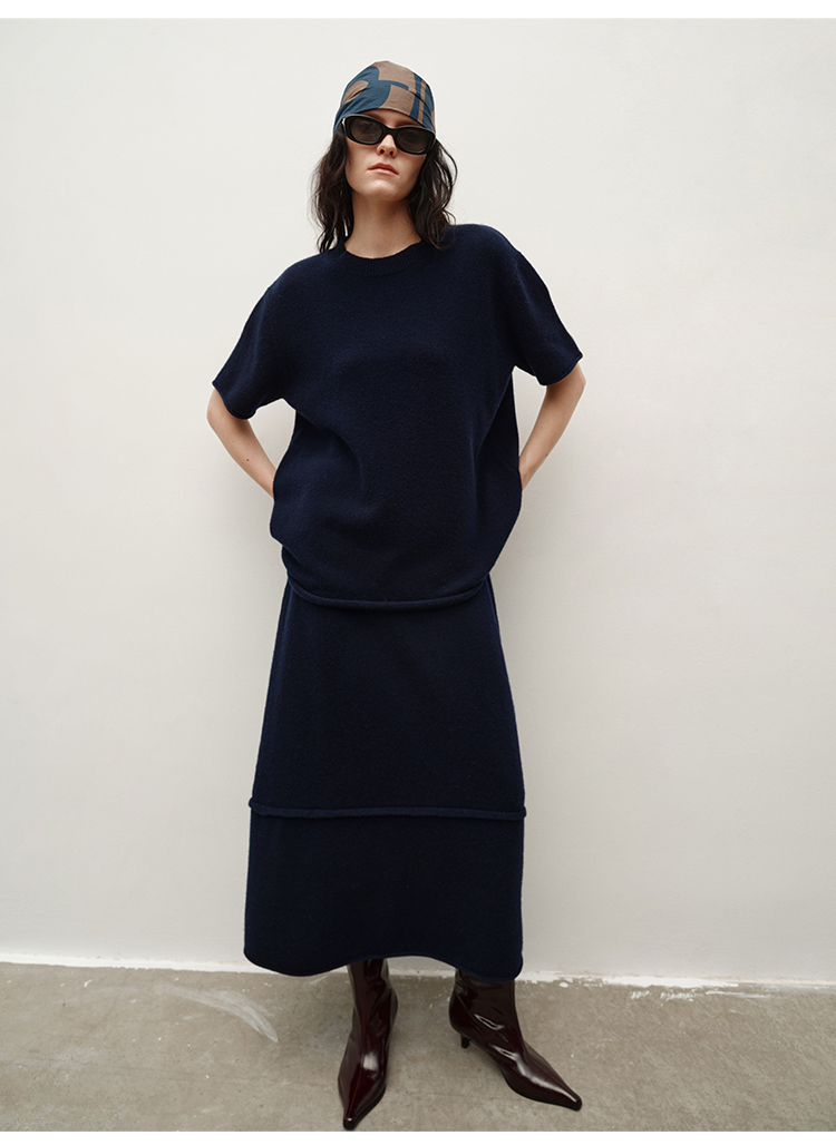 HIDEMI 进口澳洲美利奴羊毛极简廓形卷边设计感圆领套头短袖毛衣半裙套装